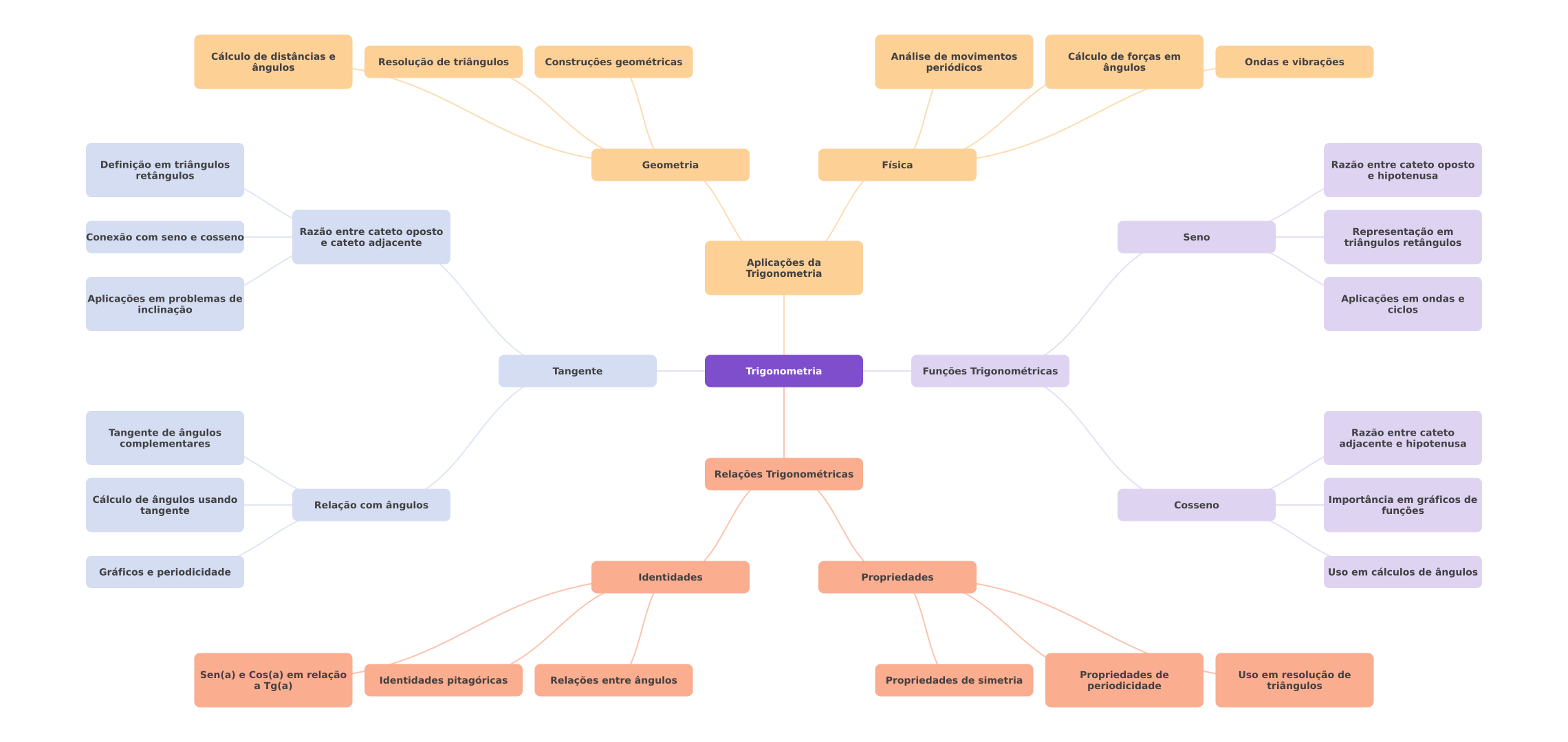 Cálculo de distâncias e Análise de movimentos ângulos Resolução de triângulos Construções geométricas Cálculo de forças em periódicos ângulos Ondas e vibrações Definição em triângulos Geometria Física Razão entre cateto oposto retângulos e hipotenusa Conexão com seno e cosseno Razão entre cateto oposto Seno Representação em e cateto adjacente triângulos retângulos Aplicações da Trigonometria Aplicações em problemas de Aplicações em ondas e inclinação ciclos Tangente Trigonometria Funções Trigonométricas Tangente de ângulos Razão entre cateto complementares adjacente e hipotenusa Relações Trigonométricas Cálculo de ângulos usando Relação com ângulos Cosseno Importância em gráficos de tangente funções Gráficos e periodicidade Identidades Propriedades Uso em cálculos de ângulos Sen(a) e Cos(a) em relação a Tg(a) Identidades pitagóricas Relações entre ângulos Propriedades de simetria Propriedades de Uso em resolução de periodicidade triângulos
