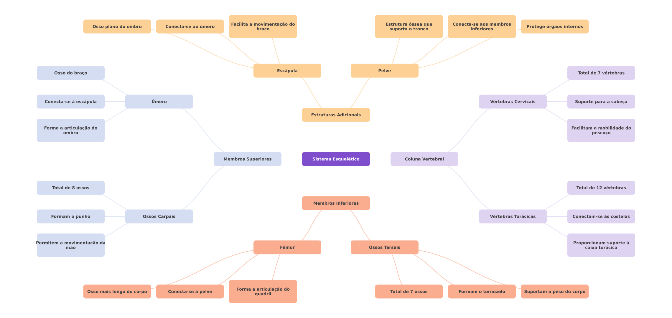 Facilita a movimentação do Estrutura óssea que Conecta-se aos membros Osso plano do ombro Conecta-se ao úmero braço suporta tronco inferiores Protege órgãos internos Osso do braço Escápula Pelve Total de 7 vértebras Conecta-se à escápula Úmero Vértebras Cervicais Suporte para a cabeça Estruturas Adicionais Forma a articulação do Facilitam a mobilidade do ombro pescoço Membros Superiores Sistema Esquelético Coluna Vertebral Total de 8 ossos Total de 12 vértebras Membros Inferiores Formam punho Ossos Carpais Vértebras Torácicas Conectam-se às costelas Permitem a movimentação da Proporcionam suporte à mão Fêmur Ossos Tarsais caixa torácica Osso mais longo do corpo Conecta-se à pelve Forma a articulação do Total de 7 ossos Formam tornozelo quadril Suportam peso do corpo