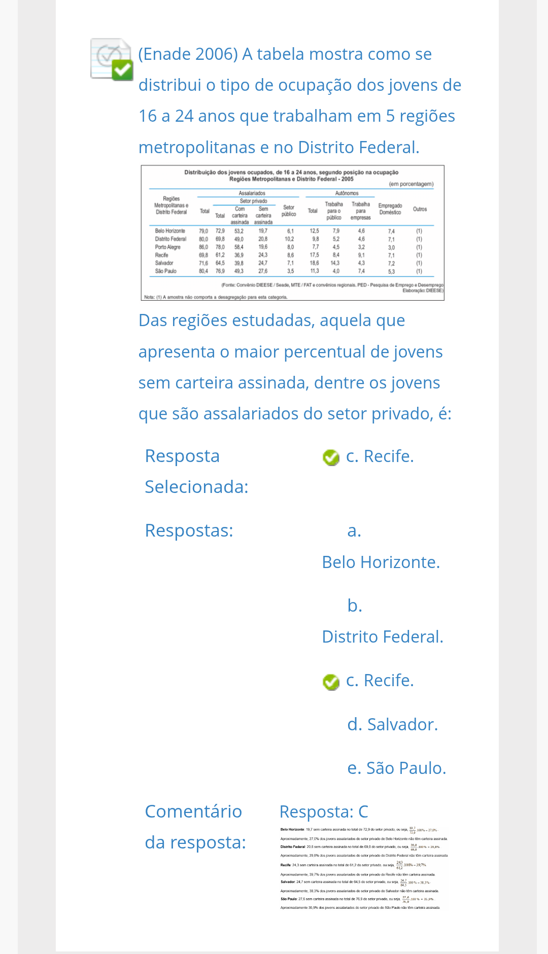 (Enade 2006) A tabela mostra como se distribui o tipo de ocupação dos jovens de 16 a 24 anos que trabalham em 5 regiões metropolitanas e no Distrito Federal. Distribuição dos jovens ocupados, de 16 a 24 anos, segundo posição na ocupação Regiões Metropolitanas e Distrito Federal 2005 (em porcentagem) Assalariados Autônomos Regiões Setor privado Metropolitanas e Trabalha Trabalha Total Com Sem Setor Empregado Distrito Federal Total carteira público para para Outros Doméstico Total carteira público empresas assinada assinada Belo Horizonte 79.0 72.9 53.2 19,7 6,1 12.5 4,6 7.4 (1) Distrito Federal 80.0 69,8 49.0 20,8 10.2 (1) Porto Alegre 78,0 7.7 4,5 3,2 3.0 (1) Recife 69.8 36.9 24,3 9,1 (1) Salvador 39.8 4,3 7.2 (1) São Paulo 11,3 7.4 (1) (Fonte: Convênio DIEESE Seade, MTE/FAT e PED Pesquisa de Emprego Desemprego Elaboração: DIEESE) Nota: (1) A amostra não comporta a desagregação para esta Das regiões estudadas, aquela que apresenta o maior percentual de jovens sem carteira assinada, dentre os jovens que são assalariados do setor privado, é: Resposta C. Recife. Selecionada: Respostas: a. Belo Horizonte. b. Distrito Federal. C. Recife. d. Salvador. e. São Paulo. Comentário Resposta: Belo Horizonte sem cartera assinada total de 100% da resposta: 27 0% assalariados do carteira Distrito Federal assinada de setor seja 29 dos jovens do do Federal não assinada Recife sem carteira assinada total de 61 243 612 100% 39,7% 39 do não sem carteira assinada total do 38 dos assalariados do do Salvador não carteira Paulo 27 sem assinada no total de do Aproximadamente dos assalariados do setor privado do São não assinada