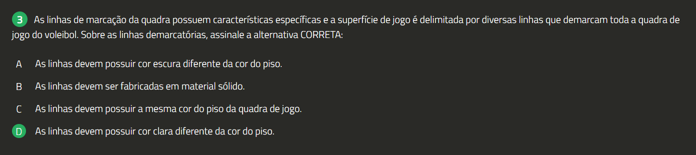 3 As linhas de marcação da quadra possuem características específicas e a superfície de jogo é delimitada por diversas linhas que demarcam toda a quadra de jogo do voleibol. Sobre as linhas demarcatórias, assinale a alternativa CORRETA: A As linhas devem possuir cor escura diferente da cor do piso. As linhas devem ser fabricadas em material sólido. As linhas devem possuir a mesma cor do piso da quadra de jogo. D As linhas devem possuir cor clara diferente da cor do piso.