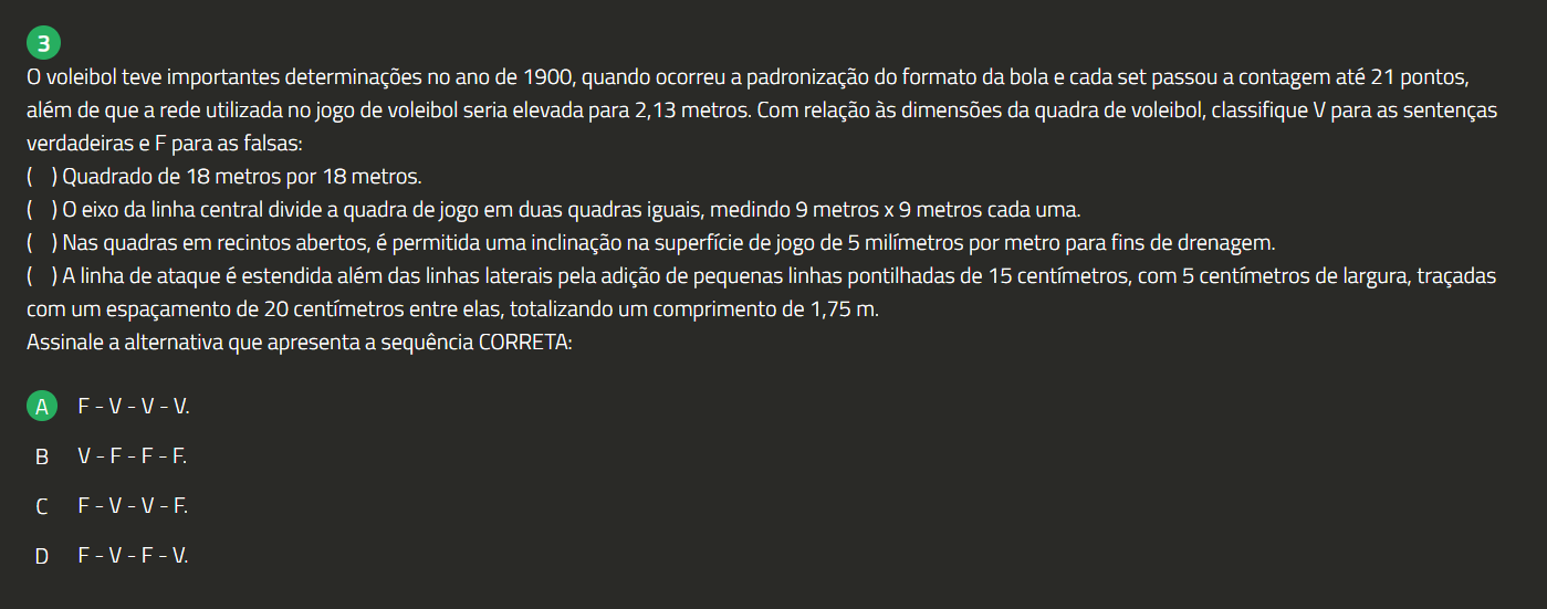 3 0 voleibol teve importantes determinações no ano de 1900, quando ocorreu a padronização do formato da bola e cada set passou a contagem até 21 pontos, além de que a rede utilizada no jogo de voleibol seria elevada para 2,13 metros. Com relação às dimensões da quadra de voleibol, classifique V para as sentenças verdadeiras e F para as falsas: ( ) Quadrado de 18 metros por 18 metros. ( ) 0 eixo da linha central divide a quadra de jogo em duas quadras iguais, medindo 9 metros X 9 metros cada uma. Nas quadras em recintos abertos, é permitida uma inclinação na superfície de jogo de 5 milímetros por metro para fins de drenagem. A linha de ataque é estendida além das linhas laterais pela adição de pequenas linhas pontilhadas de 15 centímetros, com 5 centímetros de largura, traçadas com um espaçamento de 20 centímetros entre elas, totalizando um comprimento de 1,75 m. Assinale a alternativa que apresenta a sequência CORRETA: A F-V-V-V. B V-F-F-F. F-V-V-F. D F-V-F-V.