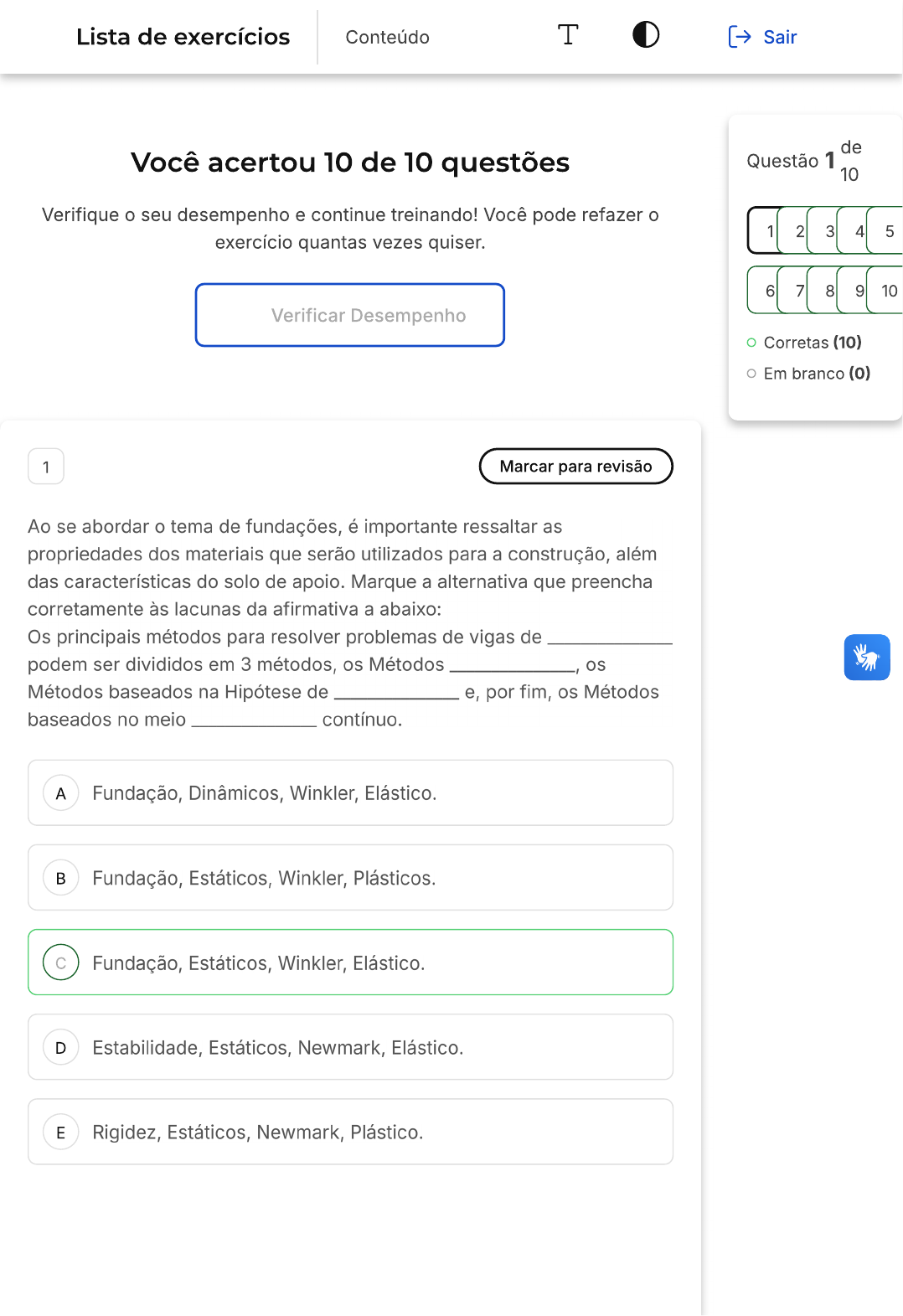 Lista de exercícios Conteúdo T Sair de Você acertou 10 de 10 questões Questão 1 10 Verifique seu desempenho e continue treinando! Você pode refazer 1 2 3 4 5 exercício quantas vezes quiser. 6 7 8 9 10 Verificar Desempenho Corretas (10) Em branco (0) 1 Marcar para revisão Ao se abordar tema de fundações, é importante ressaltar as propriedades dos materiais que serão utilizados para a construção, além das características do solo de apoio. Marque a alternativa que preencha corretamente às lacunas da afirmativa a abaixo: Os principais métodos para resolver problemas de vigas de podem ser divididos em 3 métodos, os Métodos os Métodos baseados na Hipótese de e, por fim, os Métodos baseados no meio contínuo. A Fundação, Dinâmicos, Winkler, Elástico. Fundação, Estáticos, Winkler, Plásticos. c Fundação, Estáticos, Winkler, Elástico. D Estabilidade, Estáticos, Newmark, Elástico. E Rigidez, Estáticos, Newmark, Plástico.Resposta correta Parabéns, você selecionou a alternativa correta. Confira gabarito comentado! Gabarito Comentado Gabarito: Fundação, Estáticos, Winkler, Elástico. Justificativa: A afirmativa correta é: Os principais métodos para resolver problemas de vigas de fundação podem ser divididos em 3 métodos, os Métodos estáticos, os Métodos baseados na Hipótese de Winkler e, por fim, os Métodos baseados no meio elástico contínuo. 2 Marcar para revisão (CESGRANRIO / 2014 adaptada) Ao se abordar tema de fundações, é importante ressaltar as propriedades dos materiais que serão utilizados para a construção, além das características do solo de apoio. No cálculo das ações nas fundações, segundo a NBR 6122:2019, Projeto e Execução de Fundações, têm-se, dentre outras ações, peso próprio dos blocos de coroamento ou sapatas, ou, no mínimo, um percentual da carga vertical permanente igual a: A 1% 3% c 5% D 7% E 10%Resposta correta Parabéns, você selecionou a alternativa correta. Confira gabarito comentado! Gabarito Comentado De acordo com a NBR 6122:2019, na página 15, capítulo 5, item 5.6, que trata do Peso próprio das fundações, é afirmado que deve ser considerado peso próprio de blocos de coroamento ou sapatas, ou no mínimo 5% da carga vertical permanente. Portanto, a alternativa correta é a letra C, que indica o percentual de 5%. Isso significa que, no cálculo das ações nas fundações, deve-se levar em conta o peso próprio dos materiais utilizados ou, no mínimo, 5% da carga vertical permanente. Essa norma é fundamental para garantir a segurança e a eficácia da construção das fundações. 3 Marcar para revisão Ao se abordar tema de fundações, é importante ressaltar as propriedades dos materiais que serão utilizados para a construção, além das características do solo de apoio. Marque a alternativa que preencha corretamente às lacunas da afirmativa a abaixo: Dentro dos critérios adicionais indicados na NBR 6122:2019, tem-se que o em todas as partes da fundação rasa ( ou ) em contato com (sapatas, vigas de equilíbrio etc.), deve existir um ou seja, deve haver uma camada de com no mínimo de espessura, e, este, deve ser lançado sobre toda a superfície de contato direta ou profunda, radier, Lastro, concreto estrutural, 10 cm, A solo-fundação. indireta ou superficial, solo, Lastro, concreto não estrutural, 7,5 cm, solo-fundação. direta ou superficial, solo, Lastro, concreto não estrutural, 5 cm, c solo-fundação.direta ou superficial, solo, Lastro, concreto não estrutural, 10 cm, D solo. direta ou superficial, solo, Lastro, concreto estrutural, 5 cm, E solo-fundação. Resposta correta Parabéns, você selecionou a alternativa correta. Confira gabarito comentado! Gabarito Comentado Gabarito: direta ou superficial, solo, Lastro, concreto não estrutural, 5 cm, solo-fundação. Justificativa: A NBR 6122:2019, página 4, capítulo 7, item 7.7.3 Lastro faz as considerações que fazem com que esta seja a única alternativa que contenha todas as opções para preenchimento correto das lacunas. direta ou profunda, radier, Lastro, concreto estrutural, 10 cm, solo- fundação. está errada, pois, fundação rasa pode ser denominada direta ou superficial, e, não profunda. Além disso contato da fundação é com solo e não com Radier, além disso concreto usado como camada de regularização é não estrutura e sua espessura é de 5 cm. indireta ou superficial, solo, Lastro, concreto não estrutural, 7,5 cm, solo-fundação. apresenta duas informações incorretas, tipo de fundação, pois, fala que fundação rasa é indireta, e sabe-se que é o oposto e sobre a espessura do lastro que não é 7,5 cm e sim, 5 cm. direta ou superficial, solo, Lastro, concreto não estrutural, 10 cm, solo. também apresenta a altura do lastro errada (10 cm) e também afirma que a superfície de contato é solo, quando na verdade neste item está se falando do contato solo-fundação. direta ou superficial, solo, Lastro, concreto estrutural, 5 cm, solo- fundação. é que apresenta apenas uma informação incorreta, sobre concreto utilizado, pois, este deve ser não estrutural e, não, estrutural como coloca a alternativa. 4 Marcar para revisãoAo se abordar tema de fundações, é importante ressaltar as propriedades dos materiais que serão utilizados para a construção, além das características do solo de apoio. Considerando a sapata proposta na figura abaixo. Deseja-se calcular a área de aço para a armadura longitudinal, nos dois sentidos considerando que a tensão admissível do solo é de 300 kPa, esforço característico atuante + peso próprio da sapata vale 1600 kN, o aço utilizado é CA 50 e concreto possui de 20 MPa. Considere que todas as verificações foram cumpridas. SAPATA SIMULADO CORTE PLANTA ESC 1:25 ESC 1:25 N.T. 245 62,5 70 245 35 25 245 Fonte: YDUQS Estácio 2021 A = e = e c = e D = e E = e Resposta correta Parabéns, você selecionou a alternativa correta. Confira gabarito com