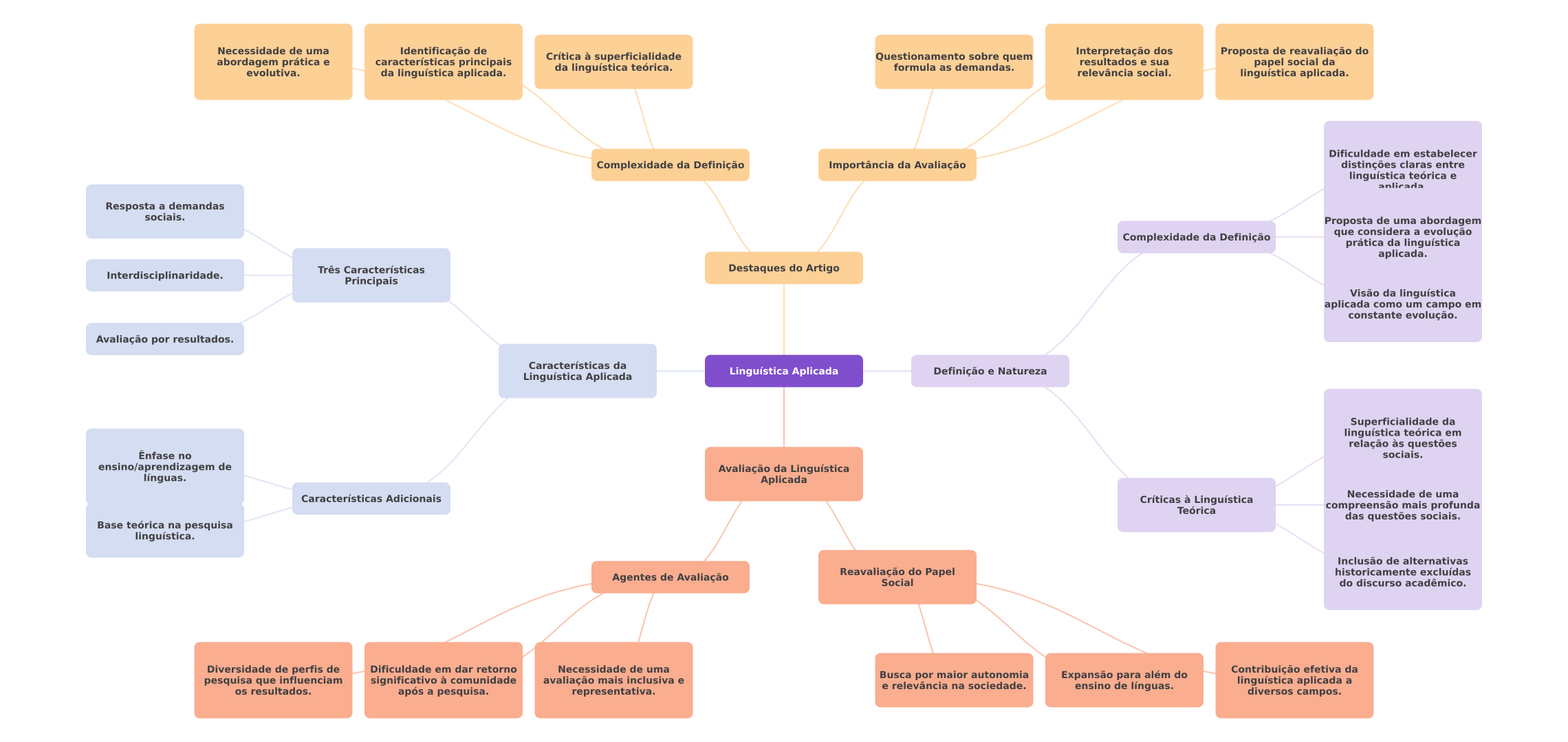 Necessidade de uma Identificação de abordagem prática e características principais Crítica à superficialidade Questionamento sobre quem Interpretação dos Proposta de reavaliação do resultados e sua da linguística aplicada. da linguística teórica. formula as demandas. papel social da evolutiva. relevância social. linguística aplicada. Dificuldade em estabelecer Complexidade da Definição Importância da Avaliação distinções claras entre linguística teórica e anlicada Resposta a demandas sociais. Proposta de uma abordagem Complexidade da Definição que considera a evolução prática da linguística aplicada. Três Características Destaques do Artigo Principais Visão da linguística aplicada como um campo em constante evolução. Avaliação por resultados. Características da Linguística Aplicada Linguística Aplicada Definição e Natureza Superficialidade da linguística teórica em relação às questões no sociais. ensino/aprendizagem de Avaliação da Linguística línguas. Aplicada Características Adicionais Necessidade de uma Críticas à Linguística Teórica compreensão mais profunda das questões sociais. Base teórica na pesquisa linguística. Inclusão de alternativas Agentes de Avaliação Reavaliação do Papel historicamente excluídas Social do discurso acadêmico. Diversidade de perfis de Dificuldade em dar retorno Necessidade de uma Contribuição efetiva da Busca por maior autonomia pesquisa que influenciam significativo à comunidade avaliação mais inclusiva e Expansão para além do e relevância na sociedade. após a pesquisa. ensino de línguas. linguística aplicada a os resultados. representativa. diversos campos.
