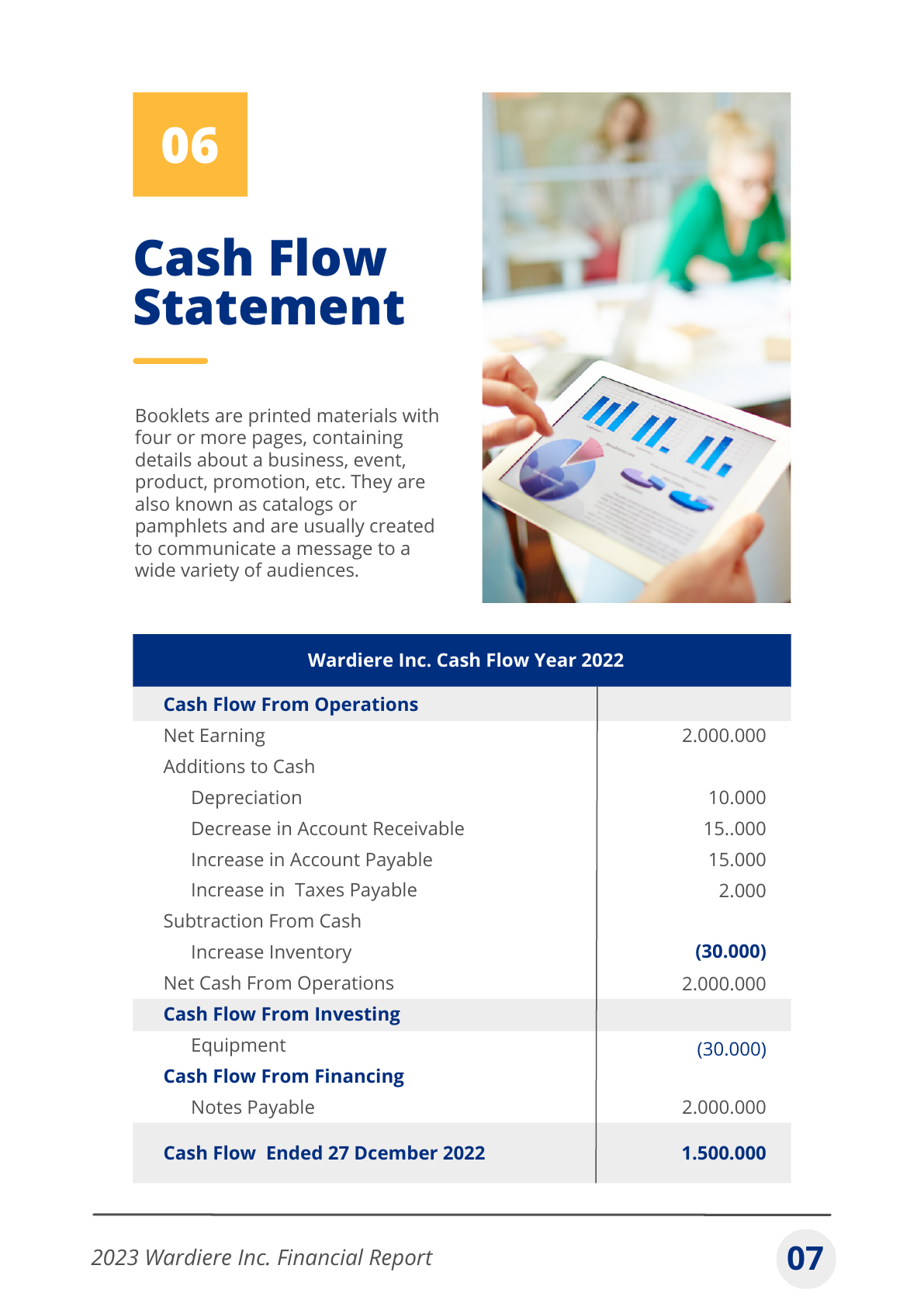 2023 Wardiere Inc. Financial Report Cash Flow Statement 07 06 Booklets are printed materials with four or more pages, containing details about a business, event, product, promotion, etc. They are also known as catalogs or pamphlets and are usually created to communicate a message to a wide variety of audiences. Wardiere Inc. Cash Flow Year 2022 Cash Flow From Operations Net Earning Additions to Cash Depreciation Decrease in Account Receivable Increase in Account Payable Increase in Taxes Payable Subtraction From Cash Increase Inventory Net Cash From Operations Cash Flow From Investing Cash Flow From Financing Equipment Notes Payable Cash Flow Ended 27 Dcember 2022 2.000.000 10.000 15..000 15.000 2.000 (30.000) 2.000.000 (30.000) 2.000.000 1.500.000