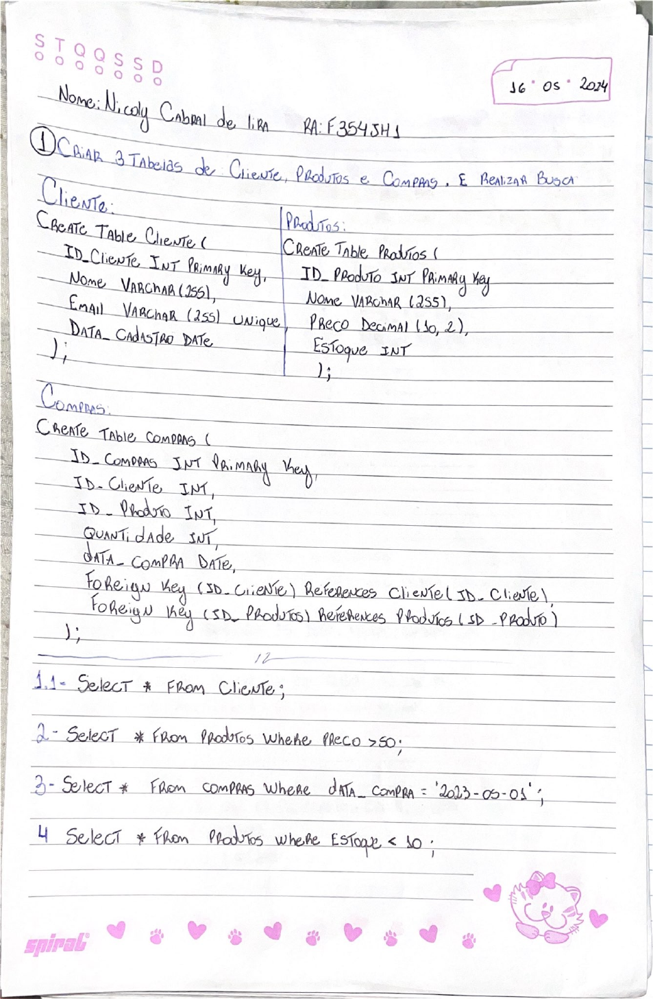 S Nome: Nicoly de liRA RA: F354JH1 1 CRiAR 3 TAbelas de e E ( ID INT CReATe TAble PROJUTOS ( Nome (255), ID_ INT Key EMAIL VARChAR (255) (255), DATA_ DATe 2), ); INT ); TAble ( COMPRAS INT Key, ID. INT, INT, QUANTidAde INT, COMPRA Key ID. FoReigN Key ); 12 1.1- * FROM 2- FROM >so; 3- Select * COMPRAS COMPRA = 4 FRom PRODUTOSS S 16 05 24 2 3 NOVAS e BUSCA TAble ( CReATe ( INT INT (255), ID. INT, Decimal (5,21, (255), DATe, Fim 5- Select * FROM 6- FROM P JOIN ON = PR. ID. PR AND 7- Select Sum AS FROM CO PR ON = PR. WheRe