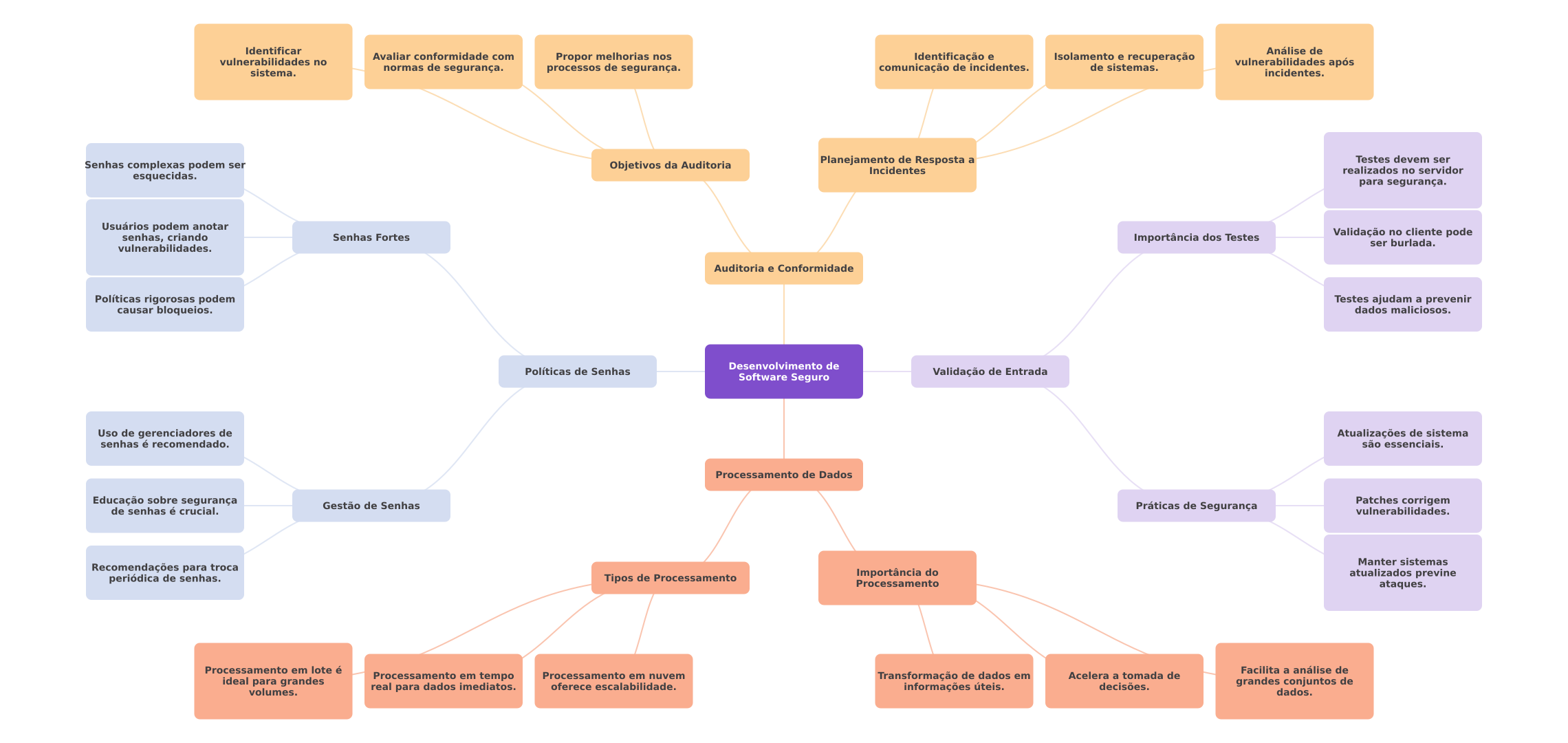 Identificar Análise de Avaliar conformidade com vulnerabilidades no Propor melhorias nos Identificação e Isolamento e recuperação normas de segurança. processos de segurança. comunicação de incidentes. de sistemas. vulnerabilidades após sistema. incidentes. Senhas complexas podem ser Objetivos da Auditoria Planejamento de Resposta a Testes devem ser Incidentes realizados no servidor esquecidas. para segurança. Usuários podem anotar senhas, criando Senhas Fortes Importância dos Testes Validação no cliente pode ser burlada. vulnerabilidades. Auditoria e Conformidade Políticas rigorosas podem Testes ajudam a prevenir causar bloqueios. dados maliciosos. de Políticas de Senhas Validação de Entrada Software Seguro Uso de gerenciadores de Atualizações de sistema senhas é recomendado. são essenciais. Processamento de Dados Educação sobre segurança Gestão de Senhas de senhas é crucial. Práticas de Segurança Patches corrigem vulnerabilidades. Manter sistemas Recomendações para troca Importância do periódica de senhas. Tipos de Processamento atualizados previne Processamento ataques. Processamento em lote é Facilita a análise de Processamento em tempo Processamento em nuvem Transformação de dados em Acelera a tomada de ideal para grandes volumes. real para dados imediatos. oferece escalabilidade. informações úteis. decisões. grandes conjuntos de dados.