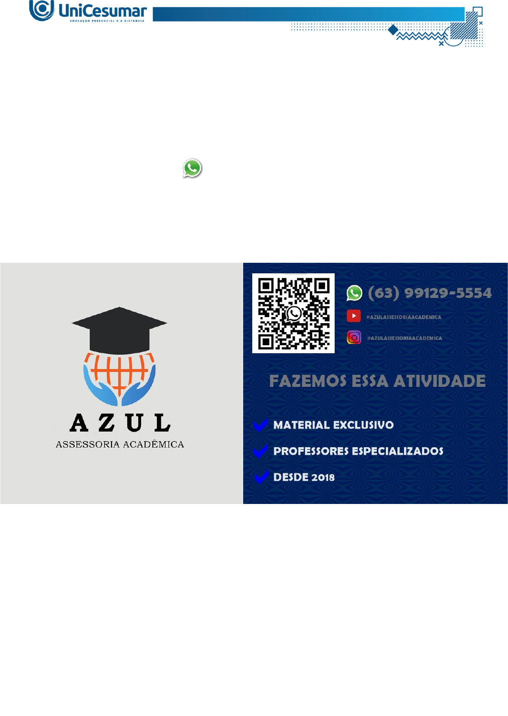 Olá, aluno(a)! Está com dificuldade ou sem tempo para elaborar essa atividade? Iremos te ajudar! Entre em contato (63) 99129-5554 ATIVIDADE 2 – BIO – ESTÁGIO SUPERVISIONADO IV - 54_2025 Caro(a) aluno(a), Seja bem-vindo(a) à atividade de estudo 2 da disciplina de Estágio Supervisionado IV. De acordo com a Lei nº 11.788, de 25 de setembro de 2008, que dispõe sobre o estágio de estudantes, o estágio é um ato educativo escolar supervisionado, que faz parte do projeto pedagógico do curso, e visa ao aprendizado de competências próprias da atividade profissional e à contextualização curricular, preparando o educando para a vida cidadã e para o trabalho produtivo. Fonte: adaptado de: BRASIL. Lei nº 11.788, de 25 de setembro de 2008. Dispõe sobre o estágio de estudantes; altera a redação do art. 428 da Consolidação das Leis do Trabalho – CLT, aprovada pelo Decreto-Lei nº 5.452, de 1º de maio de 1943, e a Lei nº 9.394, de 20 de dezembro de 1996; revoga as Leis nos 6.494, de 7 de dezembro de 1977, e 8.859, de 23 de março de 1994, o parágrafo único do art. 82 da Lei nº 9.394, de 20 de dezembro de 1996, e o art. 6º da Medida Provisória nº 2.164-41, de 24 de agosto de 2001; e dá outras providências.. Brasília, DF: Diário Oficial da União, 2008. Disponível em: https://www.planalto.gov.br/ccivil_03/_ato2007-2010/2008/lei/l11788.htm Nesta atividade você deverá enviar o relatório da disciplina de Estágio Supervisionado IV. Este relatório é um documento para descrever formalmente as observações do estágio. Orientações iniciais: - Leia os documentos, arquivos, orientações e assista aos vídeos disponibilizados no ambiente da disciplina. - Assista a Live de Orientação do Estágio, que está disponível na página da disciplina. Orientações breves sobre a Documentação de Estágio: - Para a realização do estágio supervisionado é necessário que seja firmado um convênio entre a instituição de ensino e o campo de estágio (unidade concedente). - Preencha e protocole corretamente o Termo de Compromisso de Estágio (TCE) e o Termo de Convênio (TC) do estágio supervisionado via Proposta de Estágio no Portal de Estágios EAD (Valorizza). Lembre-se que, sem a entrega e deferimento da Proposta de Estágio, o aluno não poderá iniciar o estágio supervisionado, o que configurará em reprovação na disciplina de estágio supervisionado. Orientações para o Relatório de Estágio: - Para a elaboração do relatório, realize o download do template (modelo) disponibilizado no Material da disciplina e siga todas as instruções de como realizar a atividade. O uso do template é obrigatório, sendo o mesmo a folha de resposta para a entrega da atividade. - O envio do relatório é obrigatório e compõe a nota final da disciplina. Envie o relatório, utilizando o template disponibilizado, em 1 (um) único arquivo, no formato PDF (.pdf). Apenas o formato PDF será aceito. - A atividade é individual. Em caso de cópias, atividades similares entre estudantes e plágio a atividade será zerada. Orientações para o Envio do Relatório de Estágio: - O arquivo deve ser enviado única e exclusivamente pelo seu Studeo, no campo “Atividade de Estudo 2” desta disciplina. Toda e qualquer outra forma de entrega deste relatório final não será considerada. - A qualidade do trabalho será considerada na hora da avaliação, então faça tudo com cuidado, responda à demanda adequadamente e mostre sempre o seu raciocínio de modo claro e direto. - A IES não se responsabiliza por arquivos de atividades não finalizadas, sendo, portanto, não recebidas por motivos de ordem técnica dos computadores, falhas de comunicação, congestionamento das linhas de comunicação, bem como por outros fatores que impossibilitem a transferência de dados. Como enviar o seu arquivo: - Ao final do enunciado desta atividade, no Studeo, tem uma caixa de envio de arquivo. Basta clicar e selecionar sua atividade, ou arrastar o arquivo até ela. - Antes de clicar em “Finalizar”, certifique-se de que o arquivo anexado é o correto, pois uma vez finalizado você não poderá mais modificar o arquivo. Sugerimos que você clique no link gerado da sua atividade e faça o download para conferir.
