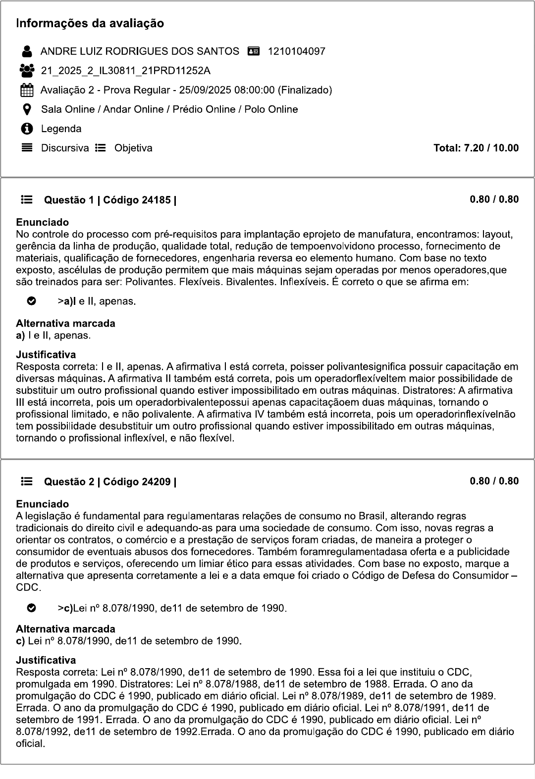 Informações da avaliação ANDRE LUIZ RODRIGUES DOS SANTOS 1210104097 21_2025_2_IL30811_21PRD11252A Avaliação 2 Prova Regular 25/09/2025 08:00:00 (Finalizado) Sala Online / Andar Online / Prédio Online / Polo Online i Legenda Discursiva Objetiva Total: 7.20 10.00 Questão 1 Código 24185 0.80 0.80 Enunciado No controle do processo com pré-requisitos para implantação eprojeto de manufatura, encontramos: layout, gerência da linha de produção, qualidade total, redução de tempoenvolvidono processo, fornecimento de materiais, qualificação de fornecedores, engenharia reversa eo elemento humano. Com base no texto exposto, ascélulas de produção permitem que mais máquinas sejam operadas por menos operadores,que são treinados para ser: Polivantes. Flexíveis. Bivalentes. Inflexíveis. É correto o que se afirma em: e II, apenas. Alternativa marcada a) e II, apenas. Justificativa Resposta correta: e II, apenas. A afirmativa está correta, poisser polivantesignifica possuir capacitação em diversas máquinas. A afirmativa também está correta, pois um operadorflexíveltem maior possibilidade de substituir um outro profissional quando estiver impossibilitado em outras máquinas. Distratores: A afirmativa III está incorreta, pois um operadorbivalentepossui apenas capacitaçãoem duas máquinas, tornando o profissional limitado, e não polivalente. A afirmativa IV também está incorreta, pois um operadorinflexívelnão tem possibilidade desubstituir um outro profissional quando estiver impossibilitado em outras máquinas, tornando o profissional inflexível, e não flexível. Questão 2 Código 24209 0.80 0.80 Enunciado A legislação é fundamental para regulamentaras relações de consumo no Brasil, alterando regras tradicionais do direito civil e adequando-as para uma sociedade de consumo. Com isso, novas regras a orientar os contratos, o comércio e a prestação de serviços foram criadas, de maneira a proteger consumidor de eventuais abusos dos fornecedores. Também oferta e a publicidade de produtos e serviços, oferecendo um limiar ético para essas atividades. Com base no exposto, marque a alternativa que apresenta corretamente a lei e a data emque foi criado o Código de Defesa do Consumidor - CDC. >c)Lei n° 8.078/1990, de11 de setembro de 1990. Alternativa marcada c) Lei n° 8.078/1990, de11 de setembro de 1990. Justificativa Resposta correta: Lei n° 8.078/1990, de11 de setembro de 1990. Essa foi a lei que instituiu CDC, promulgada em 1990. Distratores: Lei n° 8.078/1988, de11 de setembro de 1988. Errada. O ano da promulgação do CDC é 1990, publicado em diário oficial. Lei n° 8.078/1989, de11 de setembro de 1989. Errada. ano da promulgação do CDC é 1990, publicado em diário oficial. Lei n° 8.078/1991, de11 de setembro de 1991. Errada. ano da promulgação do CDC é 1990, publicado em diário oficial. Lei n° 8.078/1992, de11 de setembro de 1992.Errada. O ano da promulgação do CDC é 1990, publicado em diário oficial.Questão 3 Código 24203 0.80 0.80 Enunciado A pesquisa e o desenvolvimento para a elaboração de novos produtos (no sentido mais abrangente) requerem, na maioria das vezes, grandes investimentos, pois envolvem recursos financeiros, tecnologia e inovação, mão de obra e, muitas das vezes, equipamentos. Diante disso, paraprevenirque competidores copiem e vendam esses produtos a um preço mais baixo,devemos considerar no início desse projeto o(a): >a)Patente. Alternativa marcada a) Patente. Justificativa Resposta correta: Patente. É a maneira de se resguardar quanto a todos os processos e atividades voltadospara o produto novo. Éuma concessão pública, conferida pelo Estado, que garante ao seu titular a exclusividade ao explorar comercialmente a sua criação. Insere-se nos denominados direitos de propriedade industrial, cujos normativos legais são, em Portugal, o Código da Propriedade Industrial. Distratores: Marca. Errada. A marca é apenas a nomenclatura do produto ou logo. Éa representação simbólica de uma entidade, qualquer que ela seja, algo que permite identificá-la de um modo imediato, como um sinal de presença ouuma simples pegada. Na teoria da comunicação, pode ser um signo, um símbolo ou um ícone. Uma simples palavra pode referir umamarca. Logo. Errada. A logo é apenas a nomenclatura do produto ou marca. Éum conjunto formado por duas ou mais letras fundidas em um só tipo, compondo uma sigla. Essa peça de design identifica ou representa uma entidade (marca de produto ou serviço). Registro. Errada. Oregistro consiste em dar entrada com toda a documentação. Éuma forma de fazer persistir determinada informação durante um período de tempo. Validação. Errada. A validação é passo após a entrega e aprovação do processo de registro. Éo mecanismo ou a atividade usada pela organização para assegurar que um processo cuja saída não é totalmente verificável seja capaz de fornecer de forma constante produtos que atendam às especificações. Questão 4 Código 24188 0.80 0.80 Enunciado Segundo Suzano(2013), as melhorias na fase da transformaçãotêm por finalidade otimizar os processos com foco no aumento da produtividade e com base nosindicadores logísticos de desempenho para verificação de umlimite de produção de uma indústria ou empresa. Diante do exposto, para a análise do aumento de produtividade e verificação das metas de uma indústria ou empresa, devemos utilizar ocálculo de: do fator considerado -Pf. Alternativa marcada c) Produtividade do fator considerado -Pf. Justificativa Resposta correta: Produtividade do fator considerado -Pf. Representa um indicador de desempenho que avalia a relação entre a quantidade total produzida pela quantidade do fator considerado como meta de uma indústria ou empresa. Distratores: Produtividade da quantidade total -Qt. Errada. Implica apenas a quantidade produzida na linha de produção. Produtividade da quantidadefator considerado -Qf.Errada. Impl