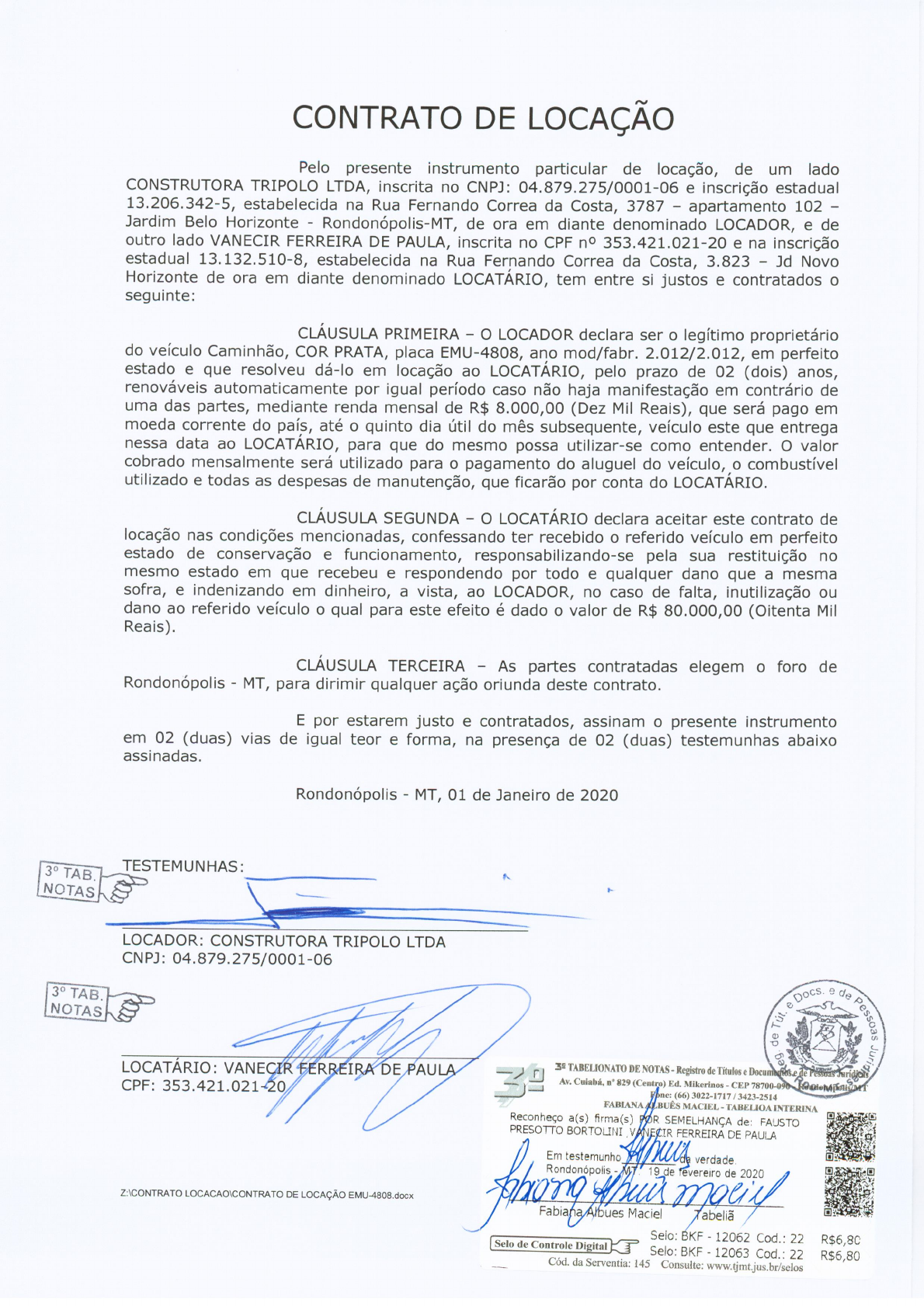 CONTRATO DE LOCAÇÃO Pelo presente instrumento particular de locação, de um lado CONSTRUTORA TRIPOLO LTDA, inscrita no CNPJ: 04.879.275/0001-06 e inscrição estadual 13.206.342-5, estabelecida na Rua Fernando Correa da Costa, 3787 apartamento 102 Jardim Belo Horizonte Rondonópolis-MT, de ora em diante denominado LOCADOR, e de outro lado VANECIR FERREIRA DE PAULA, inscrita no CPF 353.421.021-20 e na inscrição estadual 13.132.510-8, estabelecida na Rua Fernando Correa da Costa, 3.823 Jd Novo Horizonte de ora em diante denominado LOCATÁRIO, tem entre si justos e contratados o seguinte: CLÁUSULA PRIMEIRA O LOCADOR declara ser legítimo proprietário do veículo Caminhão, COR PRATA, placa EMU-4808, ano mod/fabr. 2.012/2.012, em perfeito estado e que resolveu dá-lo em locação ao LOCATÁRIO, pelo prazo de 02 (dois) anos, renováveis automaticamente por igual período caso não haja manifestação em contrário de uma das partes, mediante renda mensal de R$ 8.000,00 (Dez Mil Reais), que será pago em moeda corrente do país, até o quinto dia útil do mês subsequente, veículo este que entrega nessa data ao LOCATÁRIO, para que do mesmo possa utilizar-se como entender. O valor cobrado mensalmente será utilizado para o pagamento do aluguel do veículo, o combustível utilizado e todas as despesas de manutenção, que ficarão por conta do LOCATÁRIO. CLÁUSULA SEGUNDA O LOCATÁRIO declara aceitar este contrato de locação nas condições mencionadas, confessando ter recebido o referido veículo em perfeito estado de conservação e funcionamento, responsabilizando-se pela sua restituição no mesmo estado em que recebeu e respondendo por todo e qualquer dano que a mesma sofra, e indenizando em dinheiro, a vista, ao LOCADOR, no caso de falta, inutilização ou dano ao referido veículo o qual para este efeito é dado o valor de R$ 80.000,00 (Oitenta Mil Reais). CLÁUSULA TERCEIRA As partes contratadas elegem o foro de Rondonópolis MT, para dirimir qualquer ação oriunda deste contrato. E por estarem justo e contratados, assinam presente instrumento em 02 (duas) vias de igual teor e forma, na presença de 02 (duas) testemunhas abaixo assinadas. Rondonópolis MT, 01 de Janeiro de 2020 3° TAB TESTEMUNHAS: NOTAS LOCADOR: CONSTRUTORA TRIPOLO LTDA CNPJ: 04.879.275/0001-06 3° Docs e de NOTAS Pessoas de LOCATÁRIO: VANECIR FERREIRA DE PAULA TABELIONATO DE NOTAS Registro de Títulos e CPF: 353.421.021-20 Av. Cuiabá, n° 829 (Centro) Ed. Mikerinos - 78700-090 Fone: (66) 3022-1717 3423-2514 FABIANA ALBUÊS MACIEL TABELIOA INTERINA Reconheço a(s) firma(s) POR SEMELHANÇA de: FAUSTO PRESOTTO BORTOLINI VANECIR FERREIRA DE PAULA Em testemunho Rondonópolis MT 19 de fevereiro de 2020 Z:\CONTRATO LOCACAO\CONTRATO DE LOCAÇÃO EMU-4808.docx Fabiana Albues Maciel abeliã Selo: BKF 12062 Cod.: 22 Selo de Controle Digital R$6,80 Selo: BKF 12063 Cod.: 22 R$6,80 Cód. da Serventia: 145 Consulte: www.tjmt.jus.br/selos