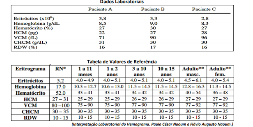 1 - (CONSULPLAN/ Prefeitura de Cascavel/ PR/ 2016 - adaptada) A avaliação qualitativa do hemograma tem o objetivo de analisar a morfologia do esfregaço de sangue periférico. Marque a alternativa que apresenta as características de alteração na morfologia das hemácias, que são os Anéis de Cabot. a) Presença de hemácias empilhadas devido à sua aglutinação. b) Uma ou poucas inclusões nos eritrócitos que representam fragmentos de DNA. c) Várias inclusões nos eritrócitos compostas de agregados de ribossomos, ferritina, ferro e mitocôndria. d) Células que apresentam inclusões citoplasmática azuis, que são precipitados de hemoglobina desnaturada. e) Hemácias com finos anéis de microtúbulos remanescentes do fuso mitótico. 2- (IDECAN/Pref. Simonésia/MG - 2016 - adaptada) A partir da análise quantitativa dos eritrócitos de três situações de resultado de hemograma de pacientes mulheres adultas, comparando seus resultados com os dados dos valores de referência, analise os dados laboratoriais, associe adequadamente a coluna da direita de acordo com os dados laboratoriais dos pacientes da coluna da esquerda. 1. Paciente A 2. Paciente B. 3. Paciente C. ( ) Anemia macrocítica. ( ) Anemia microcítica e hipocrômica. ( ) Anemia normocítica normocrômica 3- (ITAME -2019 - adaptada) Os principais avanços científicos e tecnológicos são as principais causas de mudança na prática moderna hematológica, influindo especialmente no diagnóstico laboratorial e nos procedimentos terapêuticos de algumas patologias, com destaque para a anemia falciforme, hemofilias e leucemias. Os aparelhos automatizados têm por base os princípios: a) impedância e dispersão da luz através do citômetro de fluxo. b) dispersão da luz através Citômetro de fluxo e filtração por deformabilidade das células. c) nefelometria e filtração por osmose das células. d) filtração por tamanho e deformabilidade das células. e) impedância e filtração por osmose das células. 4 - (EBSERH/2016) Alguns exames servem como suporte ao diagnóstico em situações difíceis de realização da sorologia, como nos casos de epidemias e em caso de falta de kits específicos. Neste sentido, o hemograma desempenha papel fundamental para o imediato tratamento. Suponhamos que o paciente chegou ao pronto atendimento do hospital municipal com sinais clínicos de infecção e não foi possível identificar o foco infeccioso. Assinale a alternativa correta que corresponde ao tipo de leucócito que estará predominante no hemograma realizado rapidamente, se a infecção for bacteriana. a) Eosinófilos. b) Linfócitos. c) Monócitos. d) Plasmócitos. e) Neutrófilos. 5- (IBFC - SEACRE - 2019) Dentre os parâmetros avaliados no hemograma estão os índices hematimétricos, que avaliam as hemácias em relação ao tamanho e conteúdo de hemoglobina, auxiliando na caracterização dos quadros anêmicos. Acerca do índice hematimétrico que classifica as hemácias como normocíticas, microcíticas ou macrocíticas, assinale a alternativa correta a) RDW b) CHCM c) Hematócrito d) Hemoglobina e) VCM 6- (AOCP/FUNDASUS/2015 - adaptada) Os granulócitos são produzidos na medula óssea, na qual se originam de células progenitoras e precursoras. A linhagem granulocítica é constituída por três tipos celulares Marque a alternativa que apresenta esses três tipos celulares. a) Células-Tronco hematopoiética, Monócitos e Linfócitos b) Neutrófilos, Monócitos e Eosinófilos. c) Eosinófilos, Basófilos e Neutrófilos. d) Promonócitos, Basófilos e Neutrófilos. e) Promonócitos, Células-Tronco hematopoiética e Monócitos. 7- (Instituto AOCP/EBSERH/ 2015 - adaptada) O eritrograma é a parte do hemograma que avalia quantitativamente e qualitativamente os eritrócitos. Além disso, também fazem parte do eritrograma os índices hematimétricos. A seguir sai listados alguns paramêtros analisados no eritrograma. Assinale a alternativa que apresenta os índices hematimétricos. a) Número de plaquetas, VCM, RDW. b) Hemoglobina, número de plaquetas, RDW e HCM. c) RDW, VCM, hemácias e número de leucócitos. d) VCM, CHCM, HCM e RDW. e) CHCM, RDW, número de plaquetas e hematócrito. 8- (PUC/Prefeitura de Fazenda Rio Grande/ PR/2018 - adaptada) Prealização de um hemograma, devemos obter a amostra de sangue por meio de punção de um vaso sanguíneo com o auxílio de agulha e seringa apropriadas. Em seguida, devemos transferir o sangue para tubos específicos previamente preparados para o acondicionamento adequado da amostra até o momento da realização do exame. Sobre os cuidados e ações corretas para a obtenção de amostras adequadas, analise as afirmativas a seguir: I - A amostra deve ser acondicionada em frasco contendo anticoagulante Heparina que, por ser o anticoagulante natural do organismo, preserva melhor as características morfocolorimétricas das células. II - A amostra deve ser acondicionada em frasco contendo anticoagulante EDTA e ser mantida em temperatura ambiente (aproximadamente 25°C) até o momento da realização do exame, independentemente do tempo necessário, pois a temperatura de refrigeração provoca hemólise. III - A amostra deve ser acondicionada em frasco contendo anticoagulante EDTA, observando- se a proporção mínima e máxima indicada. Marque a alternativa que apresenta as afirmativas corretas. a) I, apenas. b) II, apenas c) III, apenas. d) I e II, apenas. e) I e III, apenas. 9 - A coleta de sangue é amplamente praticada e continua sendo de inestimável valor para o diagnóstico e tratamento de vários processos patológicos. O teste de laboratório é parte integrante do processo de tomada de decisão do médico e os resultados influenciam diretamente a qualidade de vida do paciente. Em relação ao anticoagulante EDTA utilizado para a coleta desse sangue, marque a alternativa correta: a) Não é indicado para a realização do hemograma, pois não preserva a morfologia d