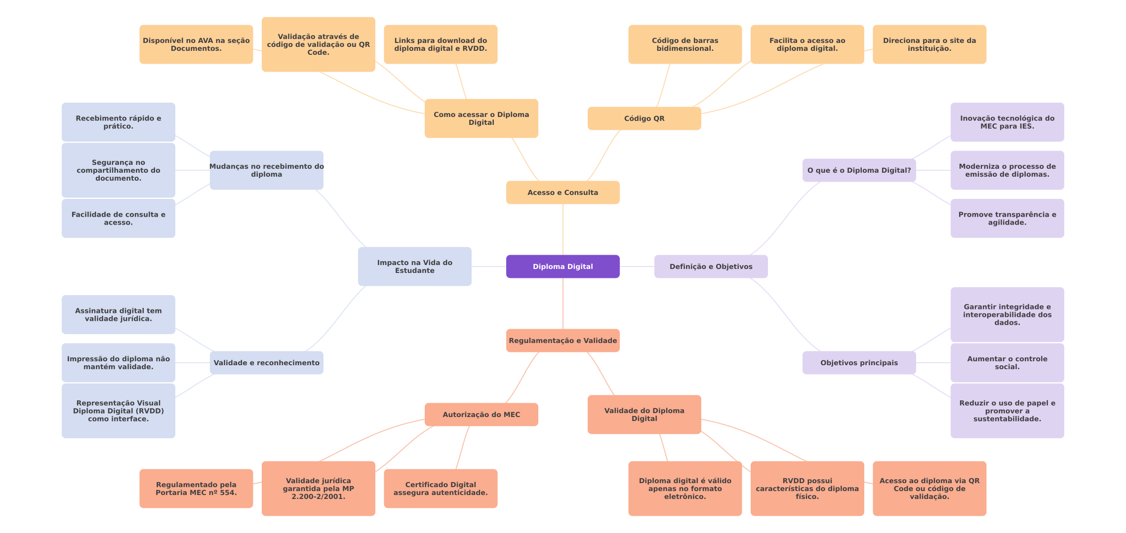 Disponível no AVA na seção Validação através de código de validação ou QR Links para download do Código de barras Facilita acesso ao Direciona para site da Documentos. diploma digital e RVDD. bidimensional. Code. diploma digital. instituição. Recebimento rápido e Como acessar Diploma Digital Código QR Inovação tecnológica do prático. para IES. Segurança no compartilhamento do Mudanças no recebimento do diploma que é Diploma Digital? Moderniza processo de documento. emissão de diplomas. Acesso e Consulta Facilidade de consulta e Promove transparência e acesso. agilidade. Impacto na Vida do Estudante Diploma Digital Definição e Objetivos Assinatura digital tem Garantir integridade e validade jurídica. interoperabilidade dos dados. Regulamentação e Validade Impressão do diploma não Aumentar controle Validade e reconhecimento mantém validade. Objetivos principais social. Representação Visual Reduzir uso de papel e Diploma Digital (RVDD) Autorização do MEC Validade do Diploma promover a como interface. Digital sustentabilidade. Validade jurídica Certificado Digital Diploma digital é válido RVDD possui Acesso ao diploma via QR Regulamentado pela Portaria MEC 554. garantida pela MP assegura autenticidade. apenas no formato características do diploma Code ou código de 2.200-2/2001. eletrônico. físico. validação.
