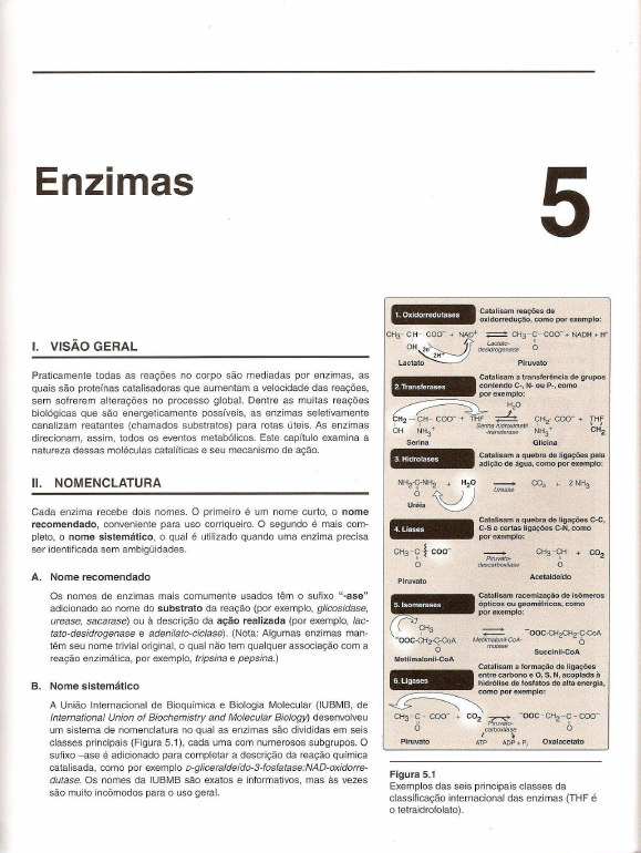 Enzimas I. VISÃO GERAL Praticamente todas as reações no corpo são mediadas por enzimas, as quais são proteínas catalisadoras que aumentam a velocidade das reações, sem sofrerem al terações no p rocesso global. Dentre as muitas reações biológicas que são energeticamente possíveis, as enzimas seletivamente canalizam reatantes (chamados substratos) para rotas úteis. As enzimas direcionam, assim, todos os eventos metabólicos. Este capítulo examina a natureza dessas moléculas catalíticas e seu mecanismo de ação. 11. NOMENCLATURA Cada enzima recebe dois nomes. O primeiro é um nome curto, o nome recomendado, conveniente para uso corriqueiro. O segundo é mais com- pleto, o nome sistemático, o qual é utilizado quando uma enzima precisa ser identificada sem ambigüidades. A. Nome recomendado Os nomes de enzimas mais comumente usados têm o sufixo " -ase" adicionado ao nome do substrato da reação (por exemplo, glicosidase, urease, sacarase) ou à descrição da ação realizada (por exemplo, /ac- tato-desidrogenase e adenilato-cic/ase) . (Nota: Algumas enzimas man- têm seu nome trivial original , o qual não tem qualquer associação com a reação enzimática, por exemplo, tripsina e pepsina.) B. Nom e sistemático A União Internacional de Bioquímica e Biologia Molecular (IUBMB, de lnternational Union of Biochemistry and Molecular Biology) desenvolveu um sistema de nomenclatura no qual as enzimas são divididas em seis classes principais (Figura 5.1 ), cada uma com numerosos subgrupos. O sufixo - ase é adic ionado para completar a descrição da reação química catalisada, como por exemplo o-glicera/deído-3-fosfatase:NAD-oxidorre- dutase. Os nomes da IUBMB são exatos e informativos, mas às vezes são muito incômodos para o uso geral. 1. Oxldorredutases Catalisam reações de oxidorredução, como por exemplo: CH3- C H- coo- + NAD+ CH3 - C- coo-+ NADH + W ' ~ Lactato- 11 OH 2e· desidrogenase O 2H Lactato Piruvato 2. Transferases Catalisam a transferência de grupos contendo C-, N- ou P-, como por exemplo: ~ H20 tH2 -~H- coo-+~ t, O' H ' + Serina hidroximetil NH3 ·transferase y H2- coo- + JH~ NH3+ CH2 Glicina Serina 3. Hidrolases 4. Liases CH3 - c tcoo- " o Piruvato 5. lsomerases ~yH3 -oOC·CH2-C-CoA 6 Metilmalonii-CoA 6. Ligases Catalisam a quebra de ligações pela adição de água, como por exemplo: -- Urease Catalisam a quebra de ligações C-C, C-Se certas lígações C-N, como por exemplo: -- Piruvato- descarboxilase CH3-sH + co2 o Acetaldeído Catalisam racemização de isômeros ópticos ou geométricos, como por exemplo: Catalisam a formação de ligações entre carbono e O, S, N, acoplada à hidrólise de fosfatos de alta energia, ~omopore~emplo: CH3 - ?, - coo- + co2 f?ruv?i/o. OOC- CH2 .. ?, - coo- O carboxilase O I \ Piruvato ATP ADP + P; Oxalacetato Figura 5 .1 Exemplos das seis principais classes da classificação internacional das enzimas (THF é o tetraidrofolato). 54 Pamela C. Champe, Richard A. Harvey, Denise R. Ferrier Figura 5.2 Representação esquemática de uma enzima com um sítio ativo, ligando-se à molécula de substrato. MITOCÔNDRIA e Ciclo do ácido c ítrico e Oxidação de ácidos graxos e Descarbox ilação do piruvato CITOSOL e Glicólise e Ciclo das hexoses e Síntese de DNAe RNA LISOSSOMA e Degradação de macromoléculas complexas Figura 5.3 Localização intracelular de algumas vias bioquímicas importantes. III. PROPRIEDADES DAS ENZIMAS As enzimas são catalisadores protéicos que aumentam a velocidade de uma reação química e não são consumidos durante a reação que catalisam. (Nota: Alguns tipos de RNA podem atuar como enzimas, geralmente catalisando a quebra e a síntese de ligações fosfo-diéster. Os RNAs com atividade catalítica são chamados ribozimas [veja a pág. 436] e são encontrados com muito menos freqüência que as proteínas catalisadoras.) A. Sítios ativos As molécu las de enzimas contêm uma região específica formando uma fenda ou bolso, que é chamada sítio ativo. O sítio ativo contém cadeias laterais de aminoácidos, as quais criam uma superfície tridimensional com- plementar ao substrato (Figura 5.2). O sítio ativo liga o substrato, formando um complexo enzima-substrato (ES). O complexo ES é convertido em enzima-produto (EP), o qual subseqüentemente se dissocia em enzima e produto. B. Efic iência catalítica A reações catalisadas por enzimas são, em sua maioria, altamente eficien- tes, ocorrendo de 1 03 a 1 08 vezes mais rapidamente do que as reações não-catalisadas. Tipicamente, cada molécula de enzima é capaz de trans- formar de 100 a 1.000 moléculas de substrato em produto por segundo. O número de moléculas de substrato convertidas em moléculas de produto por molécula de enzima por segundo é chamado de número de renova- ção (turnover). C. Especificidade As enzimas são altamente específicas, interagindo com um ou alguns pou- cos substratos e catalisando apenas um tipo de reação química. D. Cc-fatores Algumas enzimas se associam com um co-fator não-protéico, o qual é necessário para a atividade enzimática. Os co-fatores comumente encon- trados incluem íons metálicos, tais como Zn2• ou Fe2• , e moléculas orgâ- nicas, conhecidas como coenzimas, que freqüentemente são derivadas de vitaminas. Por exemplo, a coenzima NAD+ contém niacina, o FAD con- tém riboflavina e a coenzima A contém ácido pantotênico. (Veja as páginas 371-379 para o papel das vitaminas como precursoras de coenzimas.) O conjunto da enzima com o seu co-fator é chamado holoenzima. A apoen- zima refere-se à porção protéica da holoenzima. Na ausência do co-fator apropriado, a apoenzima geralmente não apresenta atividade biológica. Um grupo prostético é uma coenzima firmemente ligada à enzima, que desta não se dissocia (por exemplo, a biotina ligada a carboxilases, veja a pág. 379). E. Regulação A atividade enzimática pode ser regulada, isto é, as enzimas pod