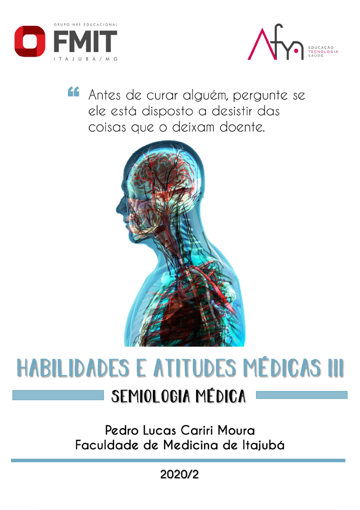 Pedro Lucas Cariri Moura – 3º Período FMIT – Faculdade de Medicina de Itajubá, 2020/2 Semana 3 – 04/09/2020 Habilidades e Atitudes Médicas III – HAM III. Exame Físico Geral O local adequado para o exame físico têm as se- guintes características: Local adequado; Iluminação correta; Posição do paciente; A parte a ser examinada deve ser descoberta, sempre respeitando o pudor do paciente. O exame físico e a anamnese estão altamente rela- cionados. SEMIOTÉCNICA Posições de decúbito, sentado, de pé e andando. Estado Geral É um critério subjetivo, avaliado pelo médico, clas- sificado em: Bom Estado Geral; Regular Estado Geral; Mau Estado Geral. Nível de Consciência Vigília – percepção consciente do mundo exte- rior e de si mesmo. Atividade de diversas áreas cerebrais coordenadas pelo sistema reticular ativador ascendente; Obnubilação – consciência comprometida de modo pouco intenso, mas com estado de alerta comprometido; Sonolência – o paciente é facilmente desper- tado, responde mais ou menos apropriada- mente e volta logo a dormir; Confusão Mental – perda de atenção, pensa- mento não é claro, respostas lentas, sem per- cepção temporoespacial, podendo surgir alu- cinações, ilusão, agitação; Torpor – alteração mais pronunciada, mas o pa- ciente ainda consegue ser despertado com for- tes estímulos, realizar movimentos espontâneos e não abrir os olhos; Coma – se não há despertar, mesmo com fortes estímulos, com ausência de movimentos espon- tâneos. ESCALA DE COMA DE GLASGOW Atualmente, usa-se a escalada de coma de Glas- gow (EG) para se avaliar alterações do nível de consciência. .Consiste na análise de três parâmetros: Abertura ocular; Reação motora; Resposta verbal. Ela é avaliada a partir de vários estímulos, desde a atividade espontânea e estímulos verbais até estí- mulos dolorosos. Fala e Linguagem Disfonia ou afonia – alteração do timbre da voz causada por algum problema no órgão fona- dor. A voz pode tornar-se rouca, fanhosa ou bi- tonal. Dislalia – é o termo que se usa para designar alterações menores da fala, comuns em crian- ças, como a troca de letras (“tasa” por “casa”). Disartria – decorre de alterações nos músculos da fonação, incoordenação cerebral (voz ar- rastada, escandida), hipertonia no parkinso- nismo (voz baixa, monótona e lenta) ou perda do controle piramidal (paralisia pseudobulbar). Disfasia – perturbação na elaboração cortical da fala. Há diversos graus de disfasia. A disfasia pode ser de recepção ou sensorial (o paciente não entende o que se diz a ele), ou de expres- são ou motora (o paciente entende, mas não consegue se expressar), ou ainda do tipo misto, que é o mais frequente. Outros distúrbios – o retardo do desenvolvi- mento da fala na criança, que pode indicar al- guma anormalidade neurológica. Disgrafia (perda da capacidade de escrever) e a disle- xia (perda da capacidade de ler). Estado de Hidratação Os parâmetros avaliados são: Alteração abrupta do peso; Alterações da pele quanto à umidade, à elas- ticidade e ao turgor; Alterações das mucosas quanto à umidade (lín- gua); Alterações oculares; Estado Geral; Fontanelas (no caso de crianças). OBSERVA-SE Sede, diminuição abrupta do peso, pele seca, com elasticidade e turgor diminuídos, mucosas secas, olhos afundados (enoftalmia) e hipotôni- cos, estado geral comprometido, excitação psí- quica ou abatimento, oligúria, fontanelas depri- midas no caso de crianças. Avaliação Antropométrica ALTURA No idoso, observa-se diminuição na altura com o passar dos anos devido ao encurtamento da co- luna vertebral, em virtude da redução dos corpos vertebrais e dos discos intervertebrais. Além disso, há aumento da curvatura e/ou osteoporose. PESO É a soma de todos os componentes da composição corporal – água e tecidos adiposo, muscular e ós- seo. Utilizado como marcador indireto da massa proteica e reserva de energia. O paciente deve ser pesado descalço, com a me- nor quantidade de roupa possível, posicionado no centro da balança com os braços ao longo do corpo. A leitura do peso é realizada com o avaliador à frente da balança e à esquerda do paciente. ÍNDICE DE MASSA CORPORAL (IMC) Indicador do estado nutricional; Baixo custo; Circunferência da Cintura (CC); Circunferência abdominal (CA). AVALIAÇÃO DO ESTADO NUTRICIONAL IMC; Protocolos com adipômetro; Bioimpedância tetrapolar; Densitometria corporal total. Imagem 1. Sinais e sintomas da desidratação. Fonte: PORTO, Celmo Celeno; PORTO, Arnaldo Lemos. Exame clínico: Porto & Porto. 8. ed. Rio de Janeiro, RJ: Guanabara Koogan, 2017. Desenvolvimento Físico Os elementos básicos dessa avaliação é o sexo e a idade do paciente. Primeiramente, compara-se a altura encontrada com as medidas constantes das tabelas de valores normais. Para avaliação da estrutura somática, não se dis- põe de tabelas. É feita pela inspeção global, acrescida de informações a respeito do desenvol- vimento osteomuscular. Desenvolvimento normal; Hiperdesenvolvimento (gigantismo); Hipodesenvolvimento (nanismo); Hábito grácil (constituição corporal frágil e del- gada, caracterizada por ossatura fina, muscu- latura pouco desenvolvida, juntamente com uma altura e um peso abaixo dos níveis normais. É uma condição constitucional, sem significado patológico.; Infantilismo – persistência anormal das caracte- rísticas infantis na idade adulta. GIGANTISMO ACROMEGÁLICO Decorre de hiperfunção do lóbulo anterior da hipó- fise. Além da estatura elevada, a cabeça é maior, as arcadas supraorbitários, os malares e o mento são proeminentes. Nariz aumentado de tamanho, pele grossa, mãos e pés enormes completam o qua- dro. GIGANTISMO INFANTIL Caracteriza-se por apresentar extremidades inferio- res muito longas, lembrando o aspecto dos eunucos. Dependem da hiperfunção da hipófise anterior que tenha 