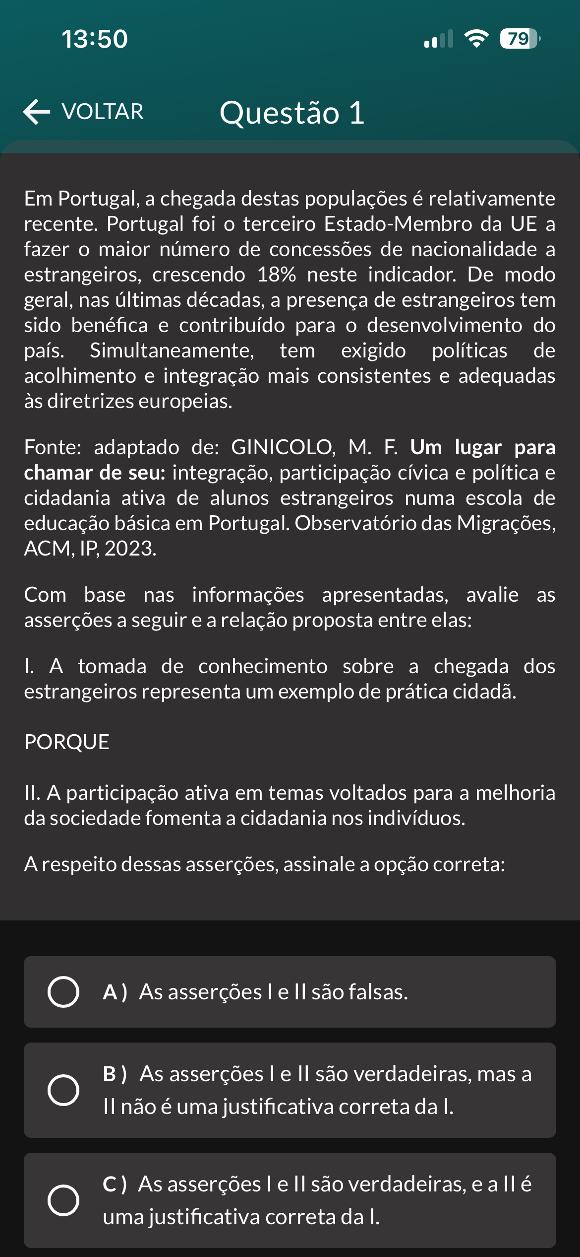 13:50 79 VOLTAR Questão 1 Em Portugal, a chegada destas populações é relativamente recente. Portugal foi terceiro Estado-Membro da UE a fazer maior número de concessões de nacionalidade a estrangeiros, crescendo 18% neste indicador. De modo geral, nas últimas décadas, a presença de estrangeiros tem sido benéfica e contribuído para desenvolvimento do país. Simultaneamente, tem exigido políticas de acolhimento e integração mais consistentes e adequadas às diretrizes europeias. Fonte: adaptado de: GINICOLO, F. Um lugar para chamar de seu: integração, participação cívica e política e cidadania ativa de alunos estrangeiros numa escola de educação básica em Portugal. Observatório das Migrações, IP, 2023. Com base nas informações apresentadas, avalie as asserções a seguir e a relação proposta entre elas: I. A tomada de conhecimento sobre a chegada dos estrangeiros representa um exemplo de prática cidadã. PORQUE II. A participação ativa em temas voltados para a melhoria da sociedade fomenta a cidadania nos indivíduos. A respeito dessas asserções, assinale a opção correta: A) As asserções le são falsas. B) As asserções e são verdadeiras, mas a não é uma justificativa correta da I. C) As asserções le são verdadeiras, e a é uma justificativa correta da I.