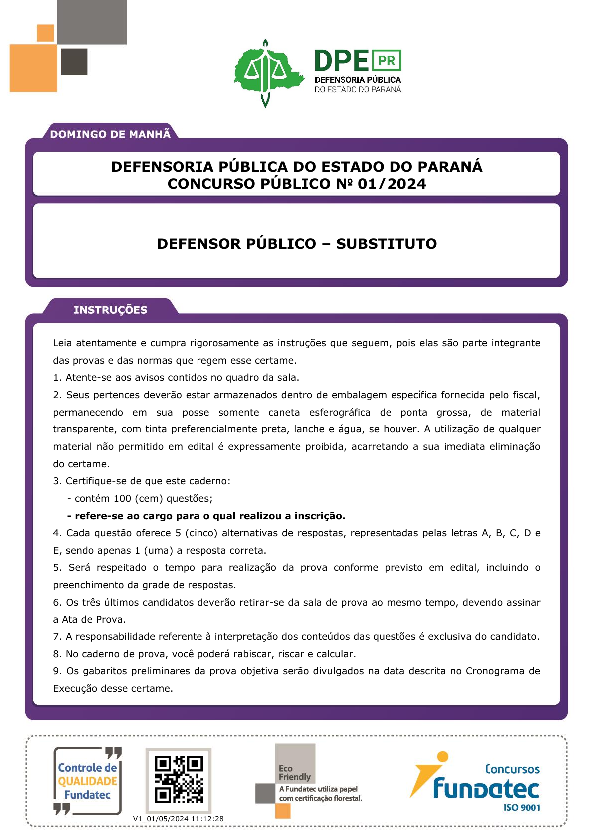 pcimarkpci MjgwNDowN2YxOmUyMjQ6MmY0Zjo2OWM1OmRhYTA6OTI2OTpiMDli:TW9uLCAyOSBTZXAgMjAyNSAxNjoxMDoxOSAtMDMwMA== www.pciconcursos.com.br DEFENSORIA PÚBLICA DO ESTADO DO PARANÁ CONCURSO PÚBLICO Nº 01/2024 DEFENSOR PÚBLICO – SUBSTITUTO Leia atentamente e cumpra rigorosamente as instruções que seguem, pois elas são parte integrante das provas e das normas que regem esse certame. 1. Atente-se aos avisos contidos no quadro da sala. 2. Seus pertences deverão estar armazenados dentro de embalagem específica fornecida pelo fiscal, permanecendo em sua posse somente caneta esferográfica de ponta grossa, de material transparente, com tinta preferencialmente preta, lanche e água, se houver. A utilização de qualquer material não permitido em edital é expressamente proibida, acarretando a sua imediata eliminação do certame. 3. Certifique-se de que este caderno: - contém 100 (cem) questões; - refere-se ao cargo para o qual realizou a inscrição. 4. Cada questão oferece 5 (cinco) alternativas de respostas, representadas pelas letras A, B, C, D e E, sendo apenas 1 (uma) a resposta correta. 5. Será respeitado o tempo para realização da prova conforme previsto em edital, incluindo o preenchimento da grade de respostas. 6. Os três últimos candidatos deverão retirar-se da sala de prova ao mesmo tempo, devendo assinar a Ata de Prova. 7. A responsabilidade referente à interpretação dos conteúdos das questões é exclusiva do candidato. 8. No caderno de prova, você poderá rabiscar, riscar e calcular. 9. Os gabaritos preliminares da prova objetiva serão divulgados na data descrita no Cronograma de Execução desse certame. QR code V1_01/05/2024 11:12:28 pcimarkpci MjgwNDowN2YxOmUyMjQ6MmY0Zjo2OWM1OmRhYTA6OTI2OTpiMDli:TW9uLCAyOSBTZXAgMjAyNSAxNjoxMDoxOSAtMDMwMA== www.pciconcursos.com.br 878_BASE_NS_DM Execução: Fundatec DEFENSOR PÚBLICO – SUBSTITUTO 20/6/202416:34:06 (Pontos de domínio público. Compilação constante do álbum “Tecnomacumba”, 2006, de Rita Benneditto). A Iyalorixá Mãe Menininha, sacerdotisa de um terreiro de Candomblé localizado há 50 anos no bairro Pinheirinho, em Curitiba, tem como novo vizinho o senhor João, o qual realizou denúncias contra sua pessoa à polícia alegando: (a) maus tratos a animais durante as práticas religiosas; (b) sonegação de imposto (IPTU); (c) e perturbação de sossego. A Iyalorixá recebe a intimação da delegacia de polícia para esclarecimentos, mas antes de comparecer no dia e hora marcados, ela procura orientação jurídica junto ao Núcleo de Promoção da Igualdade Racial da Defensoria Pública. Tomando por base a situação hipotética acima e considerando a existência e as práticas dos povos e comunidades de terreiro, bem como o que dispõe a Constituição da República e o posicionamento do Supremo Tribunal Federal, assinale a alternativa que apresenta as corretas orientações a serem prestadas pelo defensor público. A) Comunidades de terreiro não possuem autorização para prática religiosa com animais em razão de vedação constitucional aos maus tratos de animais e, ainda, em razão da ausência do pagamento de IPTU, os cultos do terreiro de Candomblé da situação acima devem ser interrompidos. Além disso, há prevalência da intimidade ser resguardada, no caso da perturbação do sossego, motivo pelo qual o lugar da prática religiosa deve ser alterado. B) Povos e comunidades de terreiro têm sido historicamente vítimas de intolerância, de discriminação e de preconceito. Assim, a Iyalorixá deverá ser orientada a buscar subvenção dos cultos e relação de aliança junto ao Município em razão do patrimônio histórico e cultural como estratégia para evitar o agravamento da situação antes de comparecer à delegacia. Por fim, quanto à perturbação de sossego, pela interpretação do princípio da dignidade da pessoa humana e da intimidade, o vizinho pode interromper a prática religiosa quando essa ocorrer. C) Há proteção constitucional ao local da comunidade de terreiro do caso acima onde ocorre a prática de Candomblé como manifestação afro-brasileira, incluindo a isenção tributária em questão, estando assegurada a sacralização de animais durante suas práticas religiosas, uma vez que a legislação não proíbe matar animais. Quanto à alegação de perturbação de sossego, deverá ser aplicada a ponderação e a regra da proporcionalidade. D) As comunidades de terreiro são protegidas pela legislação constitucional e supralegal apenas sob o viés da religiosidade, não ensejando a aplicação da Convenção 169 da Organização Internacional do Trabalho quanto ao seu modo de ser e viver. Assim, os direitos no caso em comento são preponderantemente de ordem individual e devem ser analisados pelo princípio da proporcionalidade. E) Há nítido racismo religioso na postura do vizinho da Iyalorixá, porém há restrição para o abate de animais em comunidades de terreiro por situação análoga à vedação das brigas de galo, farra do boi e vaquejada já decididos pelo Supremo Tribunal Federal. Por fim, quanto à alegação de perturbação de sossego, deverá ser aplicada a ponderação interpretativa e a regra da proporcionalidade. DIREITO CONSTITUCIONAL QUESTÃO 01 – Analise a situação hipotética a seguir: “Na gira, cantavam: Balorê Exú, Exú é Mojubá / Ogunhé Patacuri / Ogum é Orixá! / Kao Cabicile Xangô / Kao meu pai! / Okê Arô / Oxossi é Caçador! / Ewê / Arroboboia Oxumaré Roboboia! / Eparrei / Ora ieie o mãe Oxum / Ora ieie o / Ô docyaba Yemanja / Ôdoia mamãe...”. pcimarkpci MjgwNDowN2YxOmUyMjQ6MmY0Zjo2OWM1OmRhYTA6OTI2OTpiMDli:TW9uLCAyOSBTZXAgMjAyNSAxNjoxMDoxOSAtMDMwMA== www.pciconcursos.com.br 878_BASE_NS_DM Execução: Fundatec DEFENSOR PÚBLICO – SUBSTITUTO 20/6/202416:34:06 QUESTÃO 02 – “Há um sentido agônico ou agonista na política que é preciso ser explorado na Constituição [...]. Precisamos de uma Constituição