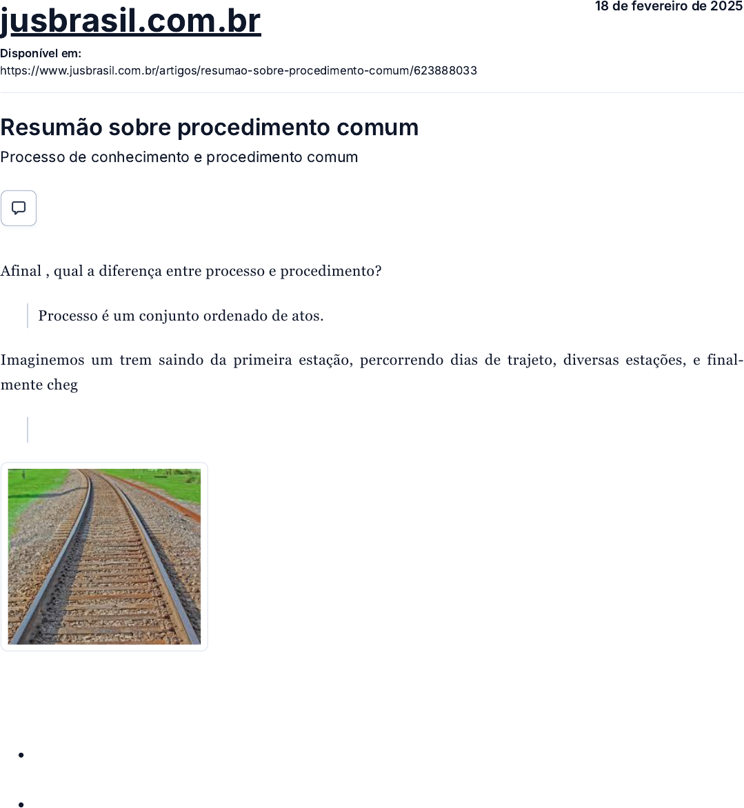 jusbrasil.com.br 18 de fevereiro de 2025 Disponível em: https://www.jusbrasil.com.br/artigos/resumao-sobre-procedimento-comum/623888033 Resumão sobre procedimento comum Processo de conhecimento e procedimento comum Afinal , qual a diferença entre processo e procedimento? Processo é um conjunto ordenado de atos. Imaginemos um trem saindo da primeira estação, percorrendo dias de trajeto, diversas estações, e final- mente chegando a estação final. Os trilhos percorridos pelo trem seriam atos do processo. Logo: Processo é um ordenado de vários atos. Já o procedimento é a ritualística, é o modo de como os atos são praticados. Algumas notas sobre procedimento: Cada processo tem seus próprios procedimentos. Há procedimentos mais céleres outros com mais atos processuais,mais específicos. É Matéria de ordem pública, ou seja não pode ser objeto de escolha das partes. No processo de conhecimento – há os seguintes procedimentos: 1) PROCEDIMENTO COMUM – é o procedimento padrão a ser utilizado na maior parte das causas. É uma espécie de processo "coringa" (Art 318) 2) PROCEDIMENTO ESPECIAL -Apresenta distinção em relação ao procedimento comum, de modo a decidir a lide de maneira mais adequada. (título III – parte especial do livro I) exemplo: ação de consignação em pagamento. Os procedimentos especiais tem regras próprias no entanto as DISPOSIÇÕES DO PROCEDI- MENTO COMUM são aplicáveis subsidiariamente aos procedimentos especiais quando couber. 18/02/2025, 10:24 Resumão sobre procedimento comum | Jusbrasil https://www.jusbrasil.com.br/artigos/resumao-sobre-procedimento-comum/623888033 1/6 obs: O processo de execução, de forma breve, coexistem diversos tipos de procedimento , cada um cor- respondente a cada uma das diversas espécies de execução. (livro II). PROCEDIMENTO COMUM No que tange o procedimento comum há importância mudança do CPC DE 73 para o NOVOCPC. O procedi- mento comum se dividia em rito sumario e ordinário. No novo cpc houve a extinção do rito sumario, assim não mais se justifica a existência do rito ordinário. Logo, no novo CPC somente existe processo de conhecimento: processo de conhecimento co- mum (art. 318 seguintes) e especial ( art. 539 seguintes) É utilizado o procedimento comum por exclusão: se não for hipótese de algum procedimento especial (pre- visto no cpc ou lei extravagante)é procedimento comum. Portanto, é o procedimento residual. De forma pratica, será procedimento comum nos casos: Em que o autor não possui um titulo executivo extrajudicial Não seja a hipótese de tutela de urgência É o procedimento regulado com mais detalhes pelo cpc, o mais completo, com maior numero de atos (inicial, contestação, replica,...) fases mais facilmente distinguíveis (postulatória, saneadora, instrutória, decisória, e cumprimento da sentença). 3.1 – Petição inicial (art 319) A petição inicial age como um espécie de "receita de bolo", um "passo a passo" a ser seguido. Caso a petição não trouxer alguns dos requisitos , o juiz determinara a emenda da inicial. Contudo, se o autor não proceder com a emenda, haverá o indeferimento da inicial, com a extinção do processo sem a resolução do mérito. (Art 485 I). E, se o vício da inicial for grave ,e sequer permitir a emenda, poderá desde logo o magistrado extinguir o pro- cesso (art 330). Nessa situação fala-se em INDEFERIMENTO LIMINAR DA INICIAL. Hipótese em que o proce- dimento é extinto SEM RESOLUÇÃO DE MÉRITO . 3.2 – Causa de pedir São os fatos e fundamentos jurídicos do pedido – Por que o autor pede em juízo determinada providencia. Fundamentos jurídicos é diferente de fundamentos legais (base legal,artigo legal). Para que aja a alteração na causa de pedir, após o ajuizamento da inicial deve ser observado o art 329: 1. Até a citação – sem qualquer restrição. Basta petição do autor. 2. Após a citação - Desde que o réu concorde, no prazo mínimo de 15 dias. 3.3 - Pedido É aquilo que o autor pede quando aciona o judiciário . Como regra deve ser certo e determinado. (art 322 e 324). Ainda que a parte não peça, compreende-se no pedido (por isso a doutrina chama de implícito): 18/02/2025, 10:24 Resumão sobre procedimento comum | Jusbrasil https://www.jusbrasil.com.br/artigos/resumao-sobre-procedimento-comum/623888033 2/6 https://www.jusbrasil.com.br/legislacao/174276278/lei-13105-15 https://www.jusbrasil.com.br/legislacao/174276278/lei-13105-15 https://www.jusbrasil.com.br/legislacao/174276278/lei-13105-15 https://www.jusbrasil.com.br/legislacao/174276278/lei-13105-15 https://www.jusbrasil.com.br/legislacao/174276278/lei-13105-15 (i) Juros legais (ii) Correção monetária (iii) Verbas de sucumbência, ou seja, custasse honorários (iv) Prestações sucessivas que se vencerem durante o processo enquanto durar a obrigação art 323 (v) Multa diária nos casos específicos art 536 caput e $1º 3.3.1 Da Interpretação do pedido: Conforme art 322 $2º o juiz terá mais margem para interpretar o pedido – não considerando apenas o que esta sendo pedido na inicial e sim na peça como um todo. 3.3.2 Da exceção do pedido certo e terminado Apesar de a regra ser a determinação do pedido, cpc admite o pedido genérico em hipóteses especifica (art 324 $ 1º inciso I, II e III). 3.3.3 Do pedido alternativo Aquele em que o autor formula 2 pedidos para ver acolhido um – ex: pede-se o dinheiro de volta ou entrega do bem. (art 325) 3.3.4 Pedido subsidiário Se verifica quando um autor formula um pedido principal e somente se este não puder ser acolhido, formula um pedido subsidiário/eventual. (art 326). 3.3.5 Da alteração do pedido Para que aja a alteração no pedido, após o ajuizamento da inicial deve ser observado o art 329: (3) Até a citação – sem qualquer restrição. Basta petição do autor. (4) Após a citação - Desde que o reu concorde, no prazo mínimo de 15 dias 4- Audiência de conciliação ou me