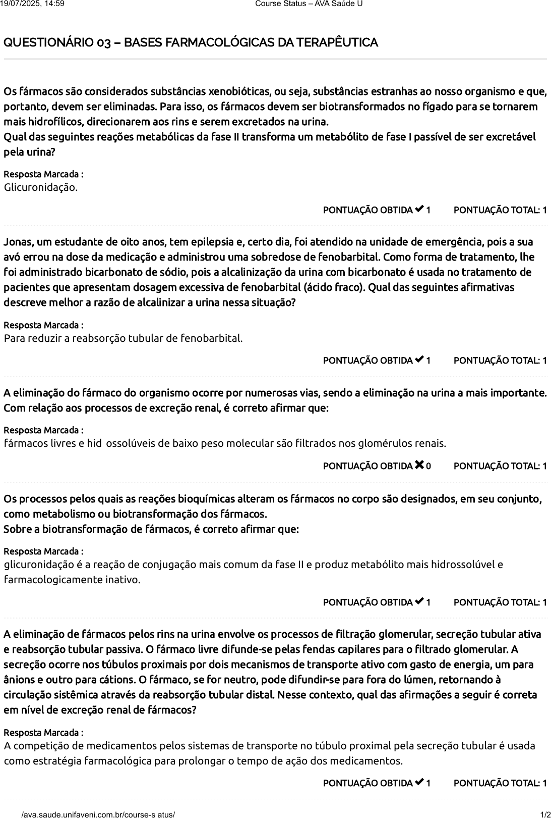 QUESTIONÁRIO 03 – BASES FARMACOLÓGICAS DA TERAPÊUTICA PONTUAÇÃO TOTAL: 1PONTUAÇÃO OBTIDA 1 Os fármacos são considerados substâncias xenobióticas, ou seja, substâncias estranhas ao nosso organismo e que, portanto, devem ser eliminadas. Para isso, os fármacos devem ser biotransformados no fígado para se tornarem mais hidrofílicos, direcionarem aos rins e serem excretados na urina. Qual das seguintes reações metabólicas da fase II transforma um metabólito de fase I passível de ser excretável pela urina? Resposta Marcada : Glicuronidação. PONTUAÇÃO TOTAL: 1PONTUAÇÃO OBTIDA 1 Jonas, um estudante de oito anos, tem epilepsia e, certo dia, foi atendido na unidade de emergência, pois a sua avó errou na dose da medicação e administrou uma sobredose de fenobarbital. Como forma de tratamento, lhe foi administrado bicarbonato de sódio, pois a alcalinização da urina com bicarbonato é usada no tratamento de pacientes que apresentam dosagem excessiva de fenobarbital (ácido fraco). Qual das seguintes afirmativas descreve melhor a razão de alcalinizar a urina nessa situação? Resposta Marcada : Para reduzir a reabsorção tubular de fenobarbital. PONTUAÇÃO TOTAL: 1PONTUAÇÃO OBTIDA 0 A eliminação do fármaco do organismo ocorre por numerosas vias, sendo a eliminação na urina a mais importante. Com relação aos processos de excreção renal, é correto afirmar que: Resposta Marcada : fármacos livres e hidrossolúveis de baixo peso molecular são filtrados nos glomérulos renais. PONTUAÇÃO TOTAL: 1PONTUAÇÃO OBTIDA 1 Os processos pelos quais as reações bioquímicas alteram os fármacos no corpo são designados, em seu conjunto, como metabolismo ou biotransformação dos fármacos. Sobre a biotransformação de fármacos, é correto afirmar que: Resposta Marcada : glicuronidação é a reação de conjugação mais comum da fase II e produz metabólito mais hidrossolúvel e farmacologicamente inativo. PONTUAÇÃO TOTAL: 1PONTUAÇÃO OBTIDA 1 A eliminação de fármacos pelos rins na urina envolve os processos de filtração glomerular, secreção tubular ativa e reabsorção tubular passiva. O fármaco livre difunde-se pelas fendas capilares para o filtrado glomerular. A secreção ocorre nos túbulos proximais por dois mecanismos de transporte ativo com gasto de energia, um para ânions e outro para cátions. O fármaco, se for neutro, pode difundir-se para fora do lúmen, retornando à circulação sistêmica através da reabsorção tubular distal. Nesse contexto, qual das afirmações a seguir é correta em nível de excreção renal de fármacos? Resposta Marcada : A competição de medicamentos pelos sistemas de transporte no túbulo proximal pela secreção tubular é usada como estratégia farmacológica para prolongar o tempo de ação dos medicamentos. 19/07/2025, 14:59 Course Status – AVA Saúde Unifaveni https://ava.saude.unifaveni.com.br/course-status/ 1/2 4 / 5Total de Pontos 19/07/2025, 14:59 Course Status – AVA Saúde Unifaveni https://ava.saude.unifaveni.com.br/course-status/ 2/2