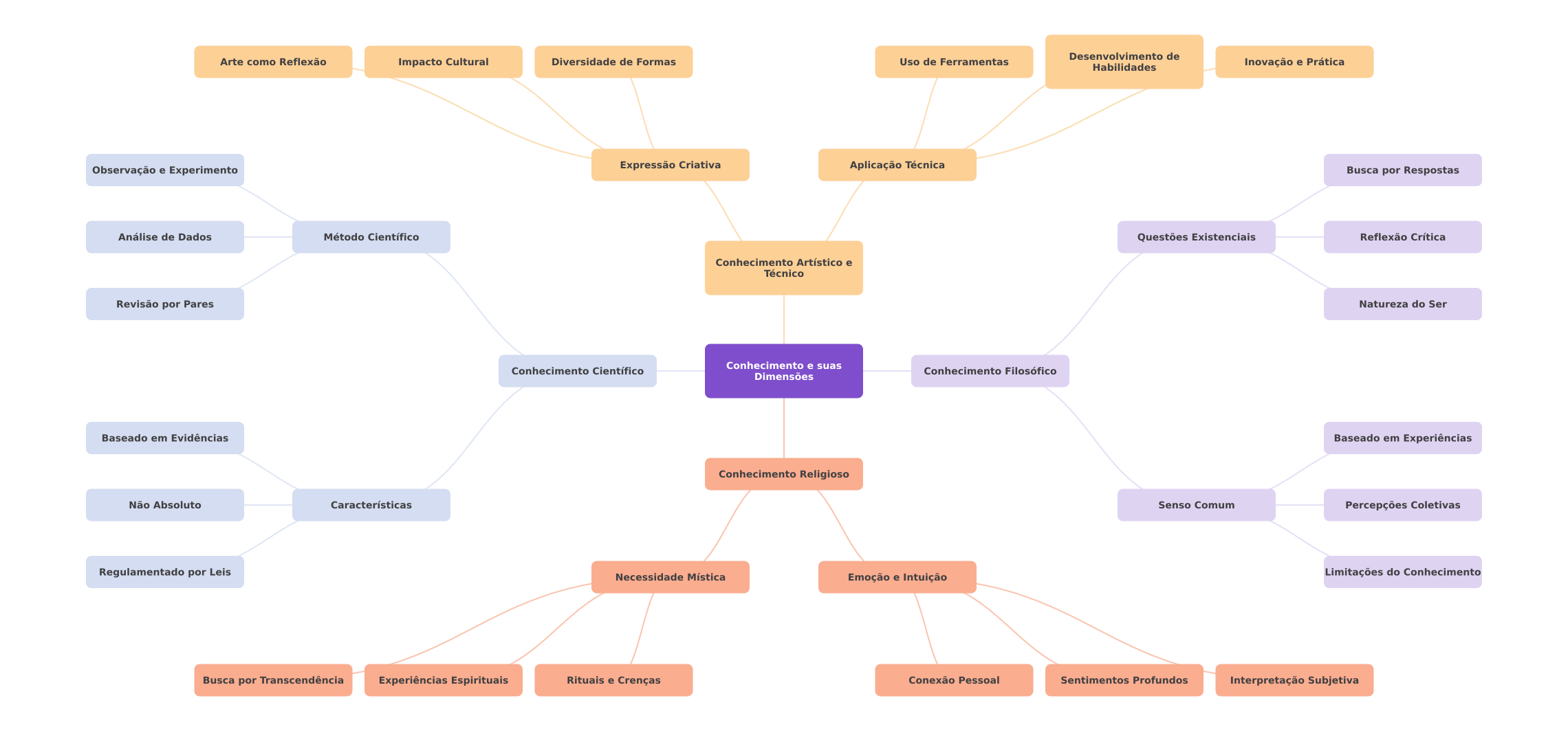 Desenvolvimento de Arte como Reflexão Impacto Cultural Diversidade de Formas Uso de Ferramentas Habilidades Inovação e Prática Observação e Experimento Expressão Criativa Aplicação Técnica Busca por Respostas Análise de Dados Método Científico Questões Existenciais Reflexão Crítica Conhecimento Artístico e Técnico Revisão por Pares Natureza do Ser Conhecimento Científico Conhecimento e suas Conhecimento Filosófico Dimensões Baseado em Evidências Baseado em Experiências Conhecimento Religioso Não Absoluto Características Senso Comum Percepções Coletivas Regulamentado por Leis Necessidade Mística Emoção e Intuição Limitações do Conhecimento Busca por Transcendência Experiências Espirituais Rituais e Crenças Conexão Pessoal Sentimentos Profundos Interpretação Subjetiva