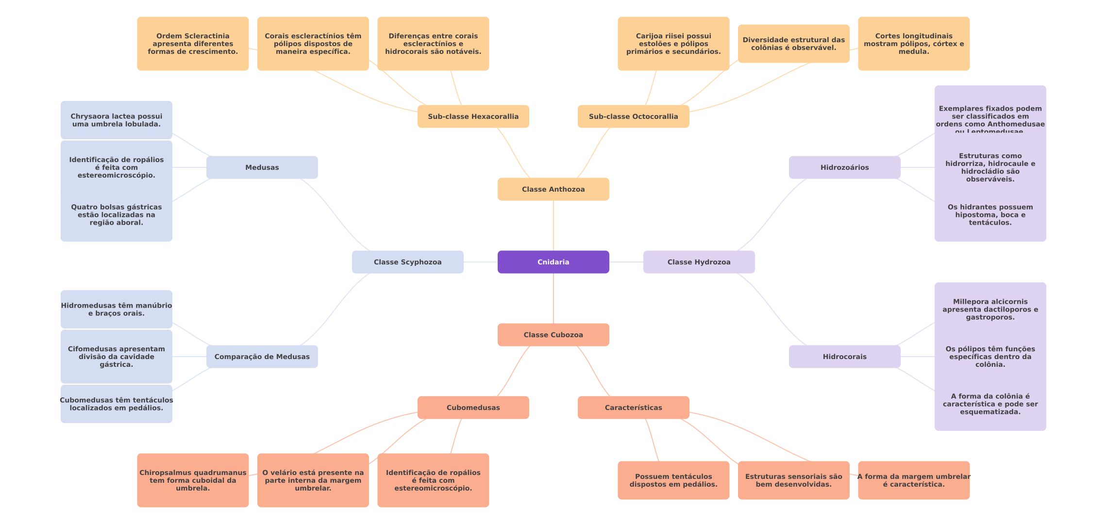 Ordem Scleractinia Corais escleractínios têm Diferenças entre corais Carijoa riisei possui Diversidade estrutural das Cortes longitudinais apresenta diferentes pólipos dispostos de escleractínios e estolões e pólipos colônias é observável. mostram pólipos, córtex e formas de crescimento. maneira específica. hidrocorais são notáveis. primários e secundários. medula. Exemplares fixados podem Chrysaora lactea possui Sub-classe Hexacorallia Sub-classe Octocorallia ser classificados em uma umbrela lobulada. ordens como Anthomedusae ou entomedusae Estruturas como Identificação de ropálios Medusas Hidrozoários hidrorriza, hidrocaule e é feita com hidrocládio são estereomicroscópio. observáveis. Classe Anthozoa Quatro bolsas gástricas Os hidrantes possuem estão localizadas na hipostoma, boca e região aboral. tentáculos. Classe Scyphozoa Cnidaria Classe Hydrozoa Hidromedusas têm manúbrio Millepora alcicornis e braços orais. apresenta dactiloporos e gastroporos. Classe Cubozoa Cifomedusas apresentam Os pólipos têm funções divisão da cavidade Comparação de Medusas Hidrocorais específicas dentro da gástrica. colônia. A forma da colônia é Cubomedusas têm tentáculos localizados em pedálios. Cubomedusas Características característica e pode ser esquematizada. Chiropsalmus quadrumanus velário está presente na Identificação de ropálios Possuem tentáculos Estruturas sensoriais são tem forma cuboidal da parte interna da margem é feita com forma da margem umbrelar umbrela. dispostos em pedálios. bem desenvolvidas. é característica. umbrelar. estereomicroscópio.