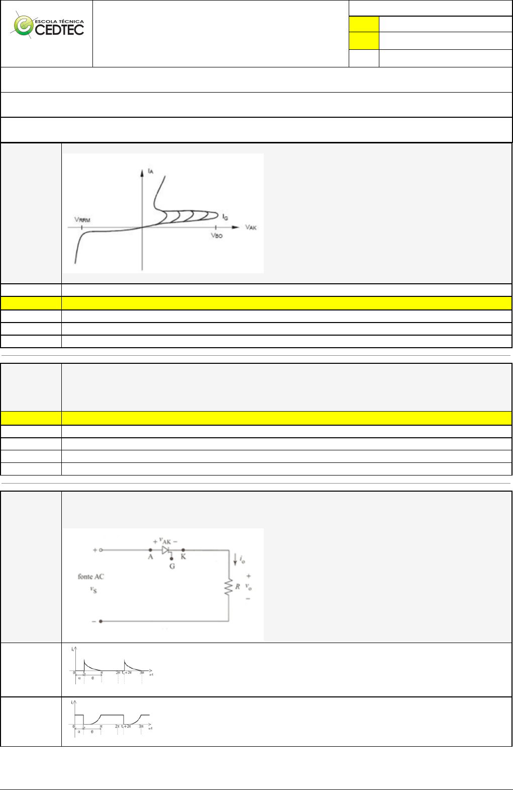 Pincel Atômico - 04/10/2025 12:49:47 1/2 MAYCON GOMES DE PAULA DIAS Exercício Caminho do Conhecimento - Etapa 6 (27273) Atividade finalizada em 31/08/2025 18:17:19 (4961888 / 1) LEGENDA Resposta correta na questão # Resposta correta - Questão Anulada X Resposta selecionada pelo Aluno Disciplina: ELETRÔNICA DE POTÊNCIA [1617495] - Avaliação com 4 questões, com o peso total de 6,50 pontos [capítulos - 113] Turma: Curso Técnico: Eletrotécnica - Grupo: ABRIL/25 PRES - ELEGUA.ABR25.NOT [167686] Aluno(a): 91510257 - MAYCON GOMES DE PAULA DIAS - Respondeu 4 questões corretas, obtendo um total de 6,50 pontos como nota [350059_188717] Questão 001 Considere a curva característica representada abaixo. Esta curva refere-se ao dispositivo: PTC X SCR SBS DIAC PUT [350058_188713] Questão 002 A respeito do SCR, dispositivo de potência de estado sólido muito utilizado na eletrônica industrial, analise as afirmativas a seguir. I. O SCR possui sua construção realizada em 4 camadas tipo p e n, resultando em PNPN. II. Para que o SCR entre em condução, além de estar diretamente polarizado, um pulso de tensão positiva deve ser aplicado no gatilho. III. O gatilho deve permanecer com corrente para manter o SCR conduzindo. Está CORRETO o que se apresenta em: X I e II, somente II, somente. III, somente I, somente II e III, somente. [350058_188715] Questão 003 O circuito da figura abaixo é de um retificador monofásico controlado de meia onda sendo alimentado por uma fonte de tensão (Vs) AC, a qual possui semiciclo positivo no intervalo de 0 a π e de 2π a 3π e semiciclo negativo no intervalo de π a 2π. Sabendo que α é o ângulo de disparo do SCR e θ é o ângulo de condução, assinale a alternativa que mostra a forma de onda referente ao comportamento da corrente i. Pincel Atômico - 04/10/2025 12:49:47 2/2 X [350058_188714] Questão 004 O circuito apresentado na figura abaixo se refere ao: Retificador monofásico, de onda completa, a diodo. X Retificador trifásico de onda completa, a Tiristor. Retificador monofásico, de onda completa, a Tiristor. Retificador trifásico de onda completa, a diodo. Retificador trifásico de meia onda, a diodo.