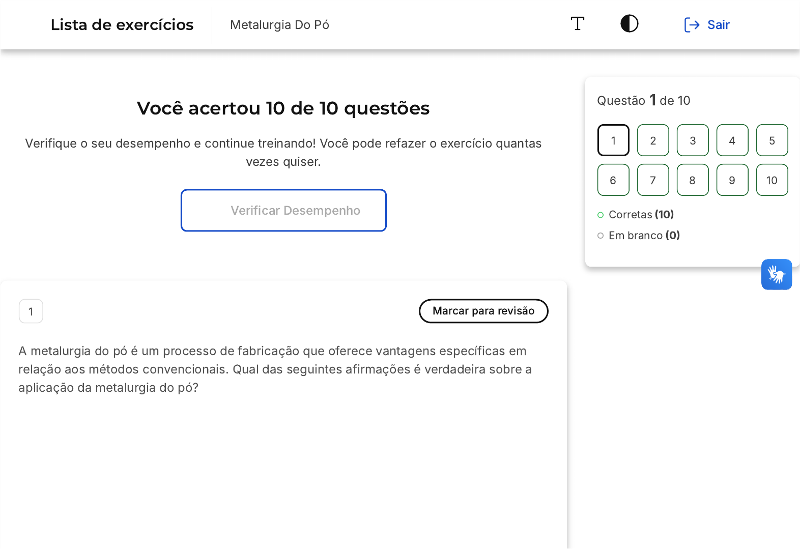 Você acertou 10 de 10 questões Verifique o seu desempenho e continue treinando! Você pode refazer o exercício quantas vezes quiser. Verificar Desempenho 1 Marcar para revisão A metalurgia do pó é um processo de fabricação que oferece vantagens específicas em relação aos métodos convencionais. Qual das seguintes afirmações é verdadeira sobre a aplicação da metalurgia do pó? Questão 1 de 10 Corretas (10) Em branco (0) 1 2 3 4 5 6 7 8 9 10 Lista de exercícios Metalurgia Do Pó Sair A B C D E As peças feitas por metalurgia do pó são mais caras do que as produzidas por métodos convencionais. A metalurgia do pó é viável apenas para a produção de peças de formato complexo. As peças feitas por metalurgia do pó não apresentam propriedades superiores em relação às produzidas por métodos convencionais. A metalurgia do pó permite a fabricação de peças sob medida com alta precisão e prontas para instalação. A metalurgia do pó é um processo ineficiente, resultando em desperdício significativo. Resposta correta Parabéns, você selecionou a alternativa correta. Confira o gabarito comentado! Gabarito Comentado Uma das vantagens da metalurgia do pó é a capacidade de produzir peças sob medida com alta precisão e prontas para instalação. Esse processo permite a fabricação de peças de formato simples com mínima perda de material, garantindo um alto nível de precisão dimensional. Além disso, as peças fabricadas pela metalurgia do pó exibem A B C D E propriedades superiores que não podem ser alcançadas por métodos convencionais, tornando-as ideais para aplicações específicas que requerem características únicas. 2 Marcar para revisão A metalurgia do pó é um processo de fabricação utilizado para produzir peças metálicas a partir de pós de metal compactados e posteriormente sinterizados. Quais são exemplos típicos de produtos fabricados por meio da metalurgia do pó? Rodas de alumínio. Parafusos de aço inoxidável. Chapas de cobre. Hastes de soldagem. Barras de ferro. A B Resposta correta Parabéns, você selecionou a alternativa correta. Confira o gabarito comentado! Gabarito Comentado Hastes de soldagem são exemplos típicos de produtos fabricados pela metalurgia do pó. A metalurgia do pó permite a produção de peças complexas com alta densidade e precisão dimensional, sendo especialmente adequada para a fabricação de hastes de soldagem utilizadas em processos de união de materiais. As hastes de soldagem produzidas por meio da metalurgia do pó apresentam características desejáveis, como composição química homogênea, resistência mecânica adequada e propriedades de soldagem consistentes, tornando-as uma escolha comum na indústria. 3 Marcar para revisão Para produzir química e estrutura uniformes em um produto em pó misturado, deve ocorrer: Difusão suficiente durante a operação de sinterização. Adição de aglutinantes para compor a estrutura do produto final. C D E Resfriamento abrupto do pó após a operação de sinterização. Fusão do pó durante a operação de compactação. Solidificação do pó durante a operação de sinterização. Resposta correta Parabéns, você selecionou a alternativa correta. Confira o gabarito comentado! Gabarito Comentado A alternativa correta é a "A". A sinterização é um processo que envolve o aquecimento de um pó até uma temperatura abaixo do seu ponto de fusão, com o objetivo de aumentar a sua resistência. Durante este processo, a difusão dos átomos ocorre, o que leva a uma estrutura e química uniformes no produto final. Portanto, para produzir química e estrutura uniformes em um produto em pó misturado, é necessário que haja difusão suficiente durante a operação de sinterização. 4 Marcar para revisão A metalurgia do pó utiliza pó de metais para formar objetos metálicos desejados. Aplica-se A B C D E a metalurgia do pó a peças: Com baixo volume de produção e peças pequenas de alta precisão. Com alto volume de produção e peças pequenas de pequena precisão. Com alto volume de produção e peças pequenas de alta precisão. Com graus controlados de porosidade e passíveis de serem produzidas por outros métodos de fabricação. Onde as propriedades e características desejadas seriam fáceis de obter por qualquer outro método de fabricação. Resposta correta Parabéns, você selecionou a alternativa correta. Confira o gabarito comentado! Gabarito Comentado A metalurgia do pó é um processo que permite a produção de peças metálicas com alto volume e alta precisão. Isso é possível porque o pó metálico pode ser moldado e compactado em formas específicas antes de ser aquecido para formar uma peça A B C sólida. Portanto, a alternativa correta é "Com alto volume de produção e peças pequenas de alta precisão". 5 Marcar para revisão Na Metalurgia do Pó, a sinterização é uma etapa fundamental para a consolidação e ligação das partículas de pó, resultando em peças sólidas. Em alguns casos, a sinterização é realizada em atmosferas específicas para obter propriedades desejadas em materiais como aço inoxidável, titânio e metais refratários. Qual é uma das atmosferas comumente utilizadas durante a sinterização na Metalurgia do Pó, especialmente para materiais como aço inoxidável, titânio e metais refratários? Atmosfera de oxigênio. Atmosfera de hidrogênio. Atmosfera de nitrogênio. D E Atmosfera de dióxido de carbono. Atmosfera de hélio. Resposta correta Parabéns, você selecionou a alternativa correta. Confira o gabarito comentado! Gabarito Comentado Durante a sinterização na Metalurgia do Pó, especialmente para materiais como aço inoxidável, titânio e metais refratários, é comum utilizar atmosferas controladas para obter as propriedades desejadas nas peças finais. Uma das atmosferas frequentemente empregadas é a de nitrogênio. A atmosfera de nitrogênio ajuda a prevenir a oxidação