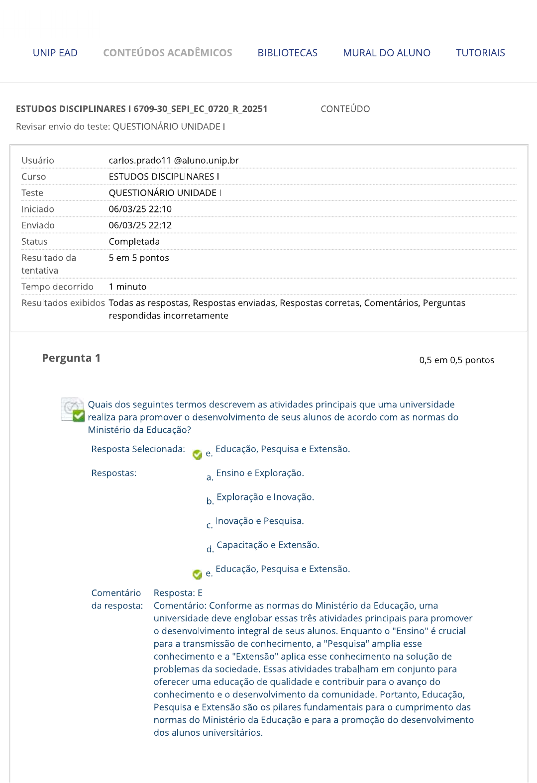 UNIP EAD CONTEÚDOS ACADÊMICOS BIBLIOTECAS MURAL DO ALUNO TUTORIAIS ESTUDOS DISCIPLINARES I 6709-30_SEPI_EC_0720_R_20251 CONTEÚDO Revisar envio do teste: QUESTIONÁRIO UNIDADE Usuário carlos.prado11 @aluno.unip.br Curso ESTUDOS DISCIPLINARES Teste QUESTIONÁRIO UNIDADE Iniciado 06/03/25 22:10 Enviado 06/03/25 22:12 Status Completada Resultado da 5 em 5 pontos tentativa Tempo decorrido 1 minuto Resultados exibidos Todas as respostas, Respostas enviadas, Respostas corretas, Comentários, Perguntas respondidas incorretamente Pergunta 1 0,5 em 0,5 pontos Quais dos seguintes termos descrevem as atividades principais que uma universidade realiza para promover o desenvolvimento de seus alunos de acordo com as normas do Ministério da Educação? Resposta Selecionada: e. Educação, Pesquisa e Extensão. Respostas: a. Ensino e Exploração. b. Exploração e Inovação. Inovação e Pesquisa. d. Capacitação e Extensão. Educação, Pesquisa e Extensão. e. Comentário Resposta: E da resposta: Comentário: Conforme as normas do Ministério da Educação, uma universidade deve englobar essas três atividades principais para promover desenvolvimento integral de seus alunos. Enquanto "Ensino" é crucial para a transmissão de conhecimento, a "Pesquisa" amplia esse conhecimento e a "Extensão" aplica esse conhecimento na solução de problemas da sociedade. Essas atividades trabalham em conjunto para oferecer uma educação de qualidade e contribuir para o avanço do conhecimento e 0 desenvolvimento da comunidade. Portanto, Educação, Pesquisa e Extensão são os pilares fundamentais para cumprimento das normas do Ministério da Educação e para a promoção do desenvolvimento dos alunos universitários.Pergunta 2 0,5 em 0,5 pontos Qual das seguintes ações é frequentemente realizada por indivíduos que se destacam no mercado de trabalho? Resposta Selecionada: d. Planejar suas carreiras com base no autoconhecimento. Respostas: a. Seguir tendências aleatórias. b. Mudar de emprego a cada seis meses. Depender inteiramente da sorte. d. Planejar suas carreiras com base no autoconhecimento e. Ignorar o desenvolvimento pessoal. Comentário Resposta: D da resposta: Comentário: Indivíduos que se destacam no mercado de trabalho geralmente têm sucesso porque dedicam tempo para entender suas próprias habilidades, interesses, valores e metas (autoconhecimento) e, em seguida, planejam suas carreiras de acordo com essas informações. Isso lhes permite fazer escolhas conscientes e alinhadas com suas ambições, maximizando suas chances de sucesso e satisfação profissional. Pergunta 3 0,5 em 0,5 pontos Qual prática é essencial para desenvolvimento profissional contínuo? Resposta Selecionada: d. Manter aprendizado de forma contínua. Respostas: Parar de aprender depois da formação acadêmica. a. b. Contar exclusivamente com a experiência anterior. Mudar de área a cada ano. d. Manter o aprendizado de forma contínua. Basear-se apenas em habilidades básicas. e. Comentário Resposta: D da resposta: Comentário: Para manter-se atualizado e relevante em um ambiente de trabalho em constante evolução, é crucial que os profissionais continuem aprendendo e se atualizando ao longo de suas carreiras. Isso envolve buscar novos conhecimentos, habilidades e técnicas, seja por meio de cursos, treinamentos, leituras ou outras formas de educação continuada. aprendizado contínuo não apenas aumenta a empregabilidade, mas também promove crescimento pessoal e profissional.Pergunta 4 0,5 em 0,5 pontos Por que pode haver mais vagas abertas do que candidatos a um emprego? Resposta Selecionada: d. Porque os candidatos estão desatualizados. Respostas: a. Porque os candidatos não estão interessados em trabalhar. b. Porque os candidatos estão muito exigentes. Por falta de oportunidades de treinamento. d. Porque os candidatos estão desatualizados. Porque as empresas oferecem salários muito baixos. e. Comentário Resposta: D da resposta: Comentário: Quando os candidatos estão desatualizados, significa que não possuem as habilidades ou conhecimentos necessários para preencher as vagas disponíveis. Isso pode resultar em um descompasso entre a oferta e a demanda de emprego, levando a mais vagas abertas do que candidatos qualificados. Portanto, é crucial para os candidatos manterem-se atualizados com as tendências e exigências do mercado de trabalho para aumentar suas chances de emprego. Pergunta 5 0,5 em 0,5 pontos Qual é conceito japonês que representa a busca pelo propósito e significado na vida? Resposta Selecionada: e. Ikigai. Respostas: Bushido. a. b. Karoshi. C. Satori. d. Kaizen. e. Ikigai. Comentário Resposta: E da resposta: Comentário: Ikigai é conceito japonês que representa a busca pelo propósito e significado na vida. Ele é essencialmente uma filosofia que enfatiza a importância de encontrar aquilo que traz sentido e satisfação para a existência. Baseado na ideia de que uma vida com propósito e significado é fundamental para uma existência plena e feliz, Ikigai envolve a descoberta e a exploração daquilo que nos faz sentir realizados, úteis e felizes. Ao entender e seguir nosso Ikigai, podemos viver uma vida mais autêntica, alinhada com nossos valores e paixões, que contribui para uma sensação de bem-estar e contentamento duradouro.Pergunta 6 0,5 em 0,5 pontos Qual das seguintes opções descreve melhor propósito da análise SWOT? Resposta d. Selecionada: Examinar os pontos fortes e fracos de uma empresa, bem como as oportunidades e ameaças do ambiente externo. Respostas: Avaliar a qualidade do café em uma cafeteria. a. b. Identificar os concorrentes de uma empresa. Analisar as tendências do mercado de ações. d. Examinar os pontos fortes e fracos de uma empresa, bem como as oportunidades e ameaças do ambiente externo. e. Estabelecer metas de vendas para próximo trimestre. Comentário Resposta: D da resposta: Comentário: A análise SWOT (Strengths, Weaknesses,