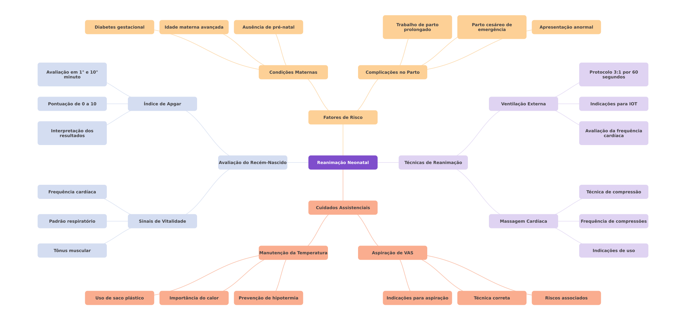 Trabalho de parto Parto cesáreo de Diabetes gestacional Idade materna avançada Ausência de pré-natal prolongado emergência Apresentação anormal Avaliação em 1° e 10° Condições Maternas Complicações no Parto Protocolo 3:1 por 60 minuto segundos Pontuação de 0 a 10 Índice de Apgar Ventilação Externa Indicações para IOT Fatores de Risco Interpretação dos Avaliação da frequência resultados cardíaca Avaliação do Recém-Nascido Reanimação Neonatal Técnicas de Reanimação Frequência cardíaca Técnica de compressão Cuidados Assistenciais Padrão respiratório Sinais de Vitalidade Massagem Cardíaca Frequência de compressões Tônus muscular Manutenção da Temperatura Aspiração de VAS Indicações de uso Uso de saco plástico Importância do calor Prevenção de hipotermia Indicações para aspiração Técnica correta Riscos associados
