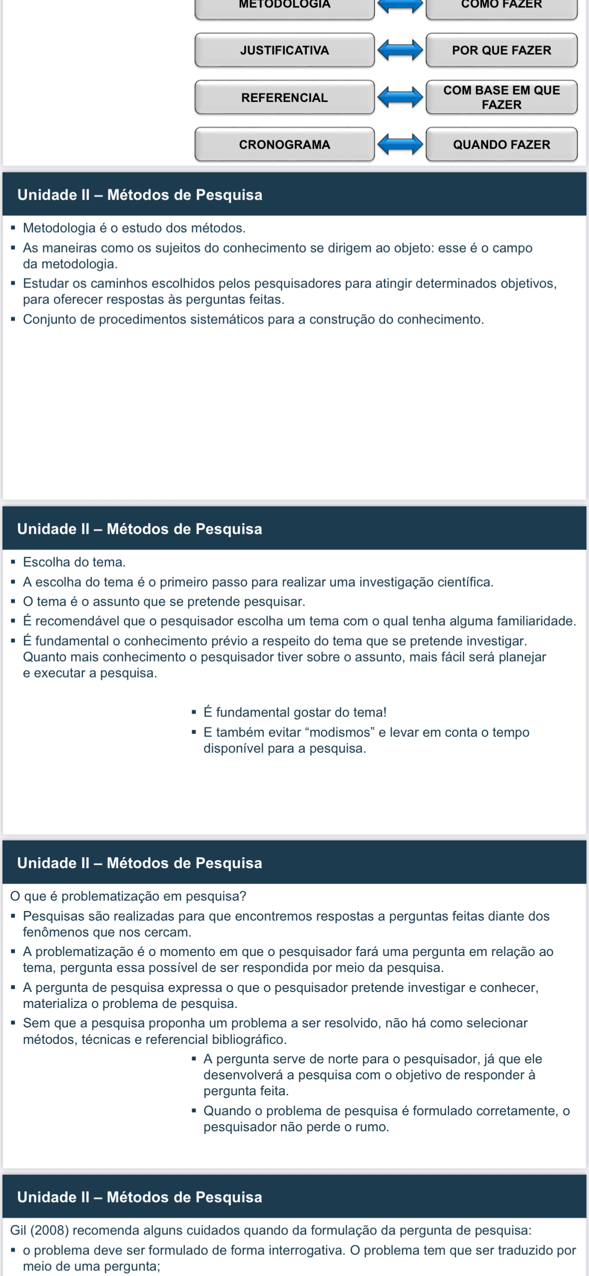 COMO FAZER JUSTIFICATIVA POR QUE FAZER COM BASE EM QUE REFERENCIAL FAZER CRONOGRAMA QUANDO FAZER Unidade II Métodos de Pesquisa Metodologia é estudo dos métodos. As maneiras como os sujeitos do conhecimento se dirigem ao objeto: esse é campo da metodologia. Estudar os caminhos escolhidos pelos pesquisadores para atingir determinados objetivos, para oferecer respostas às perguntas feitas. Conjunto de procedimentos sistemáticos para a construção do conhecimento. Unidade II Métodos de Pesquisa Escolha do tema. A escolha do tema é primeiro passo para realizar uma investigação científica. tema é assunto que se pretende pesquisar. É recomendável que pesquisador escolha um tema com qual tenha alguma familiaridade. É fundamental conhecimento prévio a respeito do tema que se pretende investigar. Quanto mais conhecimento pesquisador tiver sobre o assunto, mais fácil será planejar e executar a pesquisa. É fundamental gostar do tema! E também evitar "modismos" e levar em conta tempo disponível para a pesquisa. Unidade II Métodos de Pesquisa que é problematização em pesquisa? Pesquisas são realizadas para que encontremos respostas a perguntas feitas diante dos fenômenos que nos cercam. A problematização é o momento em que pesquisador fará uma pergunta em relação ao tema, pergunta essa possível de ser respondida por meio da pesquisa. A pergunta de pesquisa expressa o que o pesquisador pretende investigar e conhecer, materializa o problema de pesquisa. Sem que a pesquisa proponha um problema a ser resolvido, não há como selecionar métodos, técnicas e referencial bibliográfico. A pergunta serve de norte para o pesquisador, já que ele desenvolverá a pesquisa com objetivo de responder à pergunta feita. Quando problema de pesquisa é formulado corretamente, o pesquisador não perde rumo. Unidade II Métodos de Pesquisa Gil (2008) recomenda alguns cuidados quando da formulação da pergunta de pesquisa: o problema deve ser formulado de forma interrogativa. problema tem que ser traduzido por meio de uma pergunta;