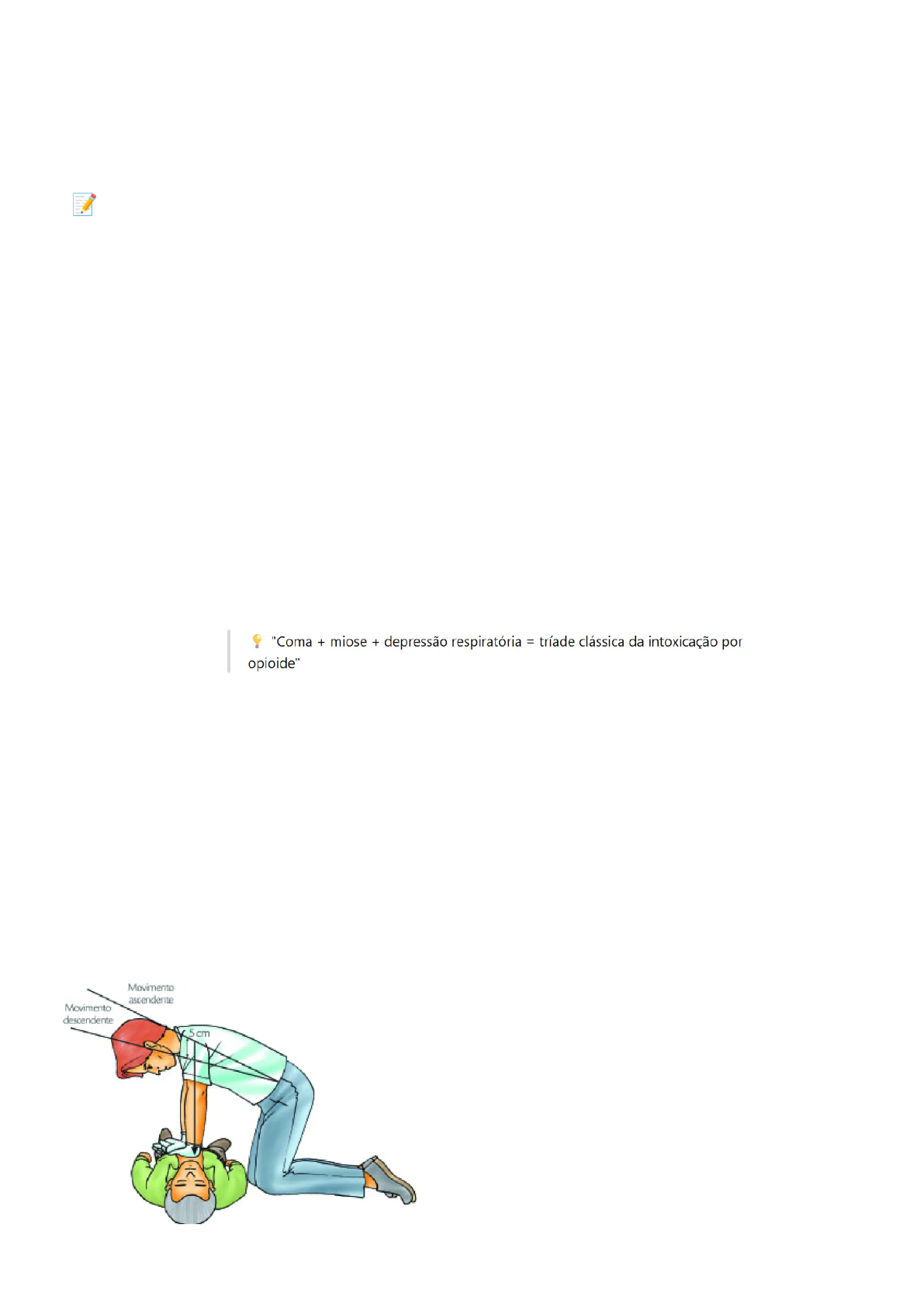 Suporte Básico de Vida ● OBJETIVO → manter a circulação sanguínea e oxigenação cerebral em casos de parada cardiorrespiratória (PCR) até a chegada do suporte avançado 📝 ALGORITMO DE SBV ADULTO 1. SEGURANÇA DE CENA 2. VERIFICAR RESPONSIVIDADE ○ estímulo tátil → tocando nos ombros ○ estímulo verbal → chamando a vítima ○ OBS: se o paciente estiver consciente → realizar atendimento primário e secundário 3. CHAMAR AJUDA E PEDIR O DEA ○ escolher/apontar para uma pessoa próxima ligar pro 192 e outra pessoa procurar um DEA 4. AVALIAR PULSO E RESPIRAÇÃO ○ devem ser avaliados simultaneamente por 5-10s ○ pulso carotídeo ipsilateral ○ a vítima pode estar em gasping (respiração anormal, ineficaz e irregular, que pode ocorrer nos primeiros minutos após uma parada cardiorrespiratória) ○ respirando e com pulso = monitorizar até chegar a emergência ○ sem respiração e com pulso = ventilação de resgate (1 ventilação a cada 6s ou 10 ventilações por minuto) e verificar o pulso a cada 2 minutos ■ OBS: suspeita de opióides = naloxona (narcan), se disponível (0,4-2 mg IM ou 1 borrifada Intranasal) ○ sem respiração/gasping e sem pulso = compressões de alta qualidade 5. COMPRESSÕES DE ALTA QUALIDADE ○ o que são compressões de alta qualidade? ○ iniciadas em até 10s após o reconhecimento da PCR ○ 100 a 120 compressões por minuto ○ com o retorno completo do tórax ○ mínimo de interrupções (não passar de 10s) ○ no mínimo 5 cm e não mais que 6 cm (adultos → puberdade em diante) ○ 1/3 da profundidade do tórax, aproximadamente 5 cm (crianças → até a puberdade) ○ 1/3 da profundidade do tórax, aproximadamente 4 cm (bebês → até um ano) ○ a vítima deve estar posicionada em decúbito dorsal sobre uma superfície firme e plana ○ coloque a mão sobre o esterno, no centro do tórax 6. VENTILAÇÕES ○ realize a abertura da via aérea → inclinando a cabeça elevando o queixo ou anteriorizando a mandíbula ○ pode ser usado uma máscara de bolso (válvula unidireccional) ou um dispositivo bolsa-válvula-máscara ○ administre cada ventilação durante 1s e observe a elevação do tórax ○ evitar ventilação excessiva ○ proporção: 30 compressões para 2 ventilações 7. USO DO DEA ○ usá-lo assim que disponível, não demorar mais que 30s para montar e analisar o ritmo ○ 1 socorrista: para a RCP assim que chegar para conectar o DEA ○ 2 socorristas: não interrompe a RCP ○ liga o DEA → expor o tórax da vítima → colocar eletrodos → conectar eletrodos no DEA → analisar o ritmo → ritmo chocável ou não → choque → RCP ○ tórax molhado = secar ○ tórax peludo = raspar, se possível (alguns DEA possui lâminas) ● OBS: no intra-hospitalar, checa-se o pulso e a respiração antes de chamar ajuda 🔗 CADEIA DE SOBREVIVÊNCIA ● mostra as ações que devem ocorrer para proporcionar à vítima de PCR a melhor chance de sobrevivência ● se um dos elos se quebrar, a probabilidade de um bom resultado diminui ● Cadeia de Sobrevivência Extra-Hospitalar no adulto ● Cadeia de Sobrevivência Intra-Hospitalar no adulto ● reconhecimento → piora de quadros respiratórios/circulatórios ● prevenção precoce → observação cuidadosa, atendimento preventivo e tratamento precoce em condições pré-PCR ● acionamento do serviço de emergência → ligar para 192 ou acionar o protocolo de PCR da instituição ● ressuscitação avançada → inclui acesso venoso, medicamentos, via aérea avançada, ECG, monitorização avançada ● cuidados pós-PCR → ocorre após o retorno da circulação espontânea (RCE) e inclui ventilação mecânica, controle da pressão arterial, evitar nova PCR, cateterismo (depende de cada caso) ● recuperação → intervenções específicas 🫂 VÁRIOS SOCORRISTAS ● PRIMEIRO SOCORRISTA → administra compressões contando em voz alta ○ ao lado da vítima ● SEGUNDO SOCORRISTA → administra ventilações ○ na cabeça da vítima ● alternar a cada 5 ciclos ou 2 minutos 📢 FUNÇÕES DA EQUIPE DE ALTO DESEMPENHO ● formada por 6 pessoas ● deve-se usar comunicação em circuito fechado → emissor fala a mensagem, receptor repete e emissor confirma se está correto ○ ao finalizar uma tarefa, deve-se informar ao líder da equipe ● o líder deve chamar os membros da equipe pelo nome e fazer contato visual ao dar uma instrução 1⃣ ATENDIMENTO PRIMÁRIO ● feito quando o paciente está consciente ou após o retorno da circulação espontânea (RCE) 2⃣ ATENDIMENTO SECUNDÁRIO ● serve para entender a causa do problema e corrigi-la ● SAMPLE ○ sinais e sintomas ○ alergias ○ medicações ○ passado médico pregresso ○ líquidos e alimentação ○ eventos que levaram à lesão atual ● 5 Hs e Ts ○ hipovolemia, hipóxia, hidrogênio (acidemia), hipo/hipercalemia, hipotermia ○ tórax hipertensivo (pneumotórax hipertensivo), tamponamento cardíaco, toxinas, trombose pulmonar, trombose coronária VIA AÉREA ● em caso de parada respiratória no adulto → administrar 500 a 600 ml de volume corrente ou o suficiente para produzir elevação no tórax ● evitar ventilação excessiva (causa distensão gástrica, regurgitação e aspiração) PARADA RESPIRATÓRIA COM PULSO ● é preciso realizar a abertura da via aérea com as manobras Chin-lift ou Jaw-thrust ● uma ventilação a cada 6 segundos ou 10 ventilações por minuto → usando um dispositivo bolsa-válvula-máscara ou outro dispositivo de via aérea avançada ● a ventilação deve ser por 1 segundo ou até elevar o tórax ● é preciso verificar o pulso a cada 2 minutos EQUIPAMENTOS ADJUNTOS PARA VIAS AÉREAS ● CÂNULA OROFARÍNGEA (COF) ○ (ou cânula de Guedel) é um dispositivo utilizado para manter a via aérea aberta em pacientes com rebaixamento do nível de consciência ○ é usado principalmente quando as manobras de desobstrução de via aérea