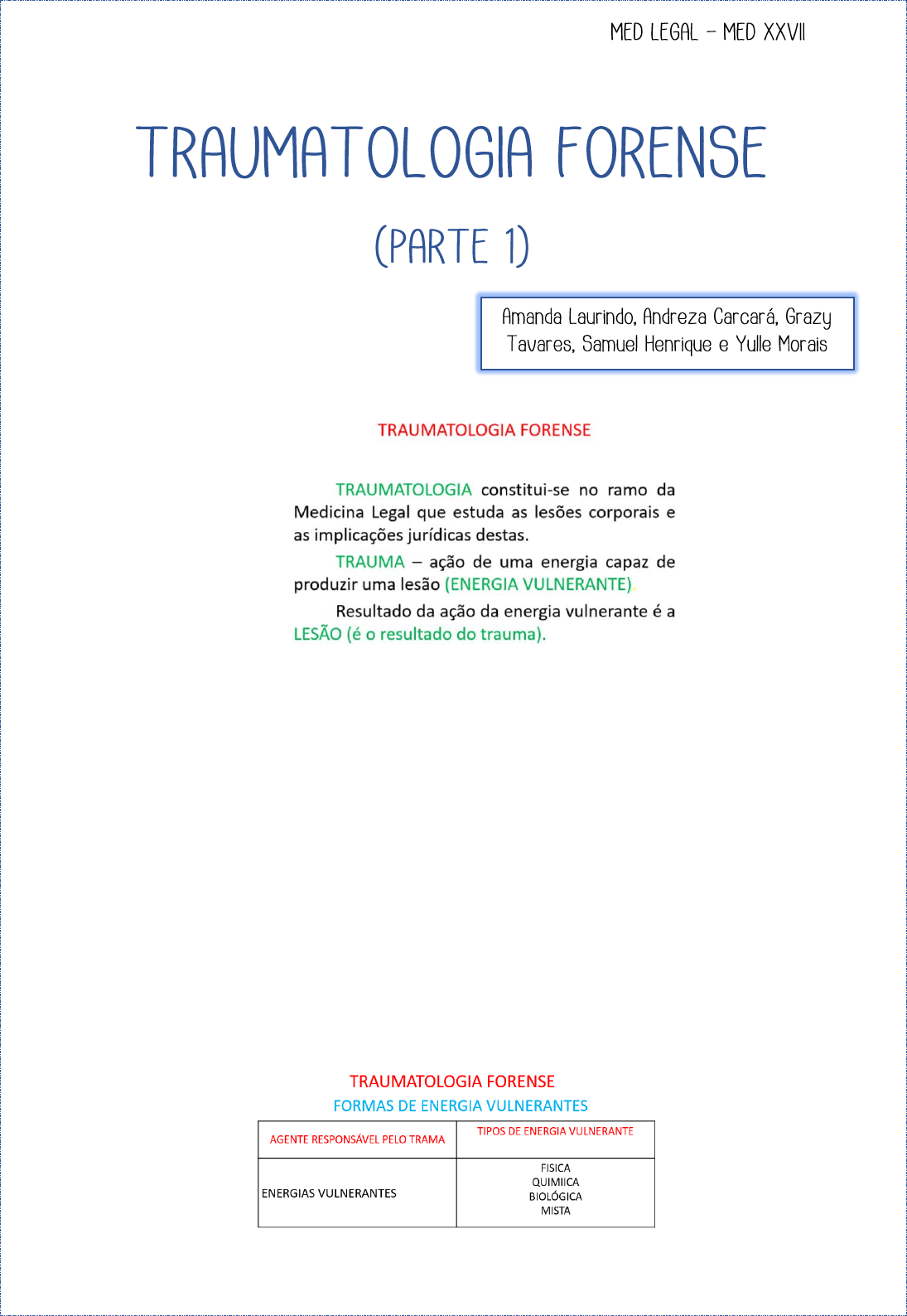 Falei para vocês que 70% dos exames são exames em pessoas vivas e geralmente é trauma. Vocês têm que conhecer muito bem os traumas para saber quais são os instrumentos que produzem as lesões e saber as repercussões desses traumas, as repercussões que esses traumas podem trazer para o corpo que são as lesões corporais. Traumatologia é o ramo da medicina legal que é responsável por estudar os traumas e suas consequências jurídicas. O trauma é a ação de uma energia capaz de produzir uma lesão, ou seja, o trauma é uma ação da energia vulnerante e a energia vulnerante são das mais variáveis espécies, tem energia vulnerante mecânica, tem energia vulnerante elétrica, energia vulnerante de calor, de pressão etc. → Tudo isso produz lesões, o resultado da ação da energia vulnerante é a lesão. Então, a energia vulnerante pode ser física, química, biológica, mista. Energia vulnerante física, por exemplo, é a mecânica, térmica, elétrica, sonora, barométrica, luminosa, radiante → isso tudo produz lesão. ✓ A eletricidade (natural ou artificial) produz lesão. ✓ A térmica, o calor produz lesão como as queimaduras, os mais variados casos de queimaduras. ✓ A pressão sonora dar a perda auditiva induzida por ruídos ocupacionais. ✓ A barométrica, a diferença de pressão, a pressão alta, ou seja, quando o cara mergulha e a pressão baixa, quando o cara sobe uma determinada montanha pode sofrer algumas lesões corpóreas. Vamos nos ater da energia física mecânica que é a energia do movimento. Falaremos primeiro da energia física mecânica. Falei para vocês que tem vários tipos de energias vulnerantes, a combinação entre elas também. Porém, vamos nos ater a energia vulnerável mecânica, que é a energia do movimento. Nessa energia do movimento, a gente vai ter que considerar o objeto, que é qualquer produto que foi manufaturado pelo homem ou não. Quando a gente dar uma determinada função a um objeto, eu tenho o instrumento. As lesões podem ser provocadas por movimentos desse objeto que tem uma determinada finalidade ou então as lesões podem ser provocadas pelo próprio agente vulnerante sem passar pelo objeto, sem ser a energia transmitida pelo objeto. ✓ Por exemplo, um agente vulnerante pode produzir uma lesão, um trauma diretamente, por exemplo, o fogo, você não precisa de um objeto interposto para produzir a lesão. Quando é que vai ter um objeto interposto para produzir a lesão? Quando você tem uma barra quente, água, mas o próprio agente vulnerante pode produzir uma lesão. Agora, posso ter um agente vulnerante em si associado a força humana com um objeto e aí se eu pegar o agente vulnerante, um objeto associado a força humana, esse objeto passa a ser um instrumento e esse instrumento pode ser a lesão. ✓ Posso pegar uma madeira qualquer, eu pego a minha força do movimento, essa energia do movimento, pego essa madeira e taco na cabeça de uma pessoa. Aquela madeira passou de objeto, passa a ser um instrumento porque quando você imprime uma determinada funcionalidade a um objeto, ele tem o nome de instrumento, ou seja, ele passou a ser um cacete e se eu bater na cabeça de alguém vai provocar uma lesão. Então, o agente vulnerante pode agir por si só e produzir uma lesão ou ele pode agir através da força humana, através de um objeto que vai receber a ação da força humana e consequentemente produzir a lesão. ENERGIA FÍSICA MECÂNICA Quando está falando de energia mecânica, energia do movimento, o instrumento pode ir de encontro ao corpo, por exemplo, eu dar um tapa na pessoa, a minha mão está indo para o rosto da pessoa, então a ação foi ativa, foi um meio ativo. ✓ Se eu dou um tapa em uma pessoa, a cara está parada, mas a minha mão (o instrumento) está em movimento e se o instrumento está em movimento, eu chamo de meio ativo. Às vezes o instrumento que está produzindo a lesão está parado e o corpo é quem vai de encontro ao instrumento que está parado. ✓ Uma precipitação, o cara está lá encima do prédio e se joga, então o corpo que está em movimento, o instrumento, que é o chão, está parado, então é um meio passivo. Quando tanto o instrumento quanto o corpo estão em movimento, eu tenho um meio misto. ✓ Por exemplo, o rapaz está movimentando a cabeça no boxe, e o outro dá um tapa nele, ali o corpo atua sobre o instrumento e o instrumento sobre o corpo. Pergunta: “Professor, se a vítima se joga em cima de uma faca, considerando que não tem força humana, mesmo assim consideramos que é um instrumento?” O meio é passivo, a faca está parada. A pessoa se joga em cima da faca, mas a faca não deixa de ser instrumento, mesmo se não tiver força humana. FÓRMULAS IMPORTANTES PROVENIENTES DA ENERGIA VULNERANTE FÍSICA MECÂNICA Existem 2 grandezas, que quando se fala de energia mecânica, não se podem esquecer. É a energia cinética e a pressão. Energia cinética é massa x (velocidade)² /2. ✓ À medida que aumenta a energia cinética, aumenta o poder de penetração de um determinado corpo e aumenta a lesão. ✓ Exemplo: um projétil de arma de fogo (de um revólver). Ele tem uma massa, tem uma velocidade e vai ter uma energia cinética x. o Agora se eu atirar numa uma pistola, com o mesmo projétil que tem uma mesma massa, o projétil vai sair com uma velocidade 2 a 3 vezes mais rápida de que com o revólver. A pistola é diferente do revólver. o Se você aumenta a velocidade, o que acontece com a energia cinética? Ela eleva ao quadrado. o Se uma velocidade é x no revólver e é 2x na pistola, a energia cinética é multiplicada em 4 vezes. o Portanto, o estrago do projétil que sai na pistola vai ser muito maior do que no revólver. o Na natureza, nada se cria, nada se perde, tudo se transforma. Ocorre uma transferência de energia cinética da arma para o projétil, do projétil para o alvo. Por isso, o estrago da pistola é muito maior que do re