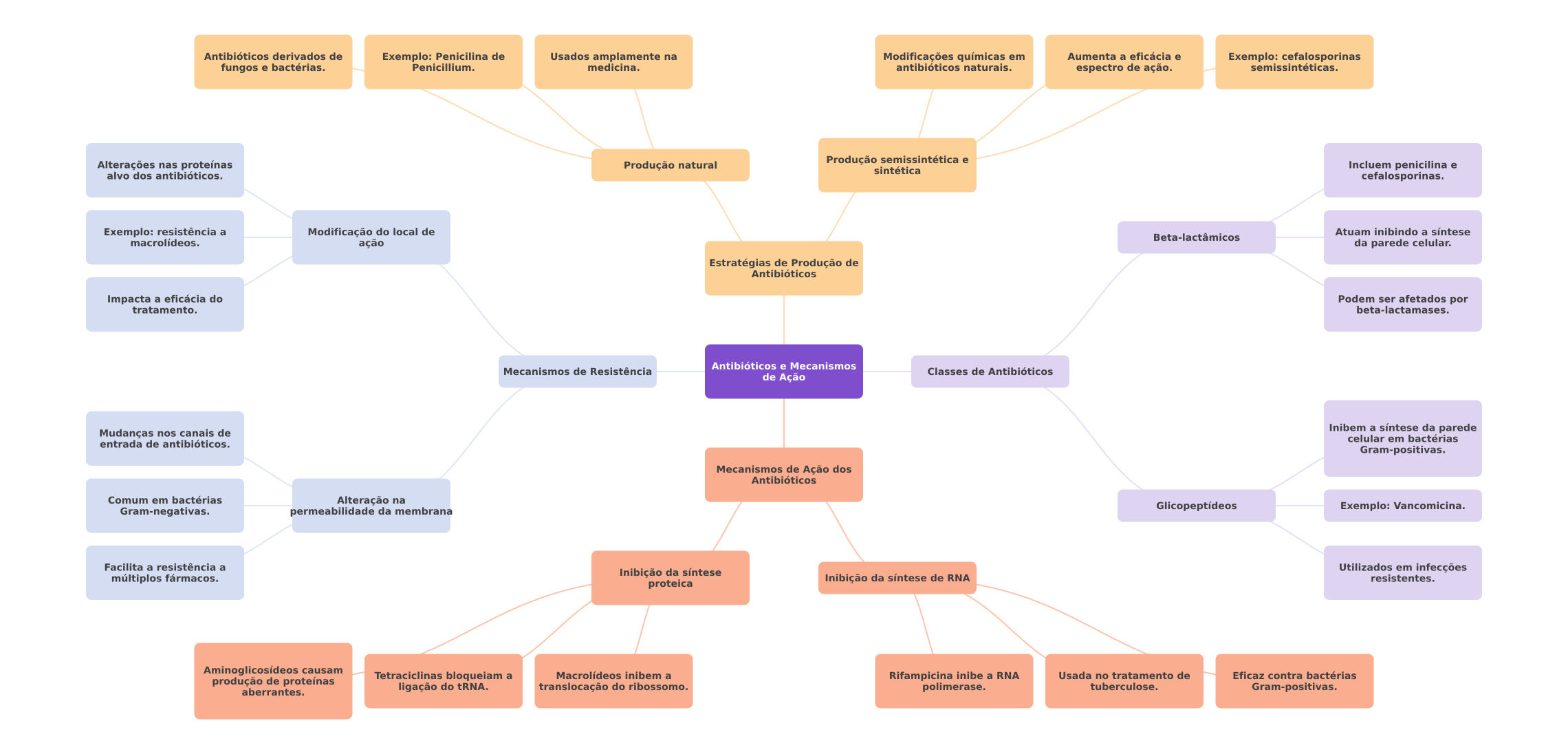 Antibióticos derivados de Exemplo: Penicilina de Usados amplamente na Modificações químicas em Aumenta a eficácia e Exemplo: cefalosporinas fungos e bactérias. Penicillium. medicina. antibióticos naturais. espectro de ação. semissintéticas. Alterações nas proteínas Produção natural Produção semissintética e Incluem penicilina e sintética alvo dos antibióticos. cefalosporinas. Exemplo: resistência a Modificação do local de Atuam inibindo a síntese Beta-lactâmicos macrolídeos. ação da parede celular. Estratégias de Produção de Antibióticos Impacta a eficácia do Podem ser afetados por tratamento. beta-lactamases. Antibióticos e Mecanismos Mecanismos de Resistência Classes de Antibióticos de Ação Mudanças nos canais de Inibem a síntese da parede celular em bactérias entrada de antibióticos. Gram-positivas. Mecanismos de Ação dos Antibióticos Comum em bactérias Alteração na Gram-negativas. bermeabilidade da membrana Glicopeptídeos Exemplo: Vancomicina. Facilita a resistência a Inibição da síntese Utilizados em infecções múltiplos fármacos. Inibição da síntese de RNA resistentes. proteica Aminoglicosídeos causam produção de proteínas Tetraciclinas bloqueiam a Macrolídeos inibem a Rifampicina inibe a RNA Usada no tratamento de Eficaz contra bactérias aberrantes. ligação do tRNA. translocação do ribossomo. polimerase. tuberculose. Gram-positivas.