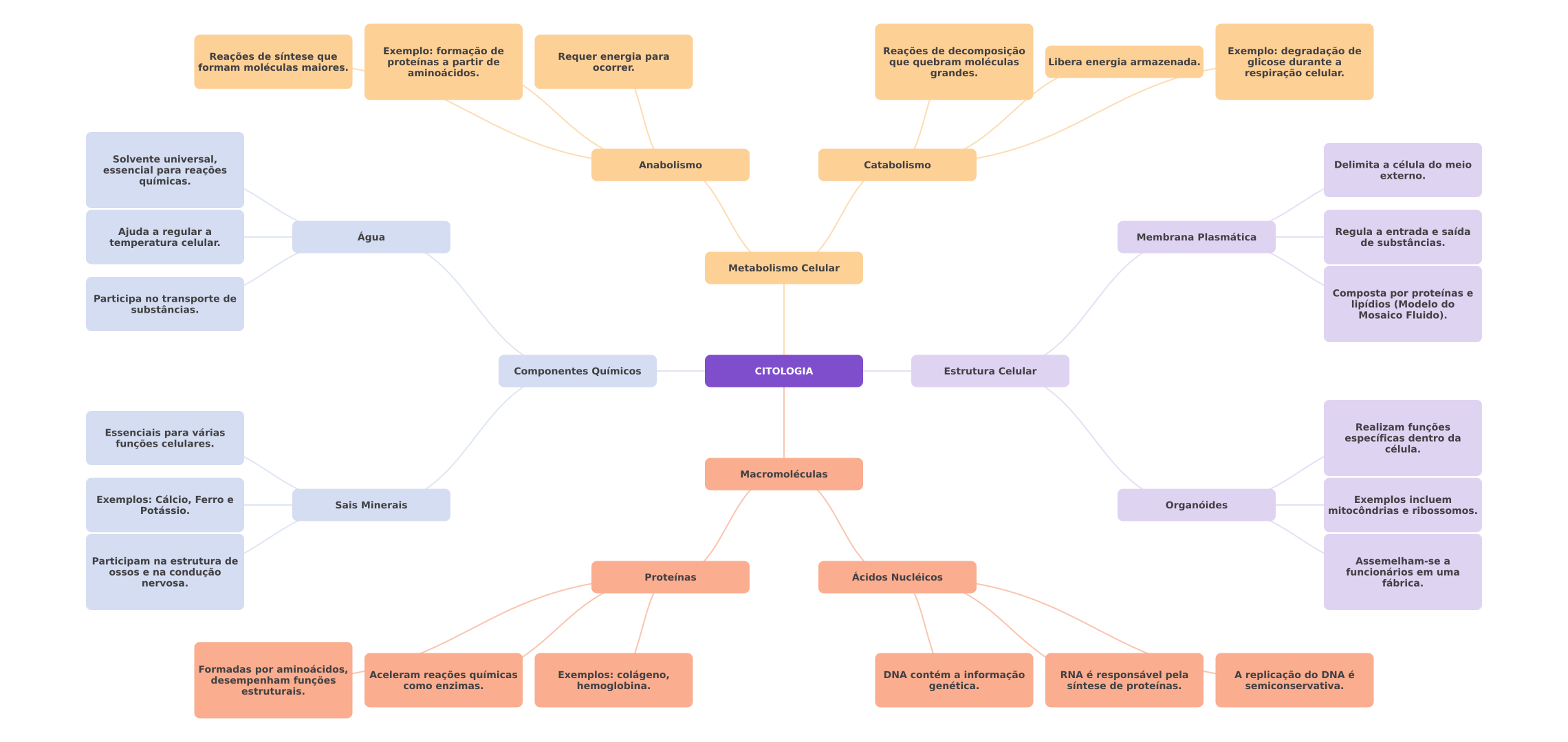 Reações de síntese que Exemplo: formação de Requer energia para Reações de decomposição Exemplo: degradação de formam moléculas maiores. proteínas a partir de que quebram moléculas Libera energia armazenada. glicose durante a ocorrer. aminoácidos. grandes. respiração celular. Solvente universal, Anabolismo Catabolismo Delimita a célula do meio essencial para reações externo. químicas. Ajuda a regular a Água Membrana Plasmática Regula a entrada e saída temperatura celular. de substâncias. Metabolismo Celular Participa no transporte de Composta por proteínas e substâncias. lipídios (Modelo do Mosaico Fluido). Componentes Químicos CITOLOGIA Estrutura Celular Realizam funções Essenciais para várias específicas dentro da funções celulares. célula. Macromoléculas Exemplos: Cálcio, Ferro e Sais Minerais Potássio. Organóides Exemplos incluem mitocôndrias e ribossomos. Participam na estrutura de Assemelham-se a ossos e na condução Proteínas Ácidos Nucléicos funcionários em uma nervosa. fábrica. Formadas por aminoácidos, Aceleram reações químicas Exemplos: colágeno, DNA contém a informação RNA é responsável pela A replicação do DNA é desempenham funções como enzimas. estruturais. hemoglobina. genética. síntese de proteínas. semiconservativa.