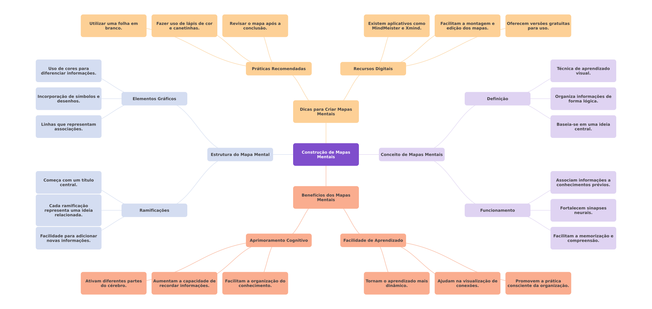 Utilizar uma folha em Fazer uso de lápis de cor Revisar mapa após a Existem aplicativos como Facilitam a montagem e Oferecem versões gratuitas branco. e canetinhas. conclusão. MindMeister e Xmind. edição dos mapas. para uso. Uso de cores para Práticas Recomendadas Recursos Digitais Técnica de aprendizado diferenciar informações. visual. Incorporação de símbolos e Elementos Gráficos desenhos. Definição Organiza informações de forma lógica. Dicas para Criar Mapas Mentais Linhas que representam Baseia-se em uma ideia associações. central. Estrutura do Mental Construção de Mapas Mentais Conceito de Mapas Mentais Começa com um título Associam informações a central. conhecimentos prévios. Benefícios dos Mapas Mentais Cada ramificação representa uma ideia Ramificações Funcionamento Fortalecem sinapses neurais. relacionada. Facilidade para adicionar Facilitam a memorização e novas informações. Aprimoramento Cognitivo Facilidade de Aprendizado compreensão. Ativam diferentes partes Aumentam a capacidade de Facilitam a organização do Tornam aprendizado mais Ajudam na visualização de Promovem a prática do cérebro. recordar informações. conhecimento. dinâmico. conexões. consciente da organização.