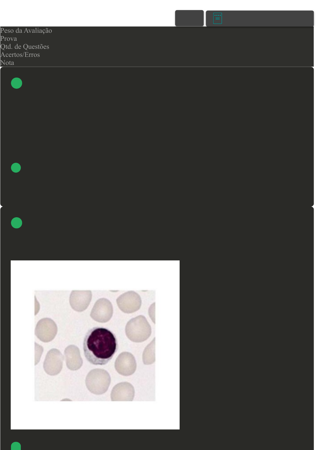 Prova Impressa GABARITO | Avaliação II - Individual (Cod.:1523667) Peso da Avaliação 2,00 Prova 107396878 Qtd. de Questões 10 Acertos/Erros 10/0 Nota 10,00 Os leucócitos, também conhecidos como glóbulos brancos, são as células responsáveis por defender o organismo contra infecções, doenças, alergias e resfriados, sendo parte da imunidade de cada pessoa. Os leucócitos são divididos em dois grandes grupos: fagócitos e imunócitos. Assinale a alternativa CORRETA que apresenta o grupo dos fagócitos: A Basófilos, monócitos e linfócitos. B Neutrófilos, monócitos e linfócitos. C Neutrófilos, basófilos e monócitos. D Neutrófilos, basófilos e linfócitos. Os leucócitos, também conhecidos como glóbulos brancos, são células presentes no sangue e produzidas na medula óssea e no tecido linfático. São responsáveis pela defesa do nosso organismo contra patógenos. Com base no tipo de leucócito apresentado na imagem anexa, assinale a alternativa CORRETA: A VOLTAR A+ Alterar modo de visualização 1 2 29/09/2025, 14:11 Avaliação II - Individual about:blank 1/6 Linfócito. B Monócito. C Neutrófilo. D Basófilo. O neutrófilo é a célula mais abundante do nosso sistema de defesa, até chegar à forma que nós conhecemos, ele passa por um processo de maturação. Sobre o processo de maturação, com base nos tipos celulares e suas características, associe os itens, utilizando o código a seguir: I- Tem diâmetro de 12 - 20 µm com núcleo relativamente grande, redondo, cromatina delicada podendo exibir um ou mais nucléolos, citoplasma é levemente basofílico e os grânulos podem estar presentes ou não. II- Tem diâmetro de 15 - 25 µm, núcleo redondo, cromatina delicada ou levemente condensada apresentando nucléolo evidente, citoplasma basofílico contendo grânulos de coloração azulvioláceo e vermelhos, presença do Sistema de Golgi. III- Tem diâmetro de 10 - 18 µm com núcleo oval que pode ser excêntrico, quantidade moderada de citoplasma contendo grânulos vermelho-arroxeados. IV- Tem diâmetro de 10 - 14 µm com núcleo não segmentado ou exibindo lóbulos rudimentares conectados por um filamento espesso e citoplasma é abundante, claro e contém granulação fina e bem distribuída. ( ) Mieloblasto ( ) Promielócito ( ) Mielócito ( ) BastãoAssinale a alternativa que apresenta a sequência CORRETA: A I - II - III - IV. B II - I - IV - III. C IV - III - II - I. D III - II - IV - I. Os glóbulos brancos do corpo ajudam a proteger contra doenças e enfermidades e a combater microrganismos prejudiciais. Pode-se encontrar alterações no número de leucócitos, leucocitose e leucopenia além de encontrarmos outras alterações leucocitárias. Com base nas alterações leucocitárias, classifique V para as sentenças verdadeiras e F para as falsas: ( ) As granulações tóxicas são grânulos grosseiros de coloração roxa que ocorrem como resposta a infecções e inflamações, no tratamento com corticoides, ou podem aparecer em situações fisiológicas como a gravidez. ( ) Corpos de Dohle são vistos em estados inflamatórios e infecciosos, particularmente notáveis na pneumonia pneumocócica, na erisipela e após queimaduras. Podem estar presentes na gravidez. ( ) Anomalia de Pelger-Huet é um defeito genético, autossômico dominante, da segmentação dos neutrófilos, com presença de hipersegmentação dos neutrófilos com significado patológico. ( ) Vacuolização citoplasmática nos neutrófilos ocorre pela exocitose de material fagocitário e do conteúdo de conglomerados de lisossomos. Assinale a alternativa que apresenta a sequência CORRETA: 3 4 29/09/2025, 14:11 Avaliação II - Individual about:blank 2/6 A F - V - V - F. B V - F - F - V. C V - F - V - V. D V - V - F - V. Os basófilos são um subtipo de células de defesa do nosso organismo, no combate de uma infecção, os basófilos liberam heparina e histamina. Com base no processo de maturação basófilo, ordene os itens a seguir: I- Bastonete basófilo. II- Mielócito basófilo. III- Segmentado basófilo. IV- Metamielócito basófilo.Assinale a alternativa que apresenta a sequência CORRETA: A IV - II - III - I. B IV - II - I - III. C II - IV - III - I. D II - IV - I - III. Os leucócitos, também conhecidos como glóbulos brancos, são células presentes no sangue e produzidas na medula óssea e no tecido linfático. São responsáveis pela defesa do nosso organismo contra patógenos. 5 6 29/09/2025, 14:11 Avaliação II - Individual about:blank 3/6 Com base no tipo de leucócito apresentado na imagem anexa, assinale a alternativa CORRETA: A Basófilo. B Neutrófilo. C Eosinófilo. D Monócito. Os leucócitos são a linha de defesa do nosso organismo. Existem vários tipos celulares com morfologia e funções distintas. Com base nos tipos celulares e suas características, associe os itens, utilizando o código a seguir: I- Possuem quatro tipos diferentes de grânulos em seu citoplasma: grânulos azurófilos, grânulos secundários, grânulos terciários e vesículas secretoras. II- Possuem três tipo de grânulos: grânulos eosinófilos, que são ligados à membrana e ricos em proteínas catiônicas básicas, grânulos primários e grânulos pequenos. III- Presença de citoplasma azul claro contendo grânulos azul-escuros. IV- Presença de citoplasma cinza-azulado e granulação extremamente fina. ( ) Basófilos. ( ) Monócitos. ( ) Neutrófilos. ( ) Eosinófilos.Assinale a alternativa que apresenta a sequência CORRETA: A IV - II - III - I. B I - IV - III - II. C III - I - IV - II. 7 29/09/2025, 14:11 Avaliação II - Individual about:blank 4/6 D III - IV - I - II. O neutrófilo é a célula mais abundante do nosso sistema de defesa, até chegar à forma que nós conhecemos, ele passa por um processo de maturação. Sobre o processo de maturação, pensando no processo de maturação do neutrófilo, ordene os itens a seguir: I- Promielócito. II- Mieloblasto. III- Bastonete. IV