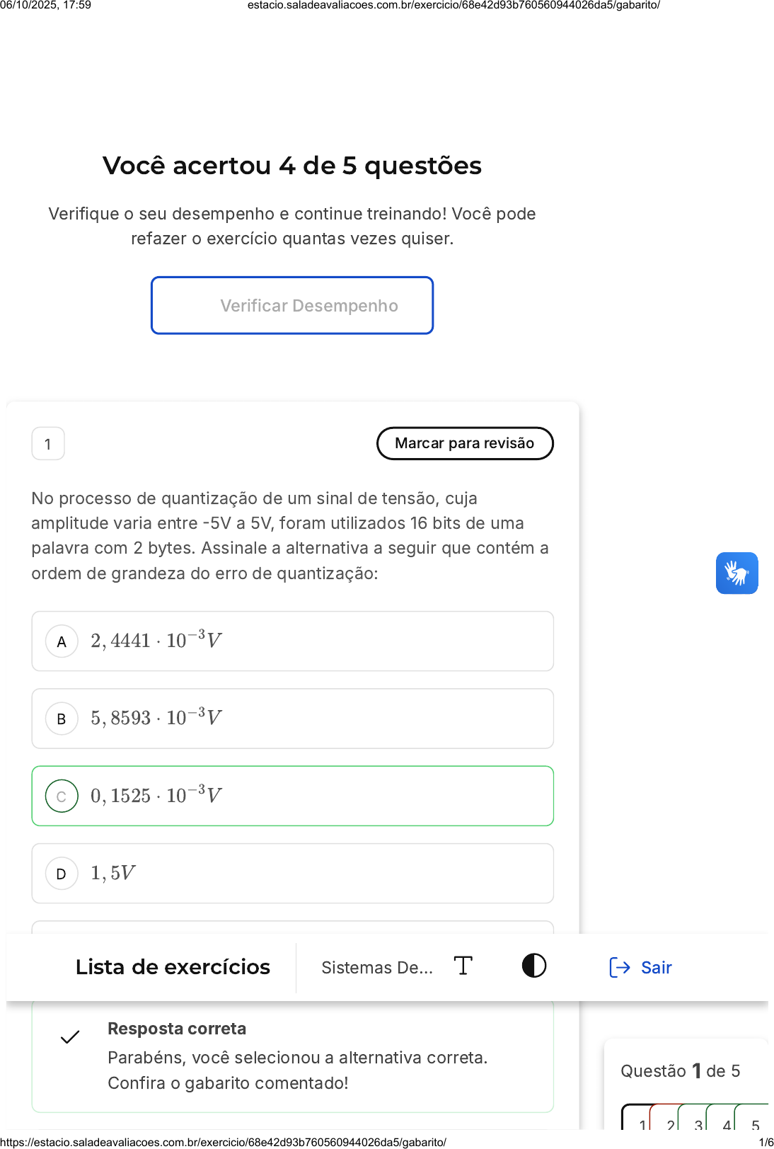 Você acertou 4 de 5 questões Verifique o seu desempenho e continue treinando! Você pode refazer o exercício quantas vezes quiser. Verificar Desempenho A B C D E 1 Marcar para revisão No processo de quantização de um sinal de tensão, cuja amplitude varia entre -5V a 5V, foram utilizados 16 bits de uma palavra com 2 bytes. Assinale a alternativa a seguir que contém a ordem de grandeza do erro de quantização: 2, 4441 ⋅ 10−3 V 5, 8593 ⋅ 10−3 V 0, 1525 ⋅ 10−3 V 1, 5V 0, 3662 ⋅ 10−3 V Resposta correta Parabéns, você selecionou a alternativa correta. Confira o gabarito comentado! Questão 1 de 5 1 2 3 4 5 Lista de exercícios Sistemas De… Sair 06/10/2025, 17:59 estacio.saladeavaliacoes.com.br/exercicio/68e42d93b760560944026da5/gabarito/ https://estacio.saladeavaliacoes.com.br/exercicio/68e42d93b760560944026da5/gabarito/ 1/6 A B C D E Gabarito Comentado A questão se refere ao processo de quantização de um sinal de tensão, que é a conversão de um sinal analógico em um sinal digital. Nesse processo, a amplitude do sinal é dividida em níveis discretos, que são representados por bits. O erro de quantização é a diferença entre o valor real do sinal e o valor quantizado. No caso apresentado, a amplitude do sinal varia entre -5V e +5V e foram utilizados 16 bits para a quantização. A alternativa correta, que representa a ordem de grandeza do erro de quantização, é .0, 1525 ⋅ 10−3 V 2 Marcar para revisão Adotando o período de amostragem T=0,05 e o operador discreto Backward, assinale a alternativa que corresponde ao controlador discreto equivalente C (z) ao controlador analógico C (s) de um sistema de controle de vazão, cuja função de transferência é dada por: d a Ca(s) = = U(s) E(s) 3s−8 8s+9 Cd(z) = 2,6z−0,3973 1,0596z−0,3444 2,6z−3 7,55z−8 Cd(z) = 7,55z−8 2,06z−3 Cd(z) = 0,9765z−0,4082 z+0,3906 Cd(z) = = 402 0,05 3z−8 8z+9 3z−8 8z+9 Resposta incorreta Corretas (4) Incorretas (1) Em branco (0) 1 2 3 4 5 06/10/2025, 17:59 estacio.saladeavaliacoes.com.br/exercicio/68e42d93b760560944026da5/gabarito/ https://estacio.saladeavaliacoes.com.br/exercicio/68e42d93b760560944026da5/gabarito/ 2/6 A B C Opa! A alternativa correta é a letra B. Confira o gabarito comentado! Gabarito Comentado A questão pede a conversão de um controlador analógico para um controlador discreto, utilizando o operador discreto Backward e um período de amostragem T=0,05. A alternativa correta é a B, que apresenta a função de transferência do controlador discreto equivalente ao controlador analógico dado. A conversão de um controlador analógico para um controlador discreto é um processo comum em sistemas de controle digital, onde o controlador analógico é substituído por um controlador discreto que produz resultados semelhantes quando aplicado a um sistema discreto. A função de transferência do controlador discreto é obtida através da aplicação do operador discreto Backward à função de transferência do controlador analógico. 3 Marcar para revisão Assinale a alternativa que corresponde à equação de diferenças de um controlador discreto equivalente, obtido por meio da aproximação de Forward e que possui a seguinte função de transferência: Cd(z) = = U(z) E(z) 402z−398 1403z−1397 e(k + 1) = e(k) + u(k + 1) − u(k)7 9 11 9 u(k) = u(k + 1) + e(k + 1) − e(k)402 1403 398 1397 u(k + 1) = u(k) + e(k + 1) − e(k)1403 1397 402 1397 06/10/2025, 17:59 estacio.saladeavaliacoes.com.br/exercicio/68e42d93b760560944026da5/gabarito/ https://estacio.saladeavaliacoes.com.br/exercicio/68e42d93b760560944026da5/gabarito/ 3/6 D E A B u(k + 1) = 0, 996u(k) + 0, 286e(k + 1) − 0, 284e(k) u(k + 1) = 3, 49u(k) + 3, 51e(k + 1) − e(k) Resposta correta Parabéns, você selecionou a alternativa correta. Confira o gabarito comentado! Gabarito Comentado A alternativa correta é a letra D, que apresenta a equação de diferenças correta para o controlador discreto equivalente. A equação é obtida a partir da função de transferência dada, utilizando a aproximação de Forward. Esta equação representa a relação entre a entrada e a saída do controlador em termos de suas versões discretas no tempo, considerando a influência do valor atual e do valor anterior tanto da entrada quanto da saída. u(k + 1) = 0, 996u(k) + 0, 286e(k + 1) − 0, 284e(k) 4 Marcar para revisão Assinale a alternativa que contém a resposta de um sistema de controle digital a uma entrada do tipo impulso unitário, cuja função de transferência em malha fechada é dada por: = Yz Rz z+10 z2+7z+12 Yz = 1, 2z−1 + 2, 3z−2 + 21, 4z−3 − 13z−4+. . . Yz = 0, 83z−1 − 1, 42z−2 + 4, 54z−3 + 83, 6z−4+. . . 06/10/2025, 17:59 estacio.saladeavaliacoes.com.br/exercicio/68e42d93b760560944026da5/gabarito/ https://estacio.saladeavaliacoes.com.br/exercicio/68e42d93b760560944026da5/gabarito/ 4/6 C D E Yz = z−1 + 2, 5z−2 + 5z−3 + 10z−4+. . . Yz = z−1 + 3z−2 − 33z−3 + 195z−4+. . . Yz = 0, 5z−1 + 1, 3z−2 + 1, 7z−3 + 5, 46z−4+. . . Resposta correta Parabéns, você selecionou a alternativa correta. Confira o gabarito comentado! Gabarito Comentado A alternativa correta é a D, que apresenta a sequência . Essa sequência é a resposta do sistema de controle digital a uma entrada do tipo impulso unitário, considerando a função de transferência em malha fechada dada. A função de transferência descreve a relação entre a entrada e a saída de um sistema, e, neste caso, a sequência apresentada na alternativa D é a que melhor representa essa relação. Yz = z−1 + 3z−2 − 33z−3 + 195z−4+. . . 5 Marcar para revisão Um sistema de controle discreto é representado pela seguinte função de transferência discreta: Sobre a estabilidade desse sistema, assinale a única alternativa correta: G(z) = z z2+1,4z+1,3 06/10/2025, 17:59 estacio.saladeavaliacoes.com.br/exercicio/68e42d93b760560944026da5/gabarito/ https://estacio.saladeavaliacoes.c