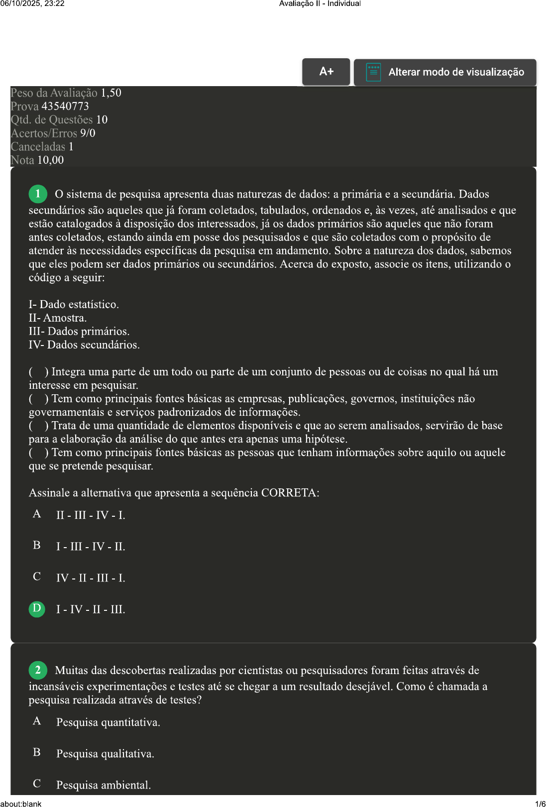 06/10/2025, 23:22 Avaliação Individual A+ Alterar modo de visualização Peso da Avaliação 1,50 Prova 43540773 Qtd. de Questões 10 Acertos/Erros 9/0 Canceladas 1 Nota 10,00 1 sistema de pesquisa apresenta duas naturezas de dados: a primária e a secundária. Dados secundários são aqueles que já foram coletados, tabulados, ordenados e, às vezes, até analisados e que estão catalogados à disposição dos interessados, já os dados primários são aqueles que não foram antes coletados, estando ainda em posse dos pesquisados e que são coletados com o propósito de atender às necessidades específicas da pesquisa em andamento. Sobre a natureza dos dados, sabemos que eles podem ser dados primários ou secundários. Acerca do exposto, associe os itens, utilizando o código a seguir: I- Dado estatístico. II- Amostra. III- Dados primários. IV- Dados secundários. Integra uma parte de um todo ou parte de um conjunto de pessoas ou de coisas no qual há um interesse em pesquisar. Tem como principais fontes básicas as empresas, publicações, governos, instituições não governamentais e serviços padronizados de informações. Trata de uma quantidade de elementos disponíveis e que ao serem analisados, servirão de base para a elaboração da análise do que antes era apenas uma hipótese. Tem como principais fontes básicas as pessoas que tenham informações sobre aquilo ou aquele que se pretende pesquisar. Assinale a alternativa que apresenta a sequência CORRETA: A II III IV I. B I III IV II. IV II III I. D I IV II III. 2 Muitas das descobertas realizadas por cientistas ou pesquisadores foram feitas através de incansáveis experimentações e testes até se chegar a um resultado desejável. Como é chamada a pesquisa realizada através de testes? A Pesquisa quantitativa. Pesquisa qualitativa. Pesquisa ambiental. about:blank 1/606/10/2025, 23:22 Avaliação Individual D Pesquisa causal. 3 A maioria das empresas faz pesquisa com clientes para medir a satisfação, identificar possibilidades de melhoria ou simplesmente permitir que os descontentes desabafem. A abordagem parte de uma mentalidade pessimista e focada em problemas. "Os clientes foram condicionados a sempre procurar o que está errado", diz Sterling Bone, professor associado de marketing da Huntsman School of Business, no estado de Utah. Na verdade, a maioria das pesquisas sobre atendimento ao cliente trata da "recuperação de serviços" que fazer quando um cliente se queixa. Durante um curso de estudos bíblicos, quase uma década atrás, Bone refletiu sobre o poder da gratidão e começou a se perguntar o que aconteceria se esse sentimento fosse mencionado em pesquisas com clientes. E se em vez de as empresas perguntarem a eles o que deu errado, perguntassem o que deu certo? Desde então, Bone e colegas fazem pesquisas para explorar essa ideia. Eles publicaram sete estudos que argumentam que as empresas devem olhar para o processo de feedback do cliente não só como uma oportunidade de ouvir, mas de também, sutilmente, influenciar-lhe a percepção. Descobriram que começar um pedido de feedback solicitando um elogio (por exemplo, "O que foi bom em sua visita?"), aumentava consistentemente os níveis de satisfação relatados, a possibilidade de uma nova compra, a quantidade de dinheiro que gastariam e até mesmo a lealdade do cliente. Começar uma pesquisa com o que os pesquisadores chamam de "solicitações positivas abertas" parece ser uma maneira fácil e de baixo custo de aumentar a satisfação e os gastos. "As pessoas ficam mais felizes quando focam no lado positivo, mas as empresas raramente lhes dão essa oportunidade", diz Bone. Sobre a aplicação da pesquisa de mercado, assinale a alternativa CORRETA: FONTE: JOHN, L. K.; KIM, BARASZ, K. Anúncios abusivos. Harvard Business Review, São Paulo, 1° fev. 2018. Disponível em: Acesso em: 15 mar. 2018. A Quanto maior a insatisfação associada ao mau atendimento, maior o retorno do cliente à empresa/loja. Quanto mais conhecida por seus clientes a empresa for, menor é o número de vendas consumadas. Quanto à satisfação do cliente, essa tem que ser o motivo maior para o retorno do cliente. D Quanto menos satisfeitos, maiores os parceiros comerciais e advogados que defendem a empresa e fazem propaganda para amigos e familiares. Atenção: Esta questão foi cancelada, porém a pontuação foi considerada. 4 As organizações possuem duas formas de aplicar a pesquisa de marketing: por meio de dados primários e/ou secundários. Os dados podem ser colhidos, entre outros, através de pesquisa, observação ou experiência. Referente aos dados primários, analise as seguintes sentenças: I- São os dados novos, coletados com o objetivo de atender a um projeto em específico. II- levantamento de campo deverá ser usado como segunda opção, no caso de outras formas não atingirem as necessidades da pesquisa. III- São os dados já coletados, disponíveis para consulta. IV- A forma de coleta de dados deverá primar pela rapidez, economia e eficiência. Agora, assinale a alternativa CORRETA: A As sentenças II e III estão corretas. B Somente a sentença IV está correta. about:blank 2/606/10/2025, 23:22 Avaliação Individual C Somente a sentença I está correta. D As sentenças I, II e IV estão corretas. 5 A miopia em marketing continua sendo um lembrete importante dos riscos que sua companhia corre se você não prestar muita atenção às necessidades do cliente. Levitt acreditava que os executivos não podem prever o futuro e não devem tentar. Se as empresas se concentrarem em satisfazer as necessidades do cliente, em vez de se preocupar em vender produtos sem nunca se esquecer do negócio em que realmente estão elas poderão estar mais bem preparadas para o que quer que o futuro lhes reserve. Sobre as etapas da pesquisa de mercado, ordene os itens a seguir: I- A elaboração do relatório relativo à pesquisa é uma das últimas atividades a serem dese