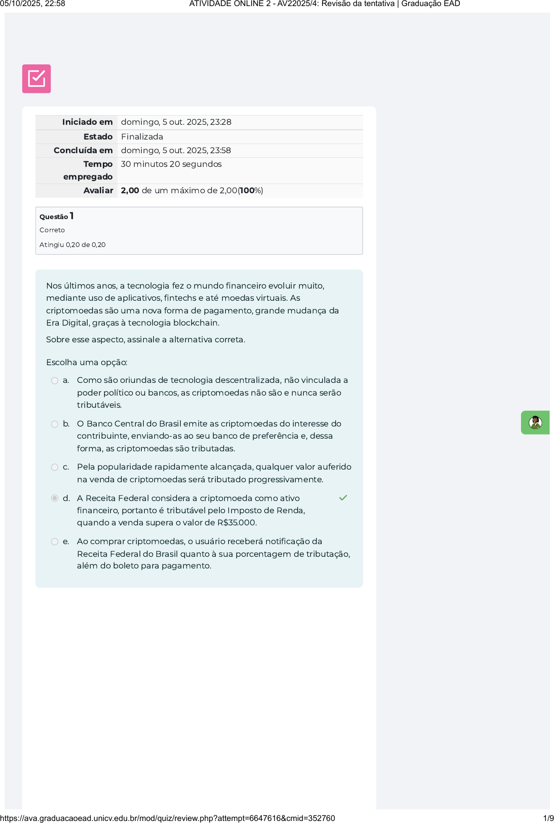 Iniciado em domingo, 5 out. 2025, 23:28 Estado Finalizada Concluída em domingo, 5 out. 2025, 23:58 Tempo empregado 30 minutos 20 segundos Avaliar 2,00 de um máximo de 2,00(100%) Questão 1 Correto Atingiu 0,20 de 0,20 Nos últimos anos, a tecnologia fez o mundo financeiro evoluir muito, mediante uso de aplicativos, fintechs e até moedas virtuais. As criptomoedas são uma nova forma de pagamento, grande mudança da Era Digital, graças à tecnologia blockchain. Sobre esse aspecto, assinale a alternativa correta. Escolha uma opção: a. Como são oriundas de tecnologia descentralizada, não vinculada a poder político ou bancos, as criptomoedas não são e nunca serão tributáveis. b. O Banco Central do Brasil emite as criptomoedas do interesse do contribuinte, enviando-as ao seu banco de preferência e, dessa forma, as criptomoedas são tributadas. c. Pela popularidade rapidamente alcançada, qualquer valor auferido na venda de criptomoedas será tributado progressivamente. d. A Receita Federal considera a criptomoeda como ativo financeiro, portanto é tributável pelo Imposto de Renda, quando a venda supera o valor de R$35.000. ✓ e. Ao comprar criptomoedas, o usuário receberá notificação da Receita Federal do Brasil quanto à sua porcentagem de tributação, além do boleto para pagamento. 05/10/2025, 22:58 ATIVIDADE ONLINE 2 - AV22025/4: Revisão da tentativa | Graduação EAD https://ava.graduacaoead.unicv.edu.br/mod/quiz/review.php?attempt=6647616&cmid=352760 1/9 Questão 2 Correto Atingiu 0,20 de 0,20 “Sony impede Beyoncé de colocar seus vídeos no YouTube”. Essa foi uma notícia que circulou ávidamente no ano de 2010, quando a gravadora Sony Music bloqueou vídeos publicados na plataforma YouTube pela cantora estadunidense Beyoncé, devido à violação de direitos autorais. Essa notícia, que causou estranheza em 2010, tem outra interpretação 11 anos depois, visto que a internet e os novos meios de comunicação e difusão de notícias se modificaram expressivamente. Diante disso, o Direito precisou se adaptar às novas tecnologias e estabelecer limites, com o objetivo de preservar o direito autoral e, ao mesmo tempo, proteger a propagação de conhecimento e o direito de acesso à cultura, por exemplo. Em relação aos direitos autorais e à propriedade intelectual na era da informática, assinale a alternativa correta: Escolha uma opção: a. Os limites aos direitos autorais objetivam restringir os direitos do autor, uma vez que eles perduram infindavelmente após o falecimento do autor. b. Obras podem ser compartilhadas nas redes sociais desde que previamente autorizadas pelo autor, sendo dispensável a indicação de sua origem. c. Dispondo de lei específica sobre direitos autorais, o Brasil enfrenta dificuldades para aplicar os limites dos direitos autorais às novas tecnologias. ✓ d. A sociedade da informação impede que haja a colisão dos direitos fundamentais do acesso à informação com os direitos autorais. e. As criações intelectuais, quando digitalizadas e transformadas em bits, passam a ter tratamento diferente do oferecido pela Lei dos Direitos Autorais. 05/10/2025, 22:58 ATIVIDADE ONLINE 2 - AV22025/4: Revisão da tentativa | Graduação EAD https://ava.graduacaoead.unicv.edu.br/mod/quiz/review.php?attempt=6647616&cmid=352760 2/9 Questão 3 Correto Atingiu 0,20 de 0,20 A aplicabilidade de novas tecnologias proporciona reflexões e debates sobre relações sociais e jurídicas, que são até passíveis como objetos de estudo, bem como proporciona facilidades em seu uso, principalmente na telecomunicação de computadores, o que gera cuidado e atenção do mundo jurídico em como precaver e resolver situações de acordos, de falta de regulamentação e legislação, na dinâmica de várias condutas, que surgem a cada dia no mundo da informática, na tecnologia da informação e nas comunicações. Na perspectiva da tecnologia da informação, o direito precisa se adequar e se inovar, no sentido de ser um conhecimento multidisciplinar, para coadunar tipificações legais e contratuais, assim como outras áreas do conhecimento, que também vão precisar se ajustar e adequar, como a sociologia, a antropologia, a economia, a política e até a ciência. Diante dessa reflexão, a quais possíveis situações o direito precisa estar atento para dar respostas de acordo com as novas tecnologias? Escolha uma opção: a. Na perspectiva da tecnologia da informação e comunicação, o direito precisa se reajustar e se inovar, no sentido de ser um conhecimento interdisciplinar, para dar tipificações legais e contratuais, assim como em outras áreas do conhecimento, a que vai precisar se ajustar e adequar, como a filosofia, a sociologia, a antropologia, a economia, a política e até a ciência. b. A privacidade de crianças e adolescentes nas redes sociais, pois podem ficar expostos ao mundo criminal virtual, bem como investigação e persecução de crimes digitais, com suas devidas penas e coibição de práticas ilícitas que firam bens jurídicos protegidos pela Constituição e pelas leis. ✓ c. As empresas se adequarem e inovarem conforme a legislação vigente sobre o Marco Civil da Internet e LGPD, e os usuários somente serem os beneficiários, com obrigações a serem escolhidas conforme sua vontade, desejo e necessidade, porque a Constituição e as leis protegem o elo mais fraco na relação jurídica. d. Contratação eletrônica somente para proteger instituições e empresas de usuários mal-intencionados na investigação e procedimentos eletrônicos, com as devidas atuações de praxe das delegacias virtuais de polícia e processos judiciais eletrônicos. e. Transformações biotecnológicas e nanológicas, que vão empreender no futuro um ciber-humano capaz de interagir com as máquinas, por meio de conexões neurológicas com chips e antecipações de crimes, de acordo com o que consta no filme Minority Report, bem como todos os ser