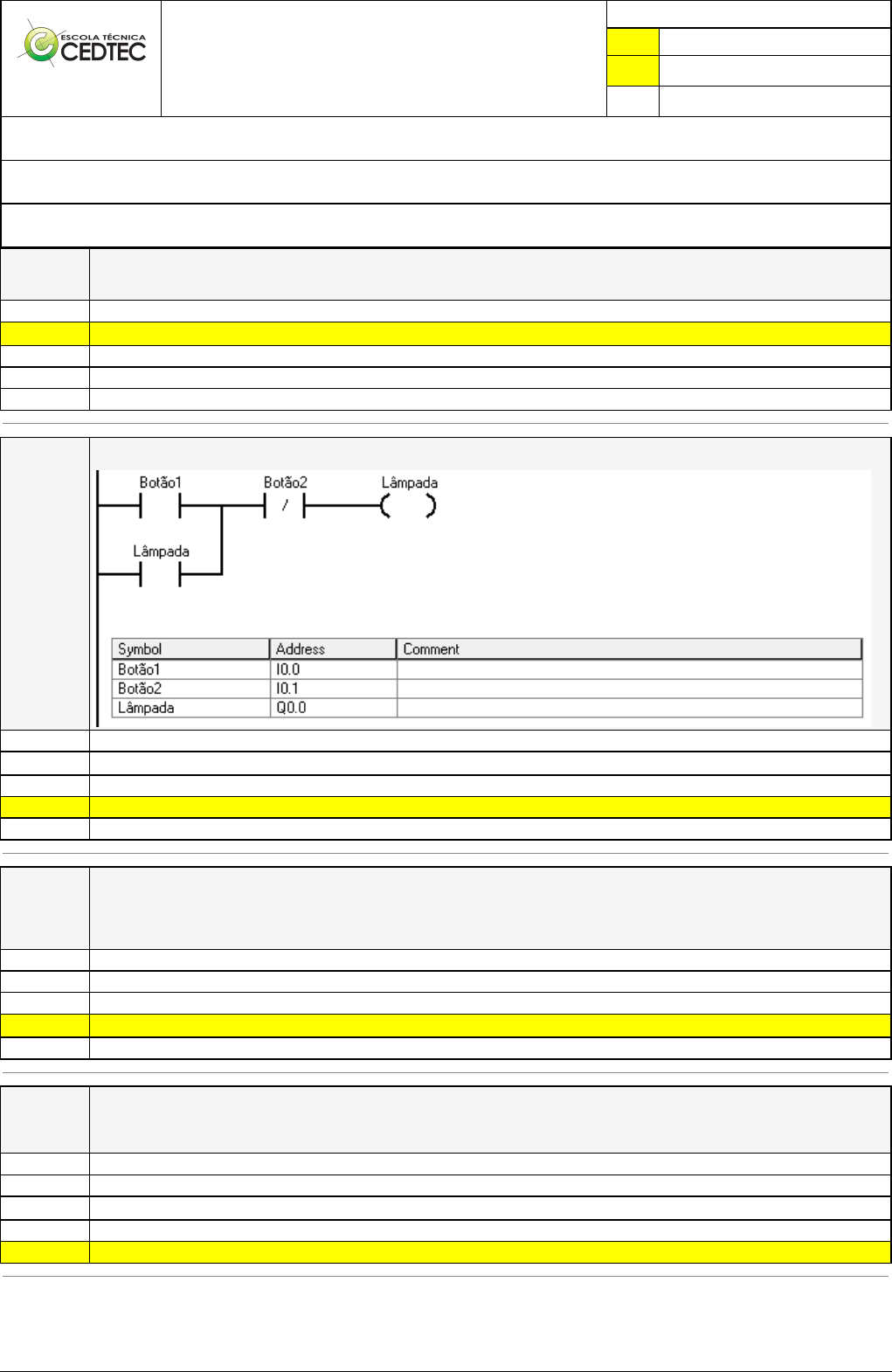Pincel Atômico - 04/09/2025 10:36:44 1/5 ELISON SANTOS ALVES Avaliação Presencial (EAD) Atividade finalizada em 01/08/2025 08:58:02 (4541052 / 1) LEGENDA Resposta correta na questão # Resposta correta - Questão Anulada X Resposta selecionada pelo Aluno Disciplina: CONTROLADOR LÓGICO PROGRAMÁVEL [1486001] - Avaliação com 20 questões, com o peso total de 51,00 pontos [capítulos - Todos] Turma: Curso Técnico: Eletrotécnica - Grupo: EAD - 02/25 - EAD ELE [158040] Aluno(a): 91479190 - ELISON SANTOS ALVES - Respondeu 17 questões corretas, obtendo um total de 43,35 pontos como nota [350097_348] Questão 001 Stdio.h e stdlib.h são tipos de: Funções X Bibliotecas Métodos Operações Tags [350097_1409 0] Questão 002 No circuito abaixo, ao energizar e sem seguida desenergizar o contato chamado Botão1 e manter o contato Botão2 desenergizado, o contato Lâmpada irá: Ter em sua saída o valor de 20ma X Ter sinal lógico baixo Ter em sua saída o valor de 4ma Ter sinal lógico alto Não tem valor de saída [350097_1269 77] Questão 003 No fim do código abaixo valor armazenado na variável “Resultado” será: inteiro x, y resultado; x = 3; y= 2; resultado =x*(y+5); 9 15 11 X 21 16 [350097_7642 ] Questão 004 Um transmissor de temperatura transmite 0V quando a temperatura no processo é de 0ºC e 10V quando a temperatura é igual a 100ºC. A tensão enviada para o PLC varia de forma proporcional a variação da temperatura. Ele deve ser conectado ao PLC através de: De uma saída analógica De uma saída digital X De uma entrada digital De uma entrada Tristate De uma entrada analógica Pincel Atômico - 04/09/2025 10:36:44 2/5 [350097_1275 12] Questão 005 Dado o temporizador a seguir, quanto tempo ele demorará para energizar DN quando sua entrada for energizada? 0 segundos X 5 segundos 50 segundos 1 segundos Ele nunca energizará DN [350097_1268 88] Questão 006 São características de sinais digitais serem: Discretos na amplitude, não importando a variação no tempo. Discretos no tempo e contínuos na amplitude. Contínuos no tempo e discretos na amplitude. Contínuos no tempo e contínuos na amplitude. X Discretos no tempo e discretos na amplitude. [350097_1268 85] Questão 007 A figura abaixo representa um sistema de controle de malha fechada: Qual é o dispositivo dado pelo número 3: Supervisório Sensor Atuador Controlador X Processo [350097_1269 87] Questão 008 O diagrama Ladder abaixo representa uma: Associação com saídas em paralelo Associação do tipo “SELO” Associação do tipo “OU” Associação do tipo “NÃO” X Associação do tipo “E” [350097_5670 4] Questão 009 Qual expressão representa o diagrama a seguir? A e B e C não aciona Z Pincel Atômico - 04/09/2025 10:36:44 3/5 Apenas A e B ou apenas A e C ou apenas B e C aciona Z Apenas A e B e C aciona Z Apenas A ou apenas B ou apenas C aciona Z X A e B ou A e C ou B e C aciona Z [350097_1268 89] Questão 010 Qual das alternativas NÃO é característica de um CLP: Grande confiabilidade. Permitem interface de comunicação com outros CLPs. X Não poderem realizar operações aritméticas. São programáveis. Podem ser reutilizados. [350098_1269 69] Questão 011 O diagrama abaixo demonstra uma lógica de decisão, qual das alternativas representa um comportamento adequado da lógica? O diagrama faz o teste se um número é negativo, se falso ele apresenta a mensagem “Raízes complexas” ao usuário. O diagrama faz o teste se um número é positivo, se verdadeiro ele apresenta a mensagem “Raízes complexas” ao usuário. O diagrama faz o teste se um número é positivo, se falso ele tira a raiz quadrada desse número para apresentar ao usuário. X O diagrama faz o teste se um número é positivo, se verdadeiro ele tira a raiz quadrada desse número para apresentar ao usuário. O diagrama faz o teste se um número é negativo, se verdadeiro ele tira a raiz quadrada desse número para apresentar ao usuário. [350098_7645 ] Questão 012 Ao realizar um projeto de uma máquina automatizada, você se deparou com a seguinte situação: A máquina, que foi solicitada a automatização, dispõe de 3 contatores 220v/60hz, 4 sinaleiros 220v e uma sirene de alarme de 127v. Sabendo dessas informações, qual tipo de saída que melhor atende a necessidade desse projeto? Saída a transistor ou a relé Saída a transistor Saída PWM X Saída à relé Saída digital [350098_5670 6] Questão 013 O diagrama abaixo representa o funcionamento de uma bomba para abastecer um tanque de água. Como essa bomba funciona? A bomba só funciona quando o nível estiver baixo e o botão estiver pressionado. X Ao indicar o nível baixo a bomba funciona até a indicação do nível alto ou até pressionar o botão, ela também funciona enquanto o botão estiver pressionado. A bomba funciona sempre que não estiver no nível alto ou quando o botão é pressionado. A bomba funciona apenas quando o nível não está alto e o botão está pressionado. Ao indicar nível alto a bomba funciona até atingir o nível baixo ou até pressionar o botão, ela também funciona enquanto o botão estiver pressionado. [350098_361] Questão 014 A função Leia() do portugol se equivale a que função da linguagem C? If() Print() Pincel Atômico - 04/09/2025 10:36:44 4/5 Printf() Scan() X Scanf() [350098_1269 88] Questão 015 O diagrama Ladder abaixo representa uma: Associação com saídas em paralelo Associação do tipo “SELO” Associação do tipo “OU” X Associação do tipo “E” Associação do tipo “NÃO” [350098_1269 00] Questão 016 Baseando-se na estrutura interna de um CLP, a memória do programa monitor: X É responsável pelo gerenciamento de todas as atividades do CLP. Não pode ser modificado pelo usuário e fica normalmente em memórias do tipo PROM, EPROM, EEPROM. Ele funciona de maneira similar ao Sistema Operacional dos microcomputadores. Converte a tensão alternada da rede elétrica para uma tensão contí