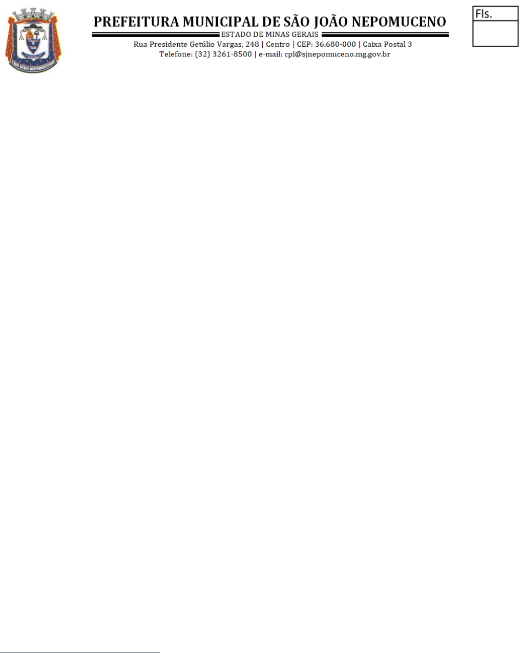 1 de 29 PREGÃO ELETRÔNICO 74/2025 CONTRATANTE: PREFEITURA MUNICIPAL DE SÃO JOÃO NEPOMUCENO/MG. OBJETO: Aquisição de 02 (dois) veículos de passeio, (capacidade para 5 lugares) para a Secretaria Municipal de Saúde. VALOR TOTAL DA CONTRATAÇÃO: R$ 224.618,00 (duzentos e vinte e quatro mil e seiscentos e dezoito reais) DATA DA SESSÃO PÚBLICA: Data da abertura da Sessão pública: -- Horário (Brasília): -- LOCAL: www.ammlicita.org.br (Plataforma AMM LICITA) CRITÉRIO DE JULGAMENTO: MENOR PREÇO http://www.ammlicita.org.br 2 de 29 Sumário 1. DO OBJETO: 2. DOS RECURSOS ORÇAMENTÁRIOS: 3. DO CRITÉRIO DE JULGAMENTO: 4. DAS CONDIÇÕES DE PARTICIPAÇÃO: 5. DO CREDENCIAMENTO: 6. DA APRESENTAÇÃO DA PROPOSTA E DOS DOCUMENTOS DE HABILITAÇÃO: 7. DO PREENCHIMENTO DA PROPOSTA: 8. DA ABERTURA DA SESSÃO, CLASSIFICAÇÃO DAS PROPOSTAS E FORMULAÇÃO DE LANCES: 9. JULGAMENTO DAS PROPOSTAS E DIREITO DE PREFERÊNCIA: 10. DA HABILITAÇÃO: 10.6. DA HABILITAÇÃO JURÍDICA: 10.7. DA HABILITAÇÃO FISCAL: 10.9. DOCUMENTAÇÃO RELATIVA À HABILITAÇÃO SOCIAL: 10.10. HABILITAÇÃO ECONÔMICA- FINANCEIRA: 10.11. DA QUALIFICAÇÃO TÉCNICA 11. DO ENCAMINHAMENTO DA PROPOSTA VENCEDORA 12. DO RECURSO: 13. DA ADJUDICAÇÃO, HOMOLOGAÇÃO E DAS CONDIÇÕES DE AQUISIÇÃO: 14. REQUISITOS DA CONTRATAÇÃO: 15. DO CONTROLE, FISCALIZAÇÃO E À GESTÃO DE CONTRATO: 16. DA ENTREGA E CRITÉRIO DE ACEITAÇÃO DO OBJETO E CONDIÇÕES DE PAGAMENTO: 17. DAS SANÇÕES ADMINISTRATIVAS: 3 de 29 18. DO PAGAMENTO: 19. DA IMPUGNAÇÃO AO EDITAL E DO PEDIDO DE ESCLARECIMENTO: 20. DAS DISPOSIÇÕES GERAIS: 4 de 29 EDITAL n° 187/2025 PREGÃO ELETRÔNICO nº 74/2025 O Município de São João Nepomuceno - MG, torna público que fará realizar licitação, sob a modalidade de PREGÃO ELETRÔNICO, modo de disputa ABERTO, pelo critério de julgamento MENOR PREÇO para Aquisição de 02 (dois) veículos de passeio, (capacidade para 5 lugares) para a Secretaria Municipal de Saúde., devidamente descritos, caracterizados e especificados no Termo de Referência, na forma da lei. A presente licitação se rege por toda a legislação aplicável à espécie, especialmente pelas normas de caráter geral da Lei Federal nº 14.133/2021, pela Lei Complementar Federal nº 123/2006, com as alterações promovidas pela Lei Complementar nº 147/2014, Lei Complementar Municipal nº 79/2023, Decreto Municipal nº 4.420/2023 e demais legislações aplicáveis, bem como pelos preceitos de Direito Público, pelas disposições deste Edital e de seus Anexos, normas que as licitantes declaram conhecer e a elas se sujeitarem incondicional e irrestritamente. • Data de abertura da sessão pública: --; • Horário: --; • Local: www.ammlicita.org.br; 1. DO OBJETO 1.1. O objeto da presente licitação é a Aquisição de 02 (dois) veículos de passeio, (capacidade para 5 lugares) para a Secretaria Municipal de Saúde., conforme as especificações constantes do Termo de Referência, 2. DOS RECURSOS ORÇAMENTÁRIOS: 2.1. As despesas decorrentes da presente contratação correrão à conta de recursos específicos c o n s i g n a d o s n o O r ç a m e n t o G e r a l d o M u n i c í p i o , c o n f o r m e : 4.490.52.00.2.07.02.10.302.0020.1.0022 Fonte 1.621.000 2.2. Uma vez que a Lei Federal nº 14.133, de 01 de abril de 2021 entrou em vigor no Município de São João Nepomuceno - MG apenas em novembro de 2023, tem-se que não foi desenvolvido o Plano de Contratações Anual (PCA), sendo assim, a despesa em questão, não se encontrava prevista de ser executada neste dispositivo. 2.3. Por se tratar de uma estimativa de gastos, a quantia acima mencionada não se constitui, em hipótese alguma, em compromisso futuro para a Prefeitura Municipal de São João Nepomuceno/MG, razão pela qual não poderá ser exigida, nem considerada como valor para pagamento mínimo, podendo sofrer acréscimos ou supressões, de acordo com a necessidade da Prefeitura Municipal, sem que isso justifique qualquer indenização a Licitante vencedora. 2.4. O valor total estimado para a licitação é de R$ 224.618,00 (duzentos e vinte e quatro mil e seiscentos e dezoito reais) http://www.ammlicita.org.br 5 de 29 3. DO CRITÉRIO DE JULGAMENTO: 3.1. O critério de julgamento da presente licitação é o MENOR PREÇO. 4. DAS CONDIÇÕES DE PARTICIPAÇÃO: 4.1. Poderão participar da presente licitação todas as microempresas e empresas de pequeno porte interessadas que comprovarem possuir os requisitos de qualificação exigidos neste Edital e que estejam credenciadas junto ao Provedor do Sistema (https://ammlicita.org.br/). 4.2. A licitante responde integralmente por todos os atos praticados no pregão eletrônico por seus representantes devidamente credenciados, assim como pela utilização da senha de acesso ao sistema, ainda que indevidamente, inclusive por pessoa não credenciada como sua representante. 4.3. Cada representante credenciado poderá representar apenas uma licitante, em cada pregão eletrônico. 4.4. O envio da proposta vinculará a licitante ao cumprimento de todas as condições e obrigações inerentes ao certame. 4.5. Não serão admitidas nesta licitação as empresas suspensas do direito de licitar, no prazo e nas condições do impedimento, e as declaradas inidôneas pela Administração Direta ou Indireta, assim como as empresas e/ou seu sócio majoritário que tenham sido apenados com proibição de contratar com a Administração Pública, nos termos do art. 12 da Lei Federal nº 8.429/1992 e alterações posteriores. 4.6. Será permitida a participação de sociedades cooperativas, desde que apresentem a documentação de habilitação descrita no subitem 10.6.7. 4.7. Será permitida a participação em consórcio, sujeita às seguintes regras: a) As empresas consorciadas apresentarão instrumento público ou particular de compromisso de constituição de consórcio, subscrito por todas elas, indicando a empresa líder, que será responsá