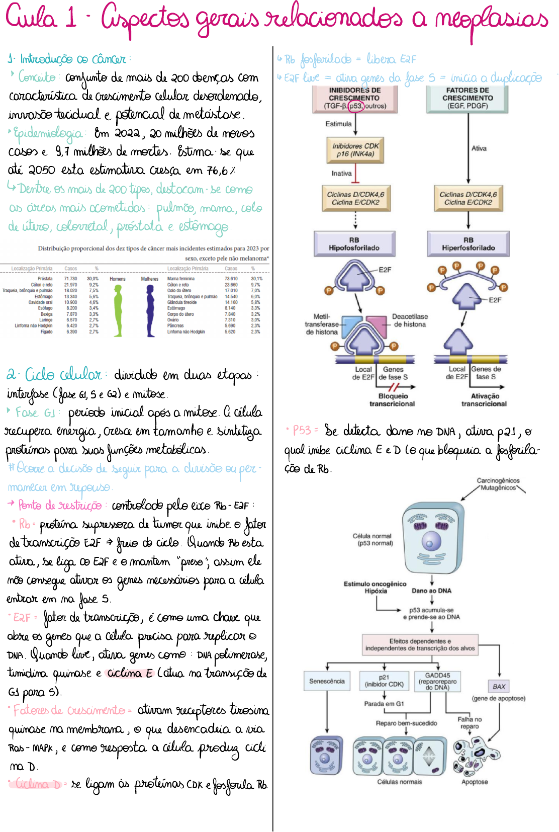 1 gerais relacionados a 1. câncer Rb libera E2F Conceito conjunto de mais de 200 doenças com E2F live = ativa genes da fase S = inicia a duplicaçõe de crescimento celular INIBIDORES DE FATORES DE CRESCIMENTO CRESCIMENTO (EGF, PDGF) tecidual e potencial de Estimula Em 2022, 20 milhões de Inibidores CDK casos e 9,7 milhões de mortes. se que Ativa p16 (INK4a) até 2050 esta estimativa em 76,6% Inativa Dentre os mais de 200 se come Ciclinas D/CDK4,6 Ciclinas D/CDK4,6 Ciclina E/CDK2 Ciclina E/CDK2 as áreas mais ocometidos pulmão, mama, colo de colorretal, e estômage RB RB Distribuição proporcional dos dez tipos de câncer mais incidentes estimados para 2023 por Hipofosforilado Hiperfosforilado sexo, exceto pele não melanoma* Localização Primária Casos % Localização Primária Casos % E2F Próstata 71.730 Homens Mulheres Mama feminina 73.610 30,1% Cólon reto 9,2% Cólon reto 23.660 9,7% P Traqueia, brônquio pulmão 18.020 7,5% Colo útero 17.010 7,0% Estômago 13.340 5,6% Traqueia, brônquio pulmão 14.540 6,0% Cavidade oral 10.900 Glândula tireoide 14.160 5,8% E2F Esôfago 8.200 3,4% Estômago 8.140 3,3% Bexiga 7.870 3,3% Corpo do útero 7.840 3,2% Metil- Deacetilase Laringe 6.570 2,7% Ovário 7.310 3,0% Linfoma não Hodgkin 6.420 2,7% Pâncreas 5.690 2,3% transferase de histona 6.390 2,7% Linfoma não Hodgkin 5.620 2,3% de histona Ciclo celular em duas etopas Local Genes Local Genes de de E2F de fase S de E2F fase S interfase G1, S e G2) e mitose. Bloqueio Ativação transcricional transcricional Fase periodo inicial apos a a recupera energia, em tamanho e sintetiza P53 = Se detecta dane DNA, ativa p21, proteínas para suas funções metabólicas. qual inibe ciclina E e D que bloqueia a fosforila- # Ocorre a decisão de seguir para a divisão ou per- çõe de Rb. Carcinogênicos manecer em Mutagênicos de restriçõe controlado pelo Rb E2F Rb proteína supressora de tumor que inibe fater Célula normal de transcrição E2F freio do Quando Rb esta (p53 normal) se liga E2F e mantem "preso", assim ele consegue ativar os genes necessários para a Estímulo oncogênico Hipóxia Dano ao DNA entrar em ma fase S. p53 acumula-se E2F fater de é uma que e prende-se ao DNA abre os genes que a precisa para replicar Efeitos dependentes e independentes de transcrição dos alvos DNA. Quando live, ativa genes como DNA polimerase, timidina quinase e ciclina E (atua ma transição de p21 GADD45 Senescência (inibidor CDK) (reparoreparo do DNA) BAX G1 para S). (gene de apoptose) Parada em G1 . Fatores de ativam receptores tirosina Falha no Reparo bem-sucedido quinase ma membrana, que desencadeia a via reparo Ras e como resposta a cilula produz cicli ma D. se ligam às proteínas CDK e fosforila Rb. Células normais ApoptoseFase S: em que ocorre a replicação do 1. cromossomes am a passa de 2n para 4n. Cada migram para os pelos. gera uma cromatide ligadas pelo centrômero, 2. plane onde cada molicula de DNA uma fita equatorial. original e sintetiza uma 3. irmãs se separam e mantem a em migram para os pelos andamento. 4. Telofase da carioteca e desconden Fase G2: preparação para a mitose. Sintese de 5. Citocinese: do citoplasma, formando duas tubulinas, condensinas e histonas. filhas de checkpoint para a célula ser liberada para mitose. Verifica se todo DNA foi duplicado corretamente e se mão ha quebras ou Metáfase Pró-metáfase Anáfase mutações. Durante G2, a célula possui sensores mo- leculares de Prófase Telófase ATM = responde a quebras de fita dupla de DNA Etapas da Mitose ATR = responde a estresse replicativo e fitas sim- Interfase Citocinese ples Se ATM/ATR ativam Chk de restrição entre a e ana Chk bloqueia fase, a faz um check point, conferindo Chk ativa P53 se cromossomos estão alinhados equador P53 ativa P21 que inibe ciclinas E eD e se estão conectados corretamente Rb mõe é = bloqueio de DNA dsbs as proteínas que Jazem isso APC = complexo promoter da anáfase, só é quando os estão ATM ATR tamente APC degrada segurina, libe- Chk2 rando a separase, que quebra as coesinas Chk1 Ser15 cromatides se separam. ? MAB e BUB = detectam mal conec- MDM2 p53 bloqueiam APC impede anáfase até a correção. P P APC/C Ser15 Ser20 APC/C p53 Accumulation segurina Transactivating function agrega una protosoma Apoptosis segurina (reciclaje) separasa G₁ phase arrest separasa jactiva! inactiva fase onde a efetivamente se divide. Dividida em cohesina mantiene jruptura! cohesina partida, unidas las cromátidas cromátidas se separanEm suma, principais pontos de checagem que se ligam complexo 1. enrolve Rb e Ciclina D + CDK4/6 CDK e bloqueiam sua 2. G2/M ATM, ATR e que inibe CDK1 principal é P21. 3. / APC e Ciclina B+ APC's marca proteínas para degradação pelo cadeias de Controla a transição da Máquinas do ciclo celular: para a CDK's que adicionam a proteínas. alvo. Estão sempre presentes ma célula em forma inati- 4. Câncer Para serem precisam ligar- a uma Benigno X Quando fosforilam proteinas que Neoplasia benigna lento e progres- impulsionam a célula para a fase do bem tecidos rizi- ciclo. mõe faz bem Ciclinas: proteínas regulatórias que variam cicli- ciadas. camente em concentração longo do ciclo Neoplasia maligna crescimento e lar. as CDK's, ativando as e determina mal delimitado; membra- quando e em qual fase CDK ma basal e outros tecidos; mal diferenciodas. cyclin Cdk-activating kinase cyclin Neoplasia benigna Neoplasia maligna ATP ATP ATP Formato Esférico e bem definido Irregular Bordas Bem delimitadas Irregulares T-loop Cdk active site activating phosphate Padrão de Lento podendo se Pode ser rápido e acontece (A) INACTIVE (B) PARTLY ACTIVE (C) FULLY ACTIVE crescimento estabilizar de forma infiltrativa Metástase Não ocorre Pode acontecer M PONTO DE VERIFICAÇÃO G2 PONTO DE VERIFICAÇÃO mitosis Gradação Células bem Células pode ser bem ou (nuclear Ciclina B/A division) cytokinesis histológica diferenciadas pouco diferenciadas PHASE (cytoplasmic M