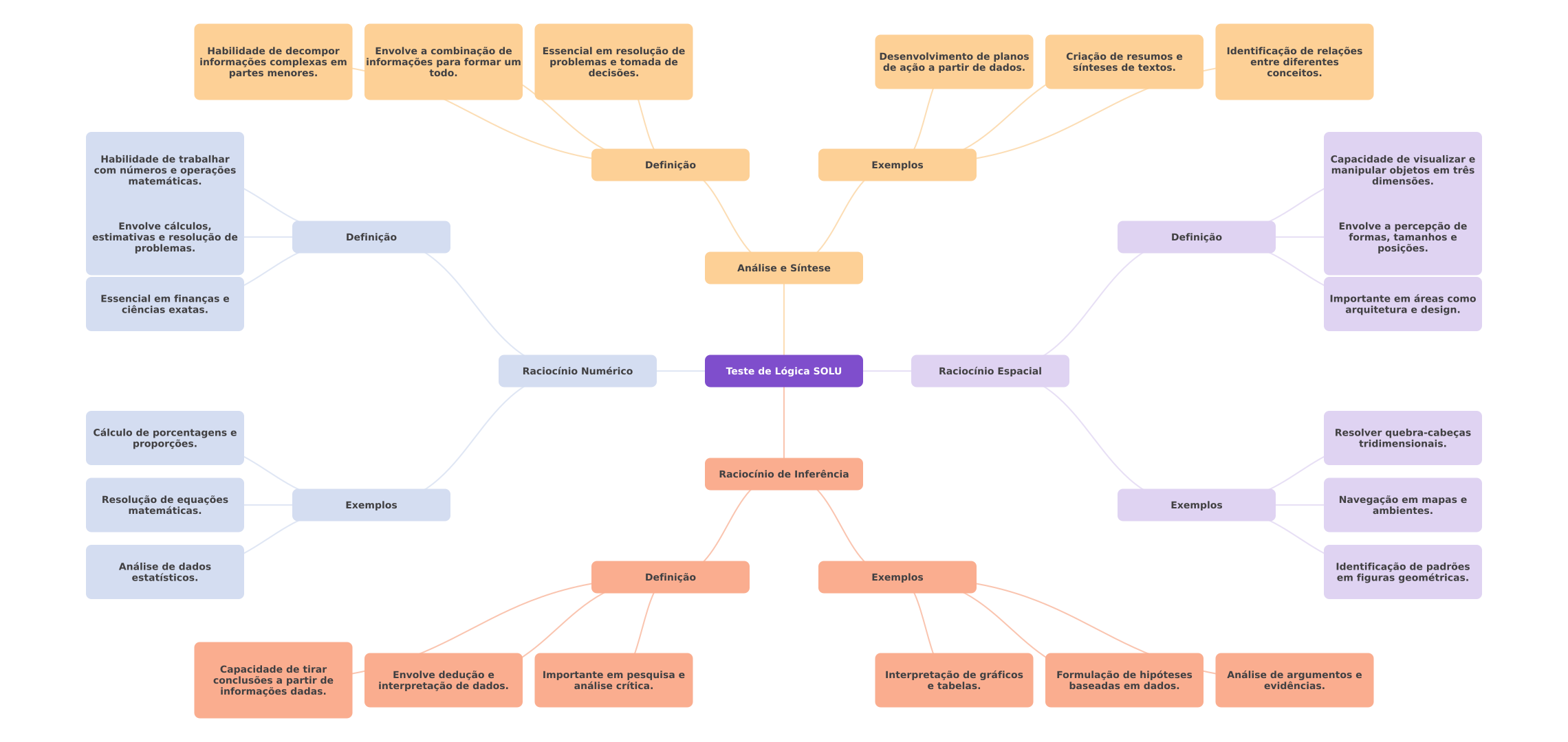 Habilidade de decompor Envolve a combinação de Essencial em resolução de informações complexas em informações para formar um problemas e tomada de Desenvolvimento de planos Criação de resumos e Identificação de relações entre diferentes de ação a partir de dados. sínteses de textos. partes menores. todo. decisões. conceitos. Habilidade de trabalhar Capacidade de visualizar e com números e operações Definição Exemplos manipular objetos em três matemáticas. dimensões. Envolve cálculos, Envolve a percepção de estimativas e resolução de Definição Definição formas, tamanhos e problemas. posições. Análise e Síntese Essencial em finanças e Importante em áreas como ciências exatas. arquitetura e design. Raciocínio Numérico Teste de Lógica SOLU Raciocínio Espacial Cálculo de porcentagens e Resolver quebra-cabeças proporções. tridimensionais. Raciocínio de Inferência Resolução de equações matemáticas. Exemplos Exemplos Navegação em mapas e ambientes. Análise de dados Identificação de padrões estatísticos. Definição Exemplos em figuras geométricas. Capacidade de tirar Envolve dedução e conclusões a partir de Importante em pesquisa e Interpretação de gráficos Formulação de hipóteses Análise de argumentos e interpretação de dados. análise crítica. e tabelas. baseadas em dados. evidências. informações dadas.