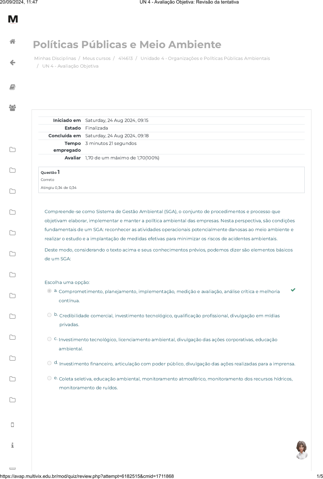 Minhas Disciplinas / Meus cursos / 414613 / Unidade 4 - Organizações e Políticas Públicas Ambientais / UN 4 - Avaliação Objetiva Políticas Públicas e Meio Ambiente Iniciado em Saturday, 24 Aug 2024, 09:15 Estado Finalizada Concluída em Saturday, 24 Aug 2024, 09:18 Tempo empregado 3 minutos 21 segundos Avaliar 1,70 de um máximo de 1,70(100%) Questão 1 Correto Atingiu 0,34 de 0,34 Compreende-se como Sistema de Gestão Ambiental (SGA), o conjunto de procedimentos e processo que objetivam elaborar, implementar e manter a política ambiental das empresas. Nesta perspectiva, são condições fundamentais de um SGA: reconhecer as atividades operacionais potencialmente danosas ao meio ambiente e realizar o estudo e a implantação de medidas efetivas para minimizar os riscos de acidentes ambientais. Deste modo, considerando o texto acima e seus conhecimentos prévios, podemos dizer são elementos básicos de um SGA: Escolha uma opção: a. Comprometimento, planejamento, implementação, medição e avaliação, análise crítica e melhoria contínua. b. Credibilidade comercial, investimento tecnológico, quali�cação pro�ssional, divulgação em mídias privadas. c. Investimento tecnológico, licenciamento ambiental, divulgação das ações corporativas, educação ambiental. d. Investimento �nanceiro, articulação com poder público, divulgação das ações realizadas para a imprensa. e. Coleta seletiva, educação ambiental, monitoramento atmosférico, monitoramento dos recursos hídricos, monitoramento de ruídos. 20/09/2024, 11:47 UN 4 - Avaliação Objetiva: Revisão da tentativa https://avap.multivix.edu.br/mod/quiz/review.php?attempt=6182515&cmid=1711868 1/5 https://avap.multivix.edu.br/my/ https://avap.multivix.edu.br/course/view.php?id=29160 https://avap.multivix.edu.br/course/view.php?id=29160§ion=5 https://avap.multivix.edu.br/mod/quiz/view.php?id=1711868 https://avap.multivix.edu.br/my/ https://avap.multivix.edu.br/course/view.php?id=29160 https://avap.multivix.edu.br/user/index.php?id=29160 https://avap.multivix.edu.br/course/view.php?id=29160§ion=1 https://avap.multivix.edu.br/course/view.php?id=29160§ion=2 https://avap.multivix.edu.br/course/view.php?id=29160§ion=3 https://avap.multivix.edu.br/course/view.php?id=29160§ion=4 https://avap.multivix.edu.br/course/view.php?id=29160§ion=5 https://avap.multivix.edu.br/course/view.php?id=29160§ion=6 https://avap.multivix.edu.br/course/view.php?id=29160§ion=7 https://avap.multivix.edu.br/course/view.php?id=29160§ion=8 https://avap.multivix.edu.br/course/view.php?id=29160§ion=9 https://avap.multivix.edu.br/course/view.php?id=29160§ion=10 https://avap.multivix.edu.br/course/view.php?id=29160§ion=11 https://avap.multivix.edu.br/course/view.php?id=29160§ion=12 https://avap.multivix.edu.br/course/view.php?id=29160§ion=13 https://avap.multivix.edu.br/hooks/portal/ https://avap.multivix.edu.br/mod/page/view.php?id=1252%2F%22%20target%3D%22_blank https://avap.multivix.edu.br/calendar/view.php/ https://avap.multivix.edu.br/ https://avap.multivix.edu.br/ https://avap.multivix.edu.br/ https://avap.multivix.edu.br/ https://avap.multivix.edu.br/ https://avap.multivix.edu.br/ Questão 2 Correto Atingiu 0,34 de 0,34 A lei nº 12.305/2010 que instituiu a Política Nacional de Resíduos Sólidos (PNRS), prevê a logística reversa: instrumento de desenvolvimento econômico e social caracterizado por um conjunto de ações, procedimentos e meios destinados a viabilizar a coleta e a restituição dos resíduos sólidos ao setor empresarial, para reaproveitamento, em seu ciclo ou em outros ciclos produtivos, ou outra destinação �nal ambientalmente adequada. Fonte: BRASIL. Política Nacional de Resíduos Sólidos. Disponível em: http://www.planalto.gov.br/ccivil_03/_ato2007-2010/2010/lei/l12305.htm. Acesso em: 07/07/2018. Considerando o que estabelece essa lei, avalie as a�rmações a seguir: I - São instrumentos da Política Nacional de Resíduos Sólidos, entre outros: a coleta seletiva, os sistemas de logística reversa e outras ferramentas relacionadas à implementação da responsabilidade compartilhada pelo ciclo de vida dos produtos. II - São obrigados a estruturar e implementar sistemas de logística reversa, mediante retorno dos produtos após o uso pelo consumidor, de forma independente do serviço público de limpeza urbana e de manejo dos resíduos sólidos, os fabricantes, importadores, distribuidores e comerciantes de: agrotóxicos, pilhas e baterias, pneus, óleos lubri�cantes, seus resíduos e embalagens, lâmpadas �uorescentes, de vapor de sódio e mercúrio e de luz mista, produtos eletroeletrônicos e seus componentes. III – Incluem na logística reversa dos agrotóxicos seus resíduos e embalagens, assim como outros produtos cuja embalagem, após o uso, constitua resíduo perigoso observado as regras de gerenciamento de resíduos perigosos previstas em lei ou regulamento. IV – Incluindo os consumidores, ou seja, a sociedade civil, todos os participantes dos sistemas de logística reversa manterão atualizados e disponíveis ao órgão municipal competente e a outras autoridades informações completas sobre a realização das ações sob sua responsabilidade. Assinale qual ou quais alternativas são verdadeiras. Escolha uma opção: a. I, II, III e IV b. I, II e III c. I e II d. I e IV e. I, II e IV 20/09/2024, 11:47 UN 4 - Avaliação Objetiva: Revisão da tentativa https://avap.multivix.edu.br/mod/quiz/review.php?attempt=6182515&cmid=1711868 2/5 http://www.planalto.gov.br/ccivil_03/_ato2007-2010/2010/lei/l12305.htm https://avap.multivix.edu.br/my/ https://avap.multivix.edu.br/course/view.php?id=29160 https://avap.multivix.edu.br/user/index.php?id=29160 https://avap.multivix.edu.br/course/view.php?id=29160§ion=1 https://avap.multivix.edu.br/course/view.php?id=29160§ion=2 https://avap.multivix.edu.br/course/view.php?id=29160§ion=3 https://avap.multivix.edu.br/course/view.php?id=29160§i