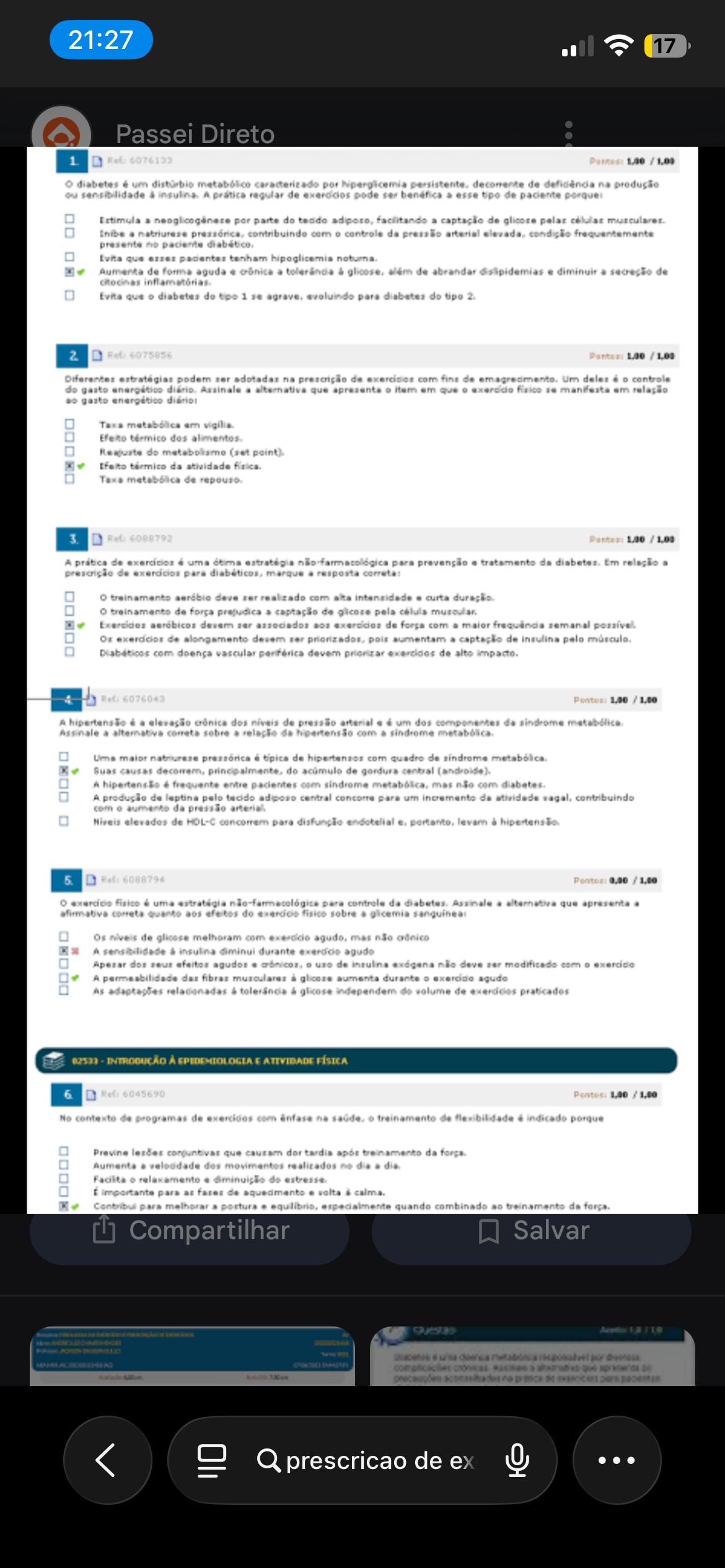 21:27 17 Passei Direto 1. Ref: 6076133 diabetes é um metabólico caracterizado por hiperglicemia decorrente de na produção ou sensibilidade A prática regular de pode ser benéfica a esse tipo de paciente Estimula a por parte do teddo a captação de glicose célular Inibe a natriurese contribuindo controle da pressão arterial condição presente no paciente Evita que tenham Aumenta de forma aguda a além de abrandar dislipidemias e diminuir secreção de Evita que diabetes do tipo 1 evoluindo para diabetes do tipo 2. 2 6075856 1.00 Diferentes podem adotadas na prescrição de com de Um controle do gasto energético Assinale que D em que exercido manifesta em relação gasto energético metabólica em Efeito térmico dos Reajuste do metabolismo (set point). da atividade metabólica de 3. 1.00 A prática de uma estratégia para prevenção tratamento Em prescrição de para diabéticos, marque realizado com alta curta de força prejudica a captação de glicose pela célula aeróbicos associados de força com a maior frequência Oz de alongamento a captação de pelo Diabéticos com doença vascular periférica devem priorizar de alto 4 6076043 1.00 1.00 A hipertensão é a elevação crônica dos níveis de pressão arterial é um dos componentes da sindrome Assinale a alternativa correta sobre a relação da hipertensão com a sindrome Uma maior pressórica é de com quadro de sindrome Suas principalmente, do de gordura central A frequente entre pacientes com sindrome mas não com A produção de leptina pelo tecido adiposo central concorre para um incremento atividade contribuindo com 0 da pressão elevados de para disfunção endotelial e. levern à 5. 6088794 0.00 1.00 uma para controle da Assinale a que apresenta correta quanto aos efeitos sobre a glicemia Os de glicose melhoram com agudo, mas não sensibilidade insulina diminui durante dor agudos . de não modificado A fibras à glicose aumenta durante agudo As adaptações relacionadas glicose independem volume de praticados 02533 INTRODUÇÃO E ATIVIDADE FÍSICA Ref: 6045690 1.00 No contexto de programas de com na de flexibilidade indicado porque Previne que dor tardia após treinamento da Aumenta a movimentos realizados no dia a dia Facilita relaxamento diminuição do importante para de calma. para a especialmente quando combinado treinamento da força. Compartilhar Salvar no