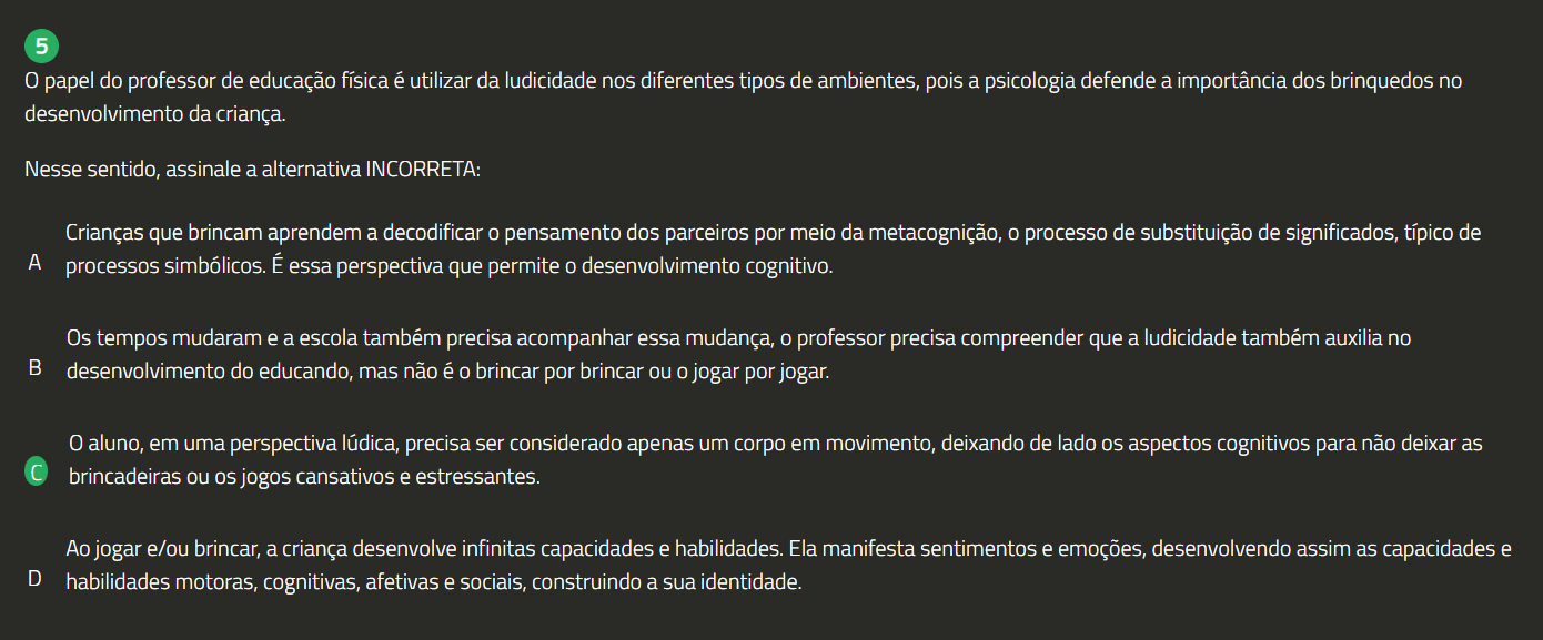 5 0 papel do professor de educação física é utilizar da ludicidade nos diferentes tipos de ambientes, pois a psicologia defende a importância dos brinquedos no desenvolvimento da criança. Nesse sentido, assinale a alternativa INCORRETA: Crianças que brincam aprendem a decodificar 0 pensamento dos parceiros por meio da metacognição, processo de substituição de significados, típico de A processos simbólicos. É essa perspectiva que permite 0 desenvolvimento cognitivo. Os tempos mudaram e a escola também precisa acompanhar essa mudança, 0 professor precisa compreender que a ludicidade também auxilia no B desenvolvimento do educando, mas não é 0 brincar por brincar ou 0 jogar por jogar. aluno, em uma perspectiva lúdica, precisa ser considerado apenas um corpo em movimento, deixando de lado aspectos cognitivos para não deixar as brincadeiras ou jogos cansativos e estressantes. Ao jogar e/ou brincar, a criança desenvolve infinitas capacidades e habilidades. Ela manifesta sentimentos e emoções, desenvolvendo assim as capacidades e D habilidades motoras, cognitivas, afetivas e sociais, construindo a sua identidade.