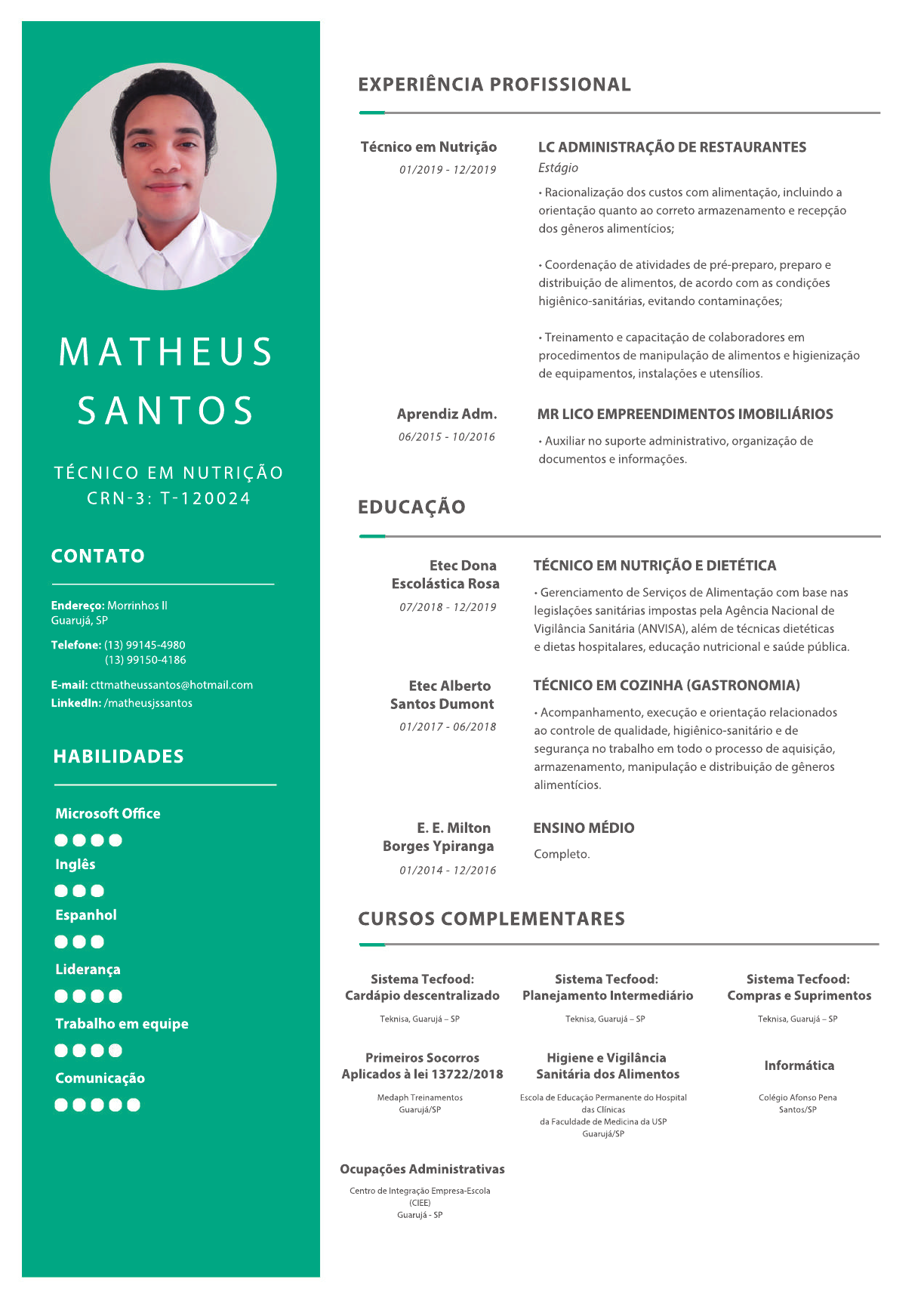 CURSOS COMPLEMENTARES E. E. Milton Borges Ypiranga Sistema Tecfood: Cardápio descentralizado ENSINO MÉDIO Completo. Teknisa, Guarujá – SP Sistema Tecfood: Planejamento Intermediário Teknisa, Guarujá – SP Sistema Tecfood: Compras e Suprimentos Teknisa, Guarujá – SP Primeiros Socorros Aplicados à lei 13722/2018 Medaph Treinamentos Guarujá/SP Ocupações Administrativas Centro de Integração Empresa-Escola (CIEE) Guarujá - SP Higiene e Vigilância Sanitária dos Alimentos Escola de Educação Permanente do Hospital das Clínicas da Faculdade de Medicina da USP Guarujá/SP Informática Colégio Afonso Pena Santos/SP Etec Alberto Santos Dumont TÉCNICO EM COZINHA GASTRONOMIA • Acompanhamento, execução e orientação relacionados ao controle de qualidade, higiênico-sanitário e de segurança no trabalho em todo o processo de aquisição, armazenamento, manipulação e distribuição de gêneros alimentícios. Etec Dona Escolástica Rosa TÉCNICO EM NUTRIÇÃO E DIETÉTICA • Gerenciamento de Serviços de Alimentação com base nas legislações sanitárias impostas pela Agência Nacional de Vigilância Sanitária (ANVISA), além de técnicas dietéticas e dietas hospitalares, educação nutricional e saúde pública. EDUCAÇÃO MR LICO EMPREENDIMENTOS IMOBILIÁRIOS • Auxiliar no suporte administrativo, organização de documentos e informações. • Racionalização dos custos com alimentação, incluindo a orientação quanto ao correto armazenamento e recepção dos gêneros alimentícios; • Coordenação de atividades de pré-preparo, preparo e distribuição de alimentos, de acordo com as condições higiênico-sanitárias, evitando contaminações; • Treinamento e capacitação de colaboradores em• Treinamento e capacitação de colaboradores em procedimentos de manipulação de alimentos e higienização de equipamentos, instalações e utensílios. Técnico em Nutrição Estágio01/2019 - 12/2019 Aprendiz Adm. 06/2015 - 10/2016 07/2018 - 12/2019 01/2017 - 06/2018 01/2014 - 12/2016 LC ADMINISTRAÇÃO DE RESTAURANTES EXPERIÊNCIA PROFISSIONAL Microsoft Office Trabalho em equipe Comunicação LiderançaLiderança Inglês Espanhol HABILIDADES Endereço: Morrinhos II Guarujá, SP Telefone: (13) 99145-4980 (13) 99150-4186 E-mail: cttmatheussantos@hotmail.com LinkedIn: /matheusjssantos CONTATO TÉCNICO EM NUTRIÇÃO CRN3: T120024 MATHEUS SANTOS