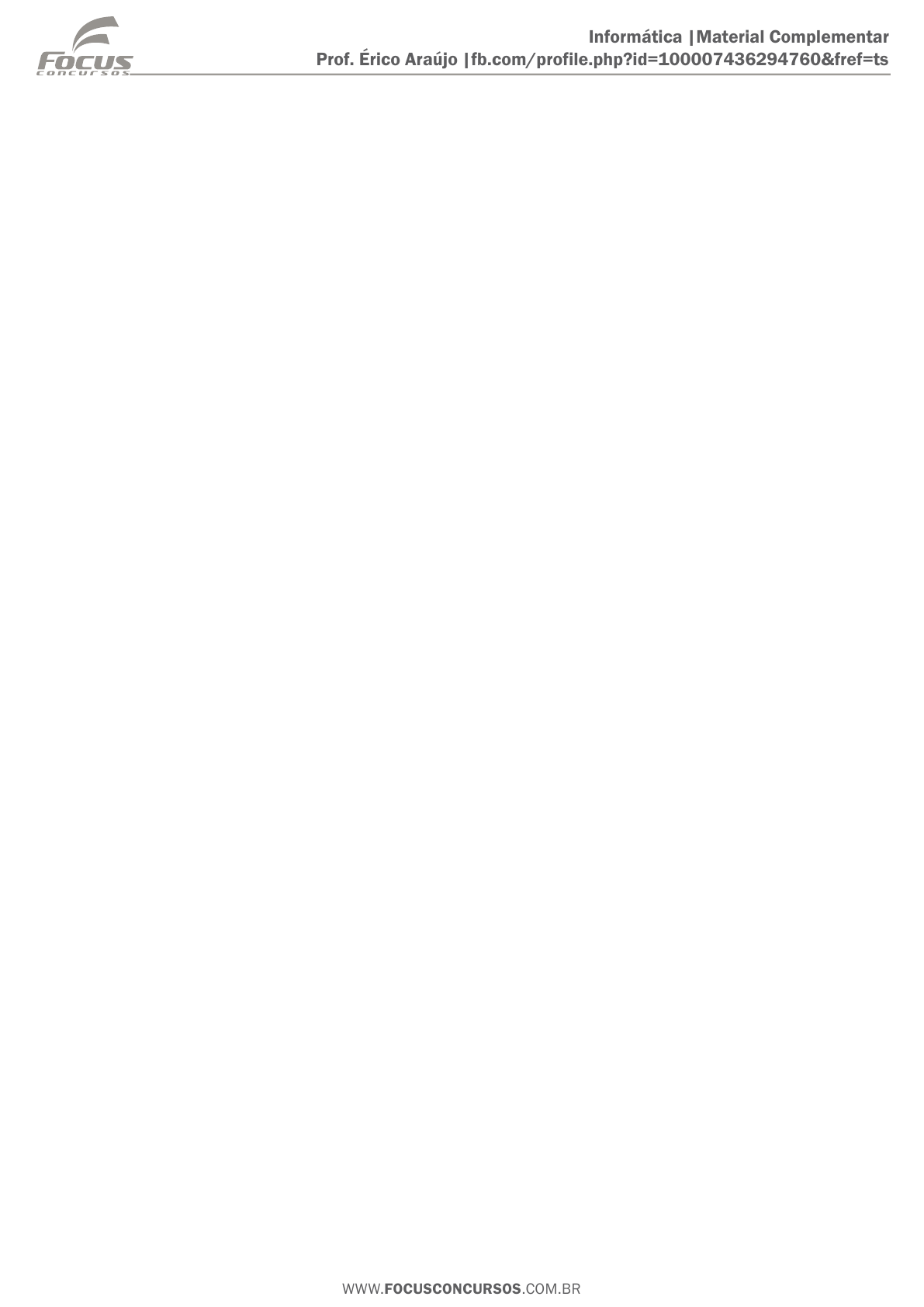 WWW.FOCUSCONCURSOS.COM.BR Informática |Material Complementar Prof. Érico Araújo |fb.com/profile.php?id=100007436294760&fref=ts 1 - A disponibilidade e a integridade são itens que caracterizam a segurança da informação. A primeira representa a garantia de que usuários autorizados tenham acesso a informações e ativos associados quando necessário, e a segunda corresponde à garantia de que sistemas de informações sejam acessíveis apenas àqueles autorizados a acessá-los. ( ) Certo ( ) Errado 2 - O adware, tipo de firewall que implementa segurança de acesso às redes de computadores que fazem parte da Internet, evita que essas redes sejam invadidas indevidamente. ( ) Certo ( ) Errado 3 - O golpe de Pharming é um ataque que consiste em a) corromper o DNS, fazendo com que a URL de um site passe a apontar para um servidor diferente do original. b) alterar as tabelas de roteamento para que o roteador desvie os pacotes para um falso servidor. c) impedir que o servidor DNS converta o endereço em um número IP e assim congestionar a rede. d) instalar um programa cliente no servidor de destino para capturar senhas e endereços de sites. e) travar um servidor de páginas através do envio de pacotes IP inválidos. 4 - Para se abrirem arquivos anexados a mensagens recebidas por correio eletrônico, sem correr o risco de contaminar o computador em uso, é necessário habilitar o firewall do Windows ( ) Certo ( ) Errado 5 - Para assinar uma mensagem digital, o destinatário usa uma chave pública. ( ) Certo ( ) Errado 6 - Os vírus de macro que danificam documentos do Word podem ser eliminados com a instalação do aplicativo Visual Basic for Applications, do Windows. O Visual Basic for Applications (VBA) é uma implementação do Visual Basic da Microsoft incorporada em todos os programas do Microsoft Office - dentro desse pacote estão os famosos aplicativos Office (Word, Excel, Power Point, Access, etc), bem como em outras aplicações da Microsoft, como o Visio, e que foi também. ( ) Certo ( ) Errado 7 - O Google Chrome é uma ferramenta de busca avançada por informações contidas em sítios web desenvolvida pela Google e disponibilizada aos usuários da Internet. Uma das vantagens do Google Chrome em relação a outras ferramentas de busca é a garantia de confiabilidade dos sítios indicados como resultado das buscas realizadas com a ferramenta. ( ) Certo ( ) Errado 8 - Em uma planilha em edição no Calc, se houver um número em uma célula e se, a partir dessa célula, a alça de preenchimento for levada para as células adjacentes, será automaticamente criada uma sequência numérica a partir desse número. ( ) Certo ( ) Errado 9 - Comparadas às redes de longa distância, as redes locais se caracterizam por taxas de erros mais baixas e taxas de transmissão mais altas. ( ) Certo ( ) Errado 10 - Um computador que tem conectado nele uma impressora compartilhada com a rede pode ser adequadamente configurado em um servidor DHCP como se fosse um equipamento com um endereço IP fixo. ( ) Certo ( ) Errado 1 WWW.FOCUSCONCURSOS.COM.BR Informática |Material Complementar Prof. Érico Araújo |fb.com/profile.php?id=100007436294760&fref=ts 11 - Se a empresa instalar um servidor proxy, este permitirá que se mantenha um registro dos sítios listados pelos funcionários, contudo a utilização desse servidor causaria pequeno aumento do tempo de resposta a requisições http de clientes. ( ) Certo ( ) Errado 12 - A atenuação de sinais comporta-se de forma mais previsível nos meios não guiados, se comparada à atenuação em meios guiados. ( ) Certo ( ) Errado 13 – No Windows Explorer quando um arquivo é excluído, ele é transferido e enviado automaticamente para a lixeira, a menos que o usuário selecione o arquivo e pressione Shift + Delete, o que provoca a exclusão definitiva do arquivo. ( ) Certo ( ) Errado 14 - A área de transferência é um local de compartilhamento do computador onde os usuários deuma máquina depositam seus arquivos, possibilitando, assim, a visualização dos dados desses arquivos por outros usuários ou por outras redes, caso o computador esteja conectado à Internet. ( ) Certo ( ) Errado 15 - A menor unidade de informação armazenável em um computador é o byte, suficiente, em muitos casos, para armazenar um caractere. ( ) Certo ( ) Errado 16 - Tanto no sistema operacional Windows quanto no Linux, cada arquivo, diretório ou pasta encontra-se em um caminho, podendo cada pasta ou diretório conter diversos arquivos que são gravados nas unidades de disco nas quais permanecem até serem apagados. Em uma mesma rede é possível haver comunicação e escrita de pastas, diretórios e arquivos entre máquinas com Windows e máquinas com Linux. ( ) Certo ( ) Errado 17 - As funções são fórmulas predefinidas que efetuam cálculos com valores específicos, denominados argumentos. Esses valores são determinados pelo usuário, em uma ordem denominada sintaxe. Cada fórmula necessita de argumentos distintos, formando uma sintaxe diferente. Qual a sintaxe do comando “SE” no Microsoft Excel 2003? a) A sintaxe condicional tem a seguinte ordem: SE(“teste lógico”; “valor 1”; “valor 2”), onde “teste lógico” é uma condição a ser inserida pelo usuário, “valor 1” é o resultado retornado caso o teste lógico seja falso e “valor 2” é retornado caso o teste lógico seja verdadeiro. b) A sintaxe condicional tem a seguinte ordem: SE(“teste lógico”; “valor 1”; “valor 2”), onde “teste lógico” é uma condição a ser inserida pelo usuário, “valor 1” é o resultado retornado caso o teste lógico seja verdadeiro e “valor 2” é retornado caso o teste lógico seja falso. c) A sintaxe condicional tem a seguinte ordem: SE(“teste lógico”; “valor 1”; “valor 2”), onde “teste lógico” é uma condição a ser inserida pelo usuário, “valor 1” e “valor 2” sempre serão retornados pela função ind