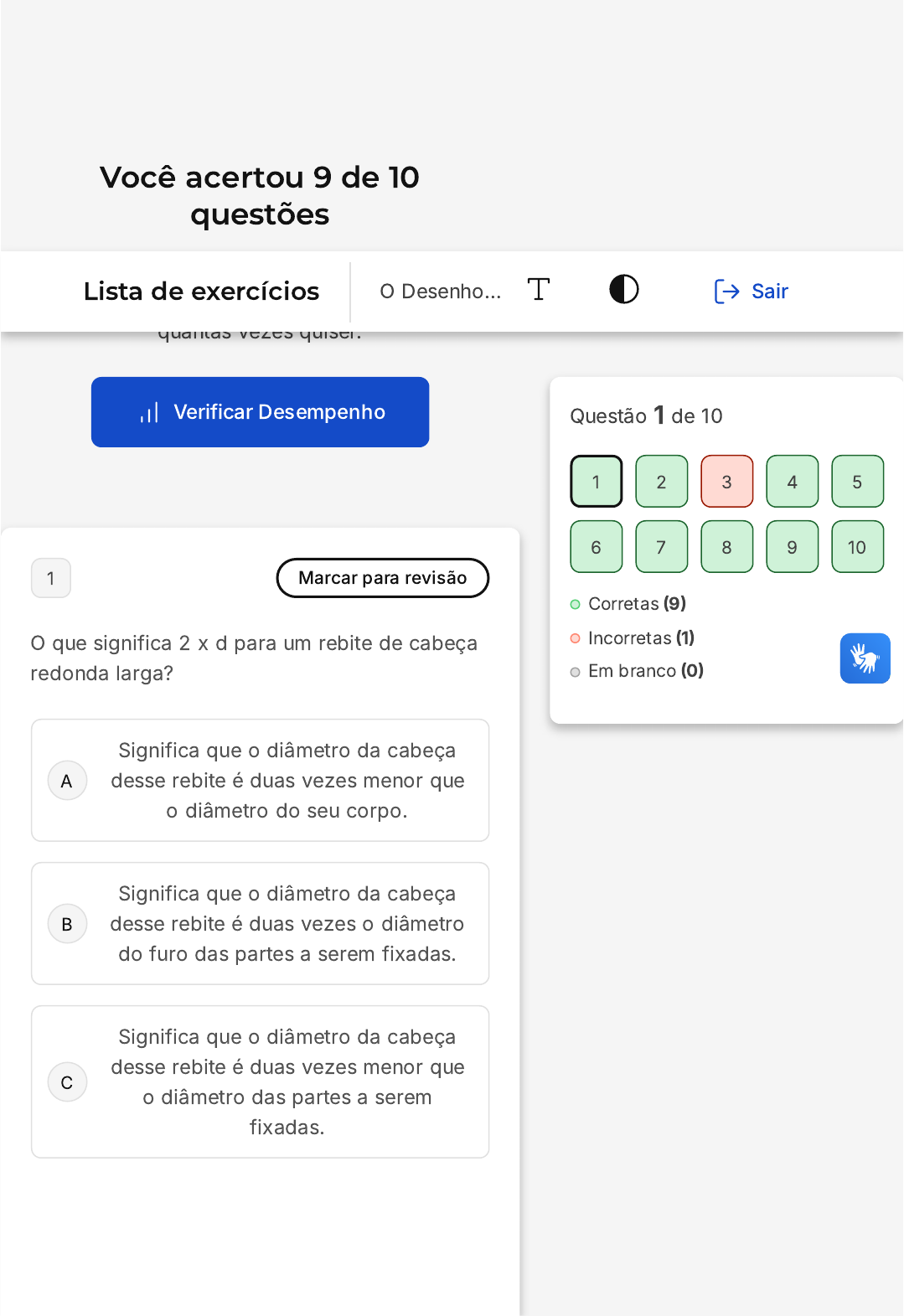 Você acertou 9 de 10 questões Verifique o seu desempenho e continue treinando! Você pode refazer o exercício quantas vezes quiser. Verificar Desempenho A B C 1 Marcar para revisão O que significa 2 x d para um rebite de cabeça redonda larga? Significa que o diâmetro da cabeça desse rebite é duas vezes menor que o diâmetro do seu corpo. Significa que o diâmetro da cabeça desse rebite é duas vezes o diâmetro do furo das partes a serem fixadas. Significa que o diâmetro da cabeça desse rebite é duas vezes menor que o diâmetro das partes a serem fixadas. Questão 1 de 10 Corretas (9) Incorretas (1) Em branco (0) 1 2 3 4 5 6 7 8 9 10 Lista de exercícios O Desenho… Sair D E Significa que o comprimento desse rebite é duas vezes o diâmetro do seu corpo. Significa que o diâmetro da cabeça desse rebite é duas vezes o diâmetro do seu corpo. Resposta correta Parabéns, você selecionou a alternativa correta. Confira o gabarito comentado! Gabarito Comentado O enunciado questiona o que significa a expressão "2 x d" em relação a um rebite de cabeça redonda larga. A alternativa correta é a letra E, que afirma que o diâmetro da cabeça desse rebite é duas vezes o diâmetro do seu corpo. Isso significa que, se o corpo do rebite tiver um diâmetro de 5 mm, por exemplo, o diâmetro da cabeça será de 10 mm, pois 2 x 5 mm = 10 mm. Essa é uma forma padrão de calcular o diâmetro da cabeça dos rebites, sendo aplicável a todos os tipos de rebites, não apenas aos de cabeça redonda larga. 2 Marcar para revisão Qual será a medida, no papel, de uma linha reta que no terreno mede 45m, utilizando a escala 1:450? A B C D E 10 cm 100 cm 1 cm 1 m 10 m Resposta correta Parabéns, você selecionou a alternativa correta. Confira o gabarito comentado! Gabarito Comentado A escala é uma relação de proporção entre as medidas no mapa (ou desenho) e as medidas reais no terreno. Neste caso, a escala é 1:450, o que significa que 1 cm no papel representa 450 cm (ou 4,5 m) no terreno. Para encontrar a medida no papel de uma linha que no terreno mede 45 m, basta dividir 45 m por 4,5 m/cm (a escala em metros por centímetro). Isso resulta em 10 cm. Portanto, uma linha que mede 45 m no terreno será representada por uma linha de 10 cm no papel. 3 Marcar para revisão A B C D E A maioria dos conjuntos mecânicos apresenta elementos de fixação. Onde quer que se usem esses elementos, seja em máquinas ou em veículos automotivos, existe o perigo de se produzir, em virtude das vibrações, um afrouxamento imprevisto no aperto do parafuso. Para evitar esse inconveniente, que tipo de elemento de fixação é utilizado? Arruelas. Cavilhas. Porcas. Pinos. Rebites. Resposta incorreta Opa! A alternativa correta é a letra A. Confira o gabarito comentado! Gabarito Comentado Gabarito: Arruelas. Justificativa: As arruelas têm a função de distribuir igualmente a força de aperto entre a porca, o parafuso e as partes montadas. Em algumas situações, também funcionam como elementos de trava. A B C D E 4 Marcar para revisão Para adquirir os rebites adequados ao seu trabalho, é necessário que você conheça suas especificações, ou seja: De que material é feito; o tipo de sua cabeça; o diâmetro do seu corpo; o comprimento a ser unido. De que material é feito; o tipo de sua cabeça; o diâmetro do seu corpo; o seu comprimento útil. Que material vai unir; o tipo de sua cabeça; o diâmetro do seu corpo; o comprimento a ser unido. Que material vai unir; o tipo de sua cabeça; o diâmetro do furo; o seu comprimento útil. Que material vai unir; o tipo de sua cabeça; o diâmetro do furo; o comprimento a ser unido. Resposta correta Parabéns, você selecionou a alternativa correta. Confira o gabarito comentado! Gabarito Comentado Para escolher os rebites adequados para o trabalho em questão, é essencial conhecer suas especificações. Isso inclui saber de que material o rebite é feito, o tipo de A B C D E cabeça que possui, o diâmetro do seu corpo e o seu comprimento útil. O comprimento útil é uma informação crucial, pois indica a extensão do rebite que será efetivamente utilizada na união dos materiais. Portanto, a alternativa correta é a B: "De que material é feito; o tipo de sua cabeça; o diâmetro do seu corpo; o seu comprimento útil". 5 Marcar para revisão O que significa tolerância de localização de um ponto? Desvio mínimo admissível para a posição de um elemento em relação à sua posição teórica. Desvio médio admissível para a posição de um elemento em relação à sua posição teórica. Desvio máximo admissível para a posição de um elemento em relação à sua posição teórica. Desvio máximo admissível para a posição de um elemento. Desvio mínimo admissível para a posição de um elemento. Resposta correta A B C Parabéns, você selecionou a alternativa correta. Confira o gabarito comentado! Gabarito Comentado O termo "tolerância de localização de um ponto" refere-se ao desvio máximo permitido para a posição de um elemento em relação à sua posição teórica. Isso significa que, em um sistema ou projeto, a localização de um ponto específico pode variar dentro de um limite máximo definido, sem que isso comprometa a funcionalidade ou a integridade do sistema ou projeto. Portanto, a alternativa correta é a "C", que afirma que a tolerância de localização de um ponto é o "desvio máximo admissível para a posição de um elemento em relação à sua posição teórica". 6 Marcar para revisão Que tipo de pino apresenta elevada resistência ao corte e pode ser assentado em furos, com variação de diâmetro considerável? Cônico Elástico Cônico com haste roscada D E Cilíndrico Guia Resposta correta Parabéns, você selecionou a alternativa correta. Confira o gabarito comentado! Gabarito Comentado O pino elástico é o tipo de pino que apresenta elevada resistência ao corte e pode ser assentado em furos com variação de diâ