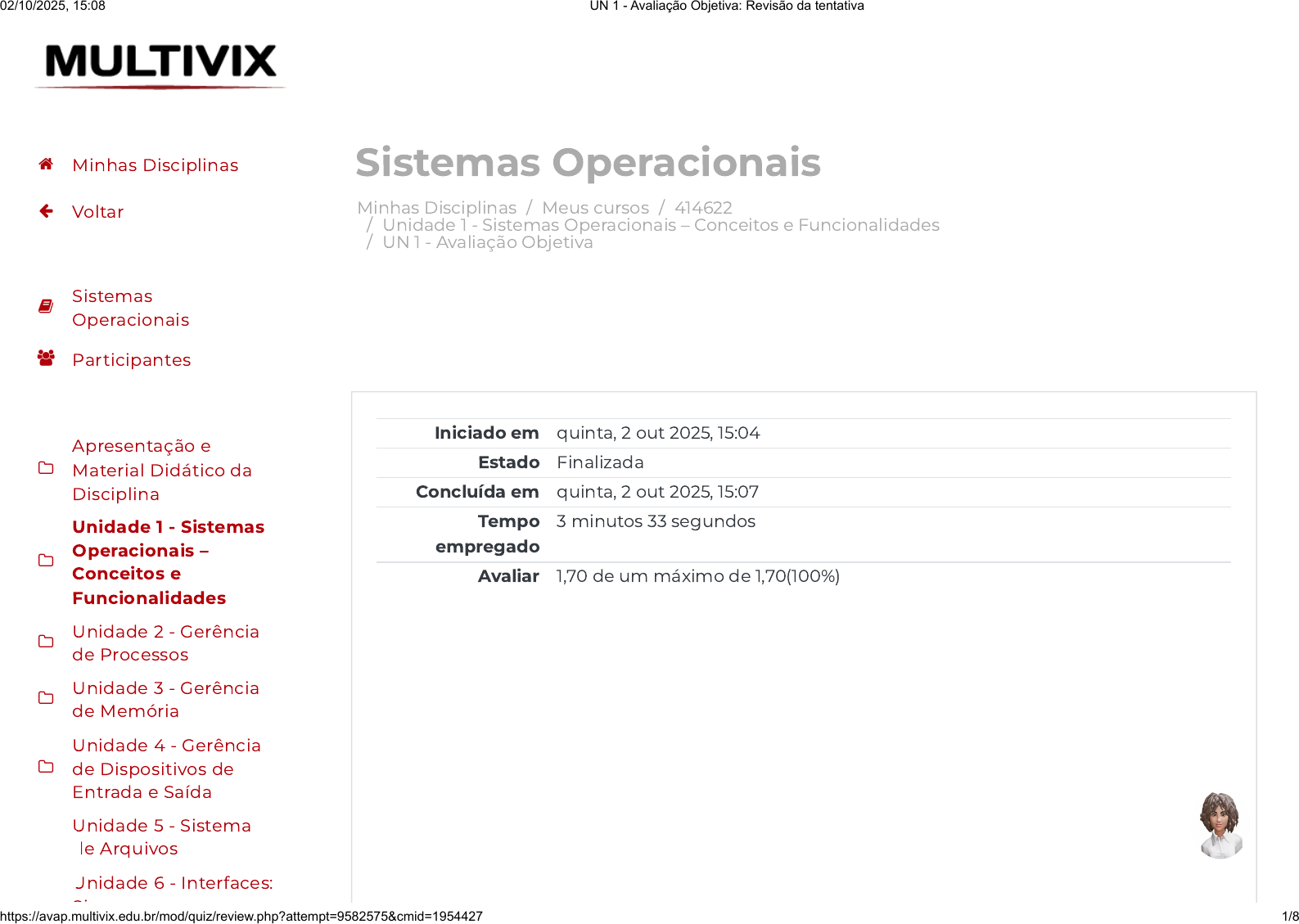 Minhas Disciplinas / Meus cursos / 414622 / Unidade 1 - Sistemas Operacionais – Conceitos e Funcionalidades / UN 1 - Avaliação Objetiva Sistemas Operacionais Iniciado em quinta, 2 out 2025, 15:04 Estado Finalizada Concluída em quinta, 2 out 2025, 15:07 Tempo empregado 3 minutos 33 segundos Avaliar 1,70 de um máximo de 1,70(100%) Minhas Disciplinas Voltar Sistemas Operacionais Participantes Apresentação e Material Didático da Disciplina Unidade 1 - Sistemas Operacionais – Conceitos e Funcionalidades Unidade 2 - Gerência de Processos Unidade 3 - Gerência de Memória Unidade 4 - Gerência de Dispositivos de Entrada e Saída Unidade 5 - Sistema de Arquivos Unidade 6 - Interfaces: Si 02/10/2025, 15:08 UN 1 - Avaliação Objetiva: Revisão da tentativa https://avap.multivix.edu.br/mod/quiz/review.php?attempt=9582575&cmid=1954427 1/8 https://avap.multivix.edu.br/my/ https://avap.multivix.edu.br/course/view.php?id=35963 https://avap.multivix.edu.br/course/view.php?id=35963§ion=2 https://avap.multivix.edu.br/mod/quiz/view.php?id=1954427 https://avap.multivix.edu.br/my/ https://avap.multivix.edu.br/course/view.php?id=35963 https://avap.multivix.edu.br/user/index.php?id=35963 https://avap.multivix.edu.br/course/view.php?id=35963§ion=1 https://avap.multivix.edu.br/course/view.php?id=35963§ion=2 https://avap.multivix.edu.br/course/view.php?id=35963§ion=3 https://avap.multivix.edu.br/course/view.php?id=35963§ion=4 https://avap.multivix.edu.br/course/view.php?id=35963§ion=5 https://avap.multivix.edu.br/course/view.php?id=35963§ion=6 https://avap.multivix.edu.br/course/view.php?id=35963§ion=7 https://avap.multivix.edu.br/ https://avap.multivix.edu.br/ https://avap.multivix.edu.br/ https://avap.multivix.edu.br/ https://avap.multivix.edu.br/ https://avap.multivix.edu.br/ https://avap.multivix.edu.br/ https://avap.multivix.edu.br/ https://avap.multivix.edu.br/ Questão 1 Correto Atingiu 0,34 de 0,34 Analise as afirmativas sobre arquiteturas de sistemas operacionais. I. A arquitetura monolítica dispõe os componentes do sistema operacional interno ao kernel, apresentando-se eficiente com a comunicação entre os componentes de forma direta. Sua desvantagem é a identificação de problemas devido a todos os componentes estarem internos ao núcleo do sistema operacional. II. O sistema Technische Hogeschool Eindhoven (THE) é um exemplo de sistema com arquitetura em camadas. Em tal arquitetura, o sistema é dividido em módulos pequenos de forma escalável, sendo apenas o módulo micronúcleo executado como um núcleo, ou seja, um kernel. Por esse fato, a arquitetura em camadas se difere da arquitetura micronúcleo. III. Na arquitetura em camadas de um sistema operacional, os componentes são agrupados por tarefas parecidas. Uma camada fornece serviços à camada superior e faz comunicação com as adjacentes, tanto superiores como inferiores. Assinale qual alternativa apresenta a(s) afirmativa(s) verdadeira(s). Escolha uma opção: a. I e II e III. b. II e III. c. I e III. d. II. Minhas Disciplinas Voltar Sistemas Operacionais Participantes Apresentação e Material Didático da Disciplina Unidade 1 - Sistemas Operacionais – Conceitos e Funcionalidades Unidade 2 - Gerência de Processos Unidade 3 - Gerência de Memória Unidade 4 - Gerência de Dispositivos de Entrada e Saída Unidade 5 - Sistema de Arquivos Unidade 6 - Interfaces: Si 02/10/2025, 15:08 UN 1 - Avaliação Objetiva: Revisão da tentativa https://avap.multivix.edu.br/mod/quiz/review.php?attempt=9582575&cmid=1954427 2/8 https://avap.multivix.edu.br/my/ https://avap.multivix.edu.br/course/view.php?id=35963 https://avap.multivix.edu.br/user/index.php?id=35963 https://avap.multivix.edu.br/course/view.php?id=35963§ion=1 https://avap.multivix.edu.br/course/view.php?id=35963§ion=2 https://avap.multivix.edu.br/course/view.php?id=35963§ion=3 https://avap.multivix.edu.br/course/view.php?id=35963§ion=4 https://avap.multivix.edu.br/course/view.php?id=35963§ion=5 https://avap.multivix.edu.br/course/view.php?id=35963§ion=6 https://avap.multivix.edu.br/course/view.php?id=35963§ion=7 https://avap.multivix.edu.br/ https://avap.multivix.edu.br/ https://avap.multivix.edu.br/ https://avap.multivix.edu.br/ https://avap.multivix.edu.br/ https://avap.multivix.edu.br/ https://avap.multivix.edu.br/ https://avap.multivix.edu.br/ https://avap.multivix.edu.br/ e. I e II. Minhas Disciplinas Voltar Sistemas Operacionais Participantes Apresentação e Material Didático da Disciplina Unidade 1 - Sistemas Operacionais – Conceitos e Funcionalidades Unidade 2 - Gerência de Processos Unidade 3 - Gerência de Memória Unidade 4 - Gerência de Dispositivos de Entrada e Saída Unidade 5 - Sistema de Arquivos Unidade 6 - Interfaces: Si 02/10/2025, 15:08 UN 1 - Avaliação Objetiva: Revisão da tentativa https://avap.multivix.edu.br/mod/quiz/review.php?attempt=9582575&cmid=1954427 3/8 https://avap.multivix.edu.br/my/ https://avap.multivix.edu.br/course/view.php?id=35963 https://avap.multivix.edu.br/user/index.php?id=35963 https://avap.multivix.edu.br/course/view.php?id=35963§ion=1 https://avap.multivix.edu.br/course/view.php?id=35963§ion=2 https://avap.multivix.edu.br/course/view.php?id=35963§ion=3 https://avap.multivix.edu.br/course/view.php?id=35963§ion=4 https://avap.multivix.edu.br/course/view.php?id=35963§ion=5 https://avap.multivix.edu.br/course/view.php?id=35963§ion=6 https://avap.multivix.edu.br/course/view.php?id=35963§ion=7 https://avap.multivix.edu.br/ https://avap.multivix.edu.br/ https://avap.multivix.edu.br/ https://avap.multivix.edu.br/ https://avap.multivix.edu.br/ https://avap.multivix.edu.br/ https://avap.multivix.edu.br/ https://avap.multivix.edu.br/ https://avap.multivix.edu.br/ Questão 2 Correto Atingiu 0,34 de 0,34 Analise as afirmativas abaixo, em relação a arquiteturas, histórico e linguagens de baixo nível de sistemas operacionais. I. São arquiteturas de um sistema operacional: em camadas, tempo real e monolític