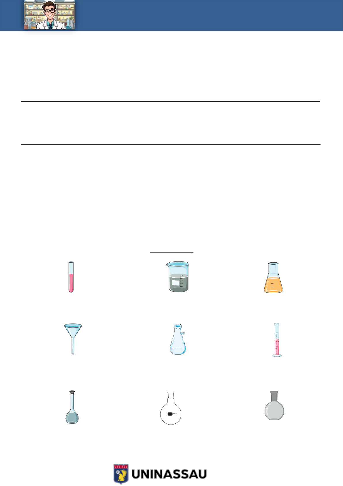 Vidrarias, equipamentose técnicas básicas de laboratório OBJETIVOS ➢ Identificar as principais vidrarias e equipamentos usados no laboratório de química. ➢ Apresentar técnicas básicas usadas no laboratório de química. Antes de iniciar qualquer experimento em um laboratório químico, é importante familiarizar- se com os equipamentos disponíveis, conhecer seu funcionamento, indicação de uso e a maneira correta de manuseá-lo. A grande maioria dos equipamentos utilizados nos laboratórios é de vidro, portanto é necessário muito cuidado ao manuseá-los. Estes podem ser de vidro comum, borossilicato (pirex) ou de quartzo fundido. As vidrarias volumétricas, como bureta, pipeta volumétrica e pipeta graduada, são calibradas e portanto não devem ser aquecidas. A seguir apresentaremos alguns equipamentos básicos utilizados rotineiramente em laboratórios de química e suas funções. VIDRARIAS Tubo de ensaio: execução de reações químicas em pequena escala Béquer: dissolução de sólidos e aquecimento de líquidos. Erlenmeyer: aquecimento de líquidos e titulações. Funil comum: filtração simples, com o auxílio de um papel de filtro e transferência de líquidos. Kitassato: filtração a pressão reduzida (ou filtração a vácuo) Proveta: medida volumes de líquidos sem grande precisão. Balão volumétrico: preparo de soluções com volumes precisos e prefixados. Balão de fundo redondo: sistemas de destilação, refluxo e evaporação a vácuo. Balão de fundo chato: aquecimento de líquidos em sistemas de destilação. AULA2 Prof° Me. Lucas Mantovanelli UTENSÍLOS DE PORCELANA Funil de Büchner: utilizado em filtrações a vácuo em conjunto com o kitassato. Cadinho: aquecimento de sólidos a altas temperaturas, calcinações. Pode também ser constituído de metal. Almofariz e pistilo: trituração e homogeneização de materiais de sólidos. Pode também ser constituído de ágata. Cápsula: evaporação de líquidos. Pode ser aquecida na chama. Vidro de relógio: pesagem, secagem de sólidos e cobertura de cápsula de porcelana ou béquer. Dessecador: utilizado para guardar substâncias em atmosfera com baixa umidade com auxílio de um agente de secagem (dessecante). Funil de separação ou decantação (funil de bromo): separação e extração líquido- líquido. Pipeta graduada: medida de volumes variáveis de líquidos com boa precisão dentro de uma determinada escala. Pipeta volumétrica: medidas precisas de volume fixo de líquidos. 0 10 20 30 40 50 Bureta: utilizada em titulações na medida precisa de volume de líquidos através do escoamento controlado do líquido. Condensador: condensação de vapores produzidos no processo de destilação ou aquecimento sob refluxo. Existem condensadores de tubo reto (Liebig), de bolas e de serpentina. Bastão de vidro/baqueta: agitação de soluções e de líquidos e no auxílio para transferência de líquidos de um recipiente para outro. Placa de Petri: secagem de substâncias e cultura de microrganismos. Prof° Me. Lucas Mantovanelli UTENSÍLOS GERAIS Garra metálica Suporte universal Suporte universal: utilizado para dar sustentação aos materiais de laboratório. Garra metálica: fixação de vidrarias. Argola ou anel: suporte de funil de vidro em montagens de filtração, decantação, etc. Mufa: fixação de garras metálicas ao suporte universal. Tripé: sustentação à tela de amianto ou ao triângulo de porcelana. Tela de amianto: utilizada para distribuir uniformemente o calor recebido da chama do bico de Bunsen para todo o recipiente. Pisseta ou frasco lavador: lavagem de diversos materiais. Em geral, contém água destilada, mas outros solventes podem também ser armazenados. Pinça metálica: utilizado para segurar objetos aquecidos. Espátula: usada na transferência de substâncias sólidas. Suporte para tubos de ensaio: sustentação de tubos de ensaio na posição vertical. Pinça de madeira: utilizada para segurar tubos de ensaio. Trompa de vácuo: utilizada para reduzir a pressão no interior de um frasco, principalmente durante a filtração sob pressão reduzida. Pipetador de borracha ou pêra: utilizado para encher pipetas por sucção. Prof° Me. Lucas Mantovanelli EQUIPAMENTOS Figura 1: O bico de Bunsen e as zonas da chama Agitador magnético: agitação de líquidos com auxílio de uma barra magnética movida por um campo magnético rotativo. Manta aquecedora: aquecimento de líquidos inflamáveis contidos em um balão de fundo redondo. 0.00 Balança: utilizada para pesagem. Deve estar nivelada e ter manutenção e calibração periódica. Centrífuga: separação de misturas imiscíveis do tipo sólido-líquido, quando o sólido se encontra disperso no líquido. Estufa: secagem de materiais em geral, principalmente vidrarias. Capela: Utilizada para manusear substâncias gasosas, tóxicas, irritantes, etc. Bomba de vácuo: redução da pressão no interior de um recipiente. Bico de Bunsen: aquecimento de materiais não inflamáveis Anel de regulagem de entrada de ar O BICO DE BUNSEN O bico de Bunsen, figura 1, utiliza como combustível o gás liquefeito de petróleo (GLP) que é uma mistura de hidrocarbonetos e como comburente o gás oxigênio do ar atmosférico. Possui na sua base um regulador de entrada de ar, quando a chama é amarela, a combustão é incompleta e a chama apresenta temperatura relativamente baixa. Com o aumento da entrada de ar a chama torna-se azul, mais quente e forma um cone interior distinto, mais frio. Zona oxidante Válvula de controle do gás entrada do gás região mais quente 1540 oC região mais fria 300 a 530 oC Zona redutora Prof° Me. Lucas Mantovanelli Zona redutora: é uma zona intermediária, luminosa e forma um pequeno "cone", onde se inicia a combustão dos gaes. Nesta zona forma-se monóxido de carbono, que se decompõe por ação do calor dando origem a pequenas partículas de carbono, que, sendo incandescentes, dão luminosidade à chama 