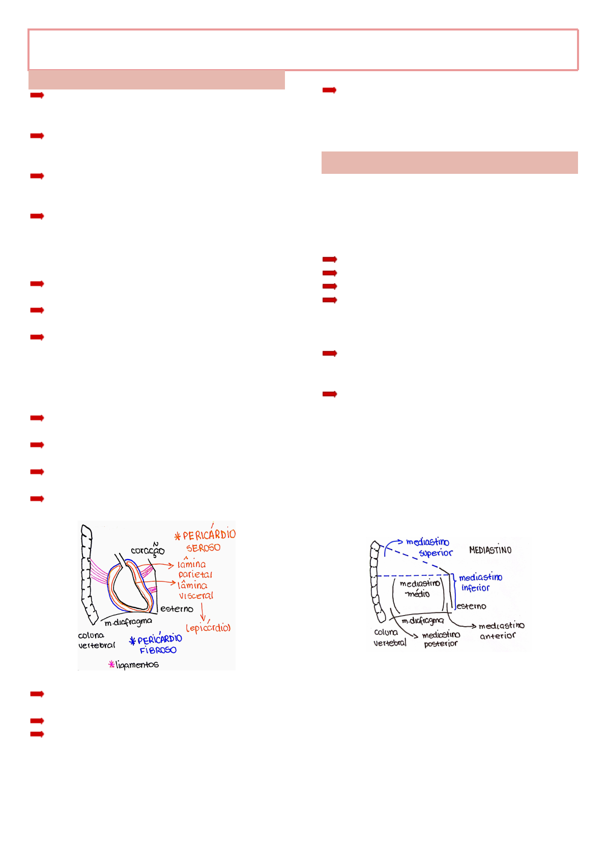 ANATOMIA DO CORAÇÃO PERICÁRDIO Saco fibro-seroso que envolve o coração, separando-o dos outros órgãos do mediastino e limitando sua expansão durante a sístole ventricular Consiste de uma camada externa fibrosa, pericárdio fibroso, e uma camada interna serosa, pericárdio seroso O pericárdio seroso apresenta lâmina parietal que está aderente ao pericárdio fibroso e uma lâmina visceral (epicárdio) aderente ao miocárdio Entre as duas lâminas do pericárdio seroso existe uma cavidade virtual (cavidade do pericárdio), ocupada por uma camada líquida de espessura capilar, que permite o deslizamento de uma lâmina contra a outra durante as mudanças de volume do coração O seio oblíquo e o seio transverso são recessos da cavidade pericárdica Esse recesso é uma extensão ou evaginação da cavidade pericárdica Recesso de líquido no seio oblíquo: utilizado em exames de imagem para detectar derrames pleurais Ligamentos O pericárdio contribui na manutenção da posição do coração através de alguns componentes: Ligamento esternopericárdico: prende o pericárdio ao esterno Ligamento pericárdio vertebral: prende o pericárdio a coluna vertebral Ligamento pericárdio frênico: prende o pericárdio ao diafragma Grandes vasos da base: esses vasos estão ligados firmemente a estruturas vizinhas Nervo frênico Desce em direção ao diafragma, entre a pleura e o contorno lateral do pericárdio fibroso Inerva o diafragma, um dos músculos da respiração Efeito chicote: pode causar uma lesão no nervo frênico e a morte do indivíduo por asfixia, já que esse nervo inerva o músculo diafragma que participa da respiração Tamponamento cardíaco Acúmulo de sangue na cavidade pericárdica, o que prejudica o funcionamento do coração, uma vez que o pericárdio fibroso é composto por feixes colágenos e não é muito elástico LOCALIZAÇÃO DO CORAÇÃO O coração está localizado no mediastino médio, um espaço entre as pleuras. Ele repousa sobre o diafragma, situa-se posteriormente ao esterno e tem dos seus lados os pulmões e a pleura Limites do mediastino Limite superior: abertura superior do tórax Limite interior: diafragma Limite anterior: esterno Limite posterior: coluna vertebral Um traçado do ângulo esternal até a T4 divide o mediastino em dois andares: Andar superior do mediastino (mediastino superior): seus principais componentes são esôfago e grandes vasos da base Andar inferior do mediastino (mediastino inferior): subdividido em 3 regiões 1. Mediastino médio: seus componentes são o coração e o pericárdio 2. Mediastino posterior: separa o coração da coluna vertebral e seus componentes são o esofago e a artéria aorta descendente 3. Mediastino anterior: seu componente é o órgão timo (localizado no mediastino anterior e no superior) Como o esôfago passa pelo mediastino posterior, algumas situações podem prejudicar o coração, como alguns casos em que o indivíduo engoliu um espinho de peixe e teve o coração lesionado, devido a íntima relação entre o mediastino posterior e o mediastino médio. Já algumas patologias no coração podem interferir na deglutição, como a doença de chagas e a cardiomegalia que podem comprimir o esôfago Lívia Francisco T28 Posição anatômica do coração Face anterior ou esternocostal: abaulada Face inferior ou diafragmática: repousa sobre o diafragma (após a morte do indivíduo a face diafragmática se torna plana) Eixo longitudinal: vai da base até o ápice Eixo transversal: está sobre a base Base do coração Todos os vasos que estão chegando ou partindo do coração estão na base e são denominados “grandes vasos da base” É voltada para cima, para direita e para trás Ápice do coração É uma extremidade pontiaguda Corresponde a extremidade do ventrículo esquerdo O ápice é voltado para esquerda, inclinado para frente e está para baixo Átrios e ventrículos A parede dos átrios são mais finas que as paredes dos ventrículos A pressão que o sangue chega nos átrios e a ação da gravidade na inclinação do ápice para baixo, contribui para que o sangue “escorra” para os ventrículos, de modo que a força necessária para que isso ocorra é pequena (não é necessário uma massa muscular bem desenvolvida) Já as paredes dos ventrículos são espessas e com massa muscular bem desenvolvida, já que é preciso força para a contração e o transporte do sangue para a artéria Sulco coronário Circunda o coração em forma de uma coroa entre os átrios e os ventrículos É interrompido pelo vaso tronco pulmonar (face esternocostal) Seio coronário: localizado no sulco coronário Cavidade pleuropulmonar Espaço ocupado pelo pulmão e pela pleura O pulmão é revestido pela pleura pulmonar, um saco seroso completamente fechado, composto pela lâmina visceral da pleura e pela lâmina parietal da pleura, as quais delimitam a cavidade pleural Entre as lâminas existe a cavidade pleural, um espaço virtual Entre as lâminas visceral e parietal existe uma fina camada de líquido, a qual diminui diretamente o atrito entre essas lâminas e indiretamente o atrito entre o pulmão e a parede do tórax Derrame pleural O líquido do parênquima pulmonar pode se alojar na cavidade pleural, de modo que ela deixe de ser um espaço virtual e passe a ser um espaço real REGIÃO PRECORDIAL (PRECÓRDIO) Região da parede do tórax onde se projeta o coração Limites: Margem superior do precórdio: corresponde a região dos grandes vasos da base Margem inferior do precórdio: corresponde à margem do ventrículo direito Margem lateral direita do precórdio: corresponde ao átrio direito no coração Margem lateral esquerda do precórdio: corresponde à margem do ventrículo esquerdo e ao ápice do coração (Ictus Cordis: onde está o ápice do coração) Tiro à bala na região precordial Já é possível definir qual área do coração provavelmente foi afetada, já que o precórdio é a projeção do